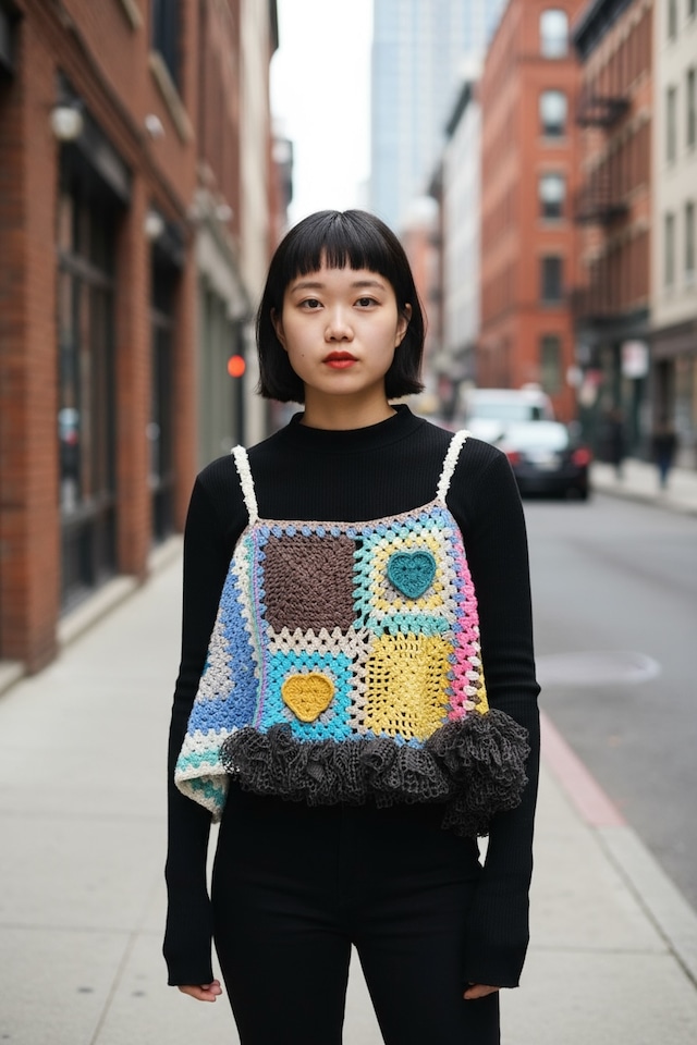 Crochet Bustier with Heart & Granny Squares | Y2K & Fairycore ネオンピンクのハートとグラニースクエアのビスチェ