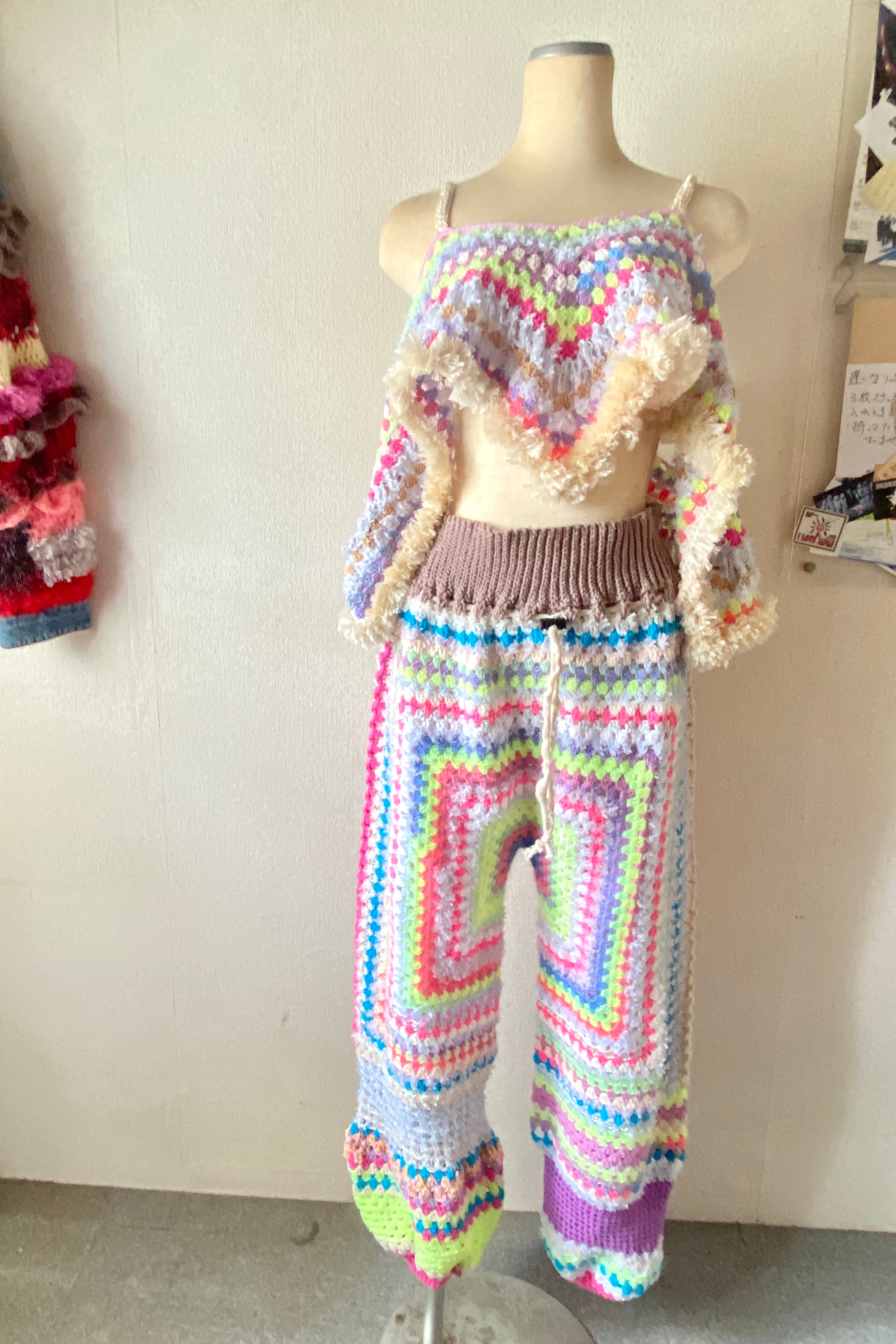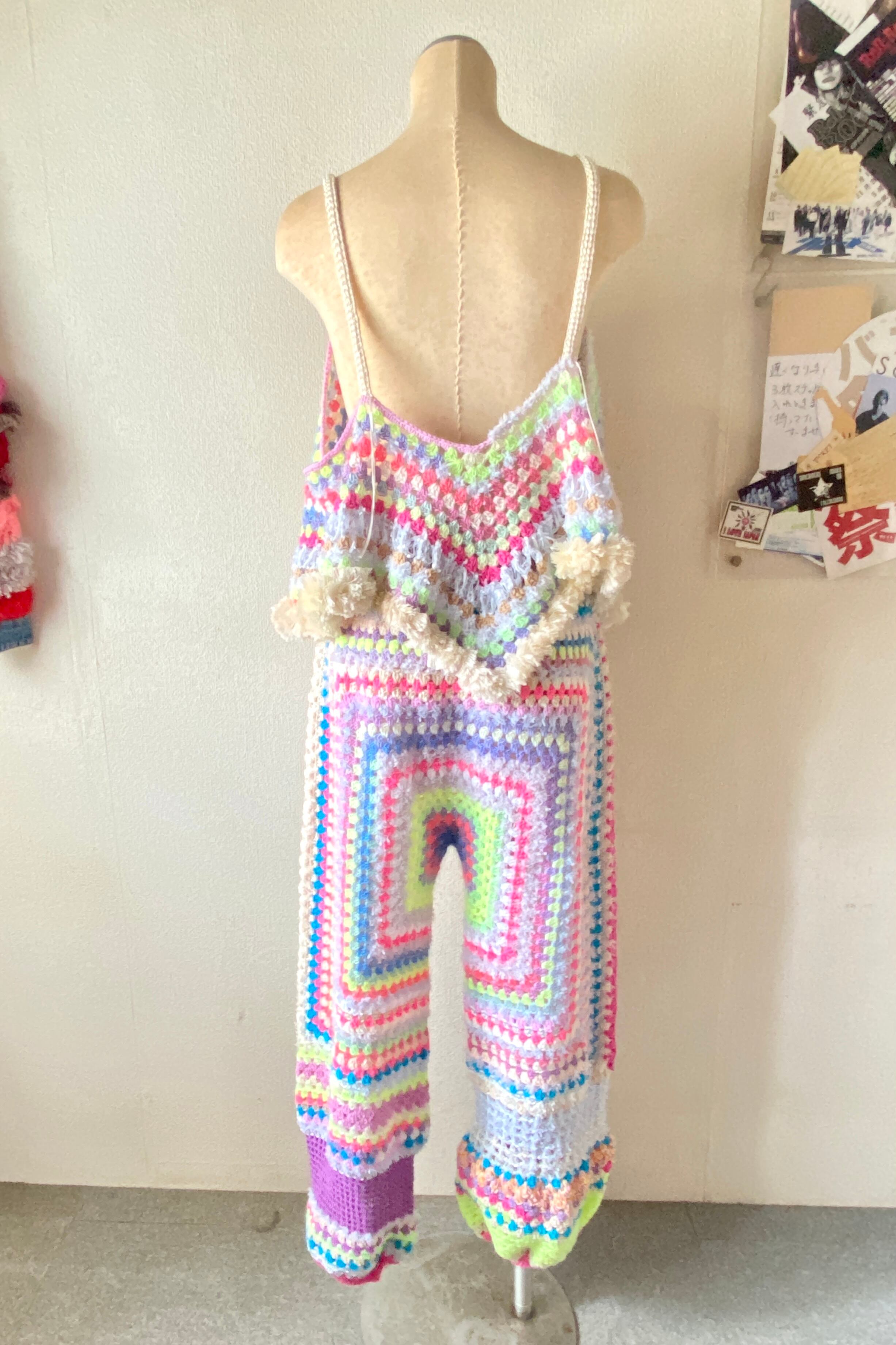 八角形のグラニーモチーフを編み広げて仕上げた手編みのパンツです