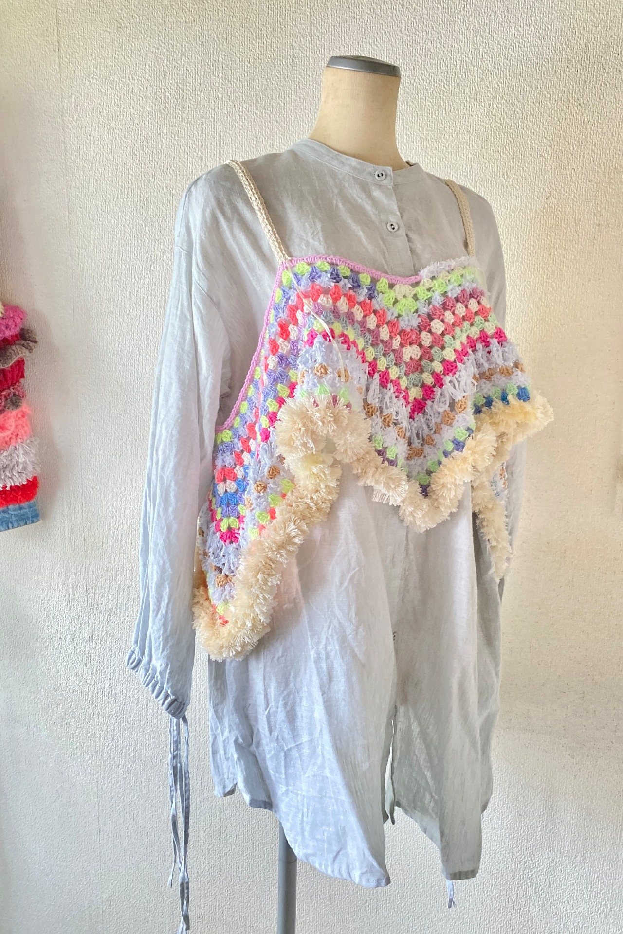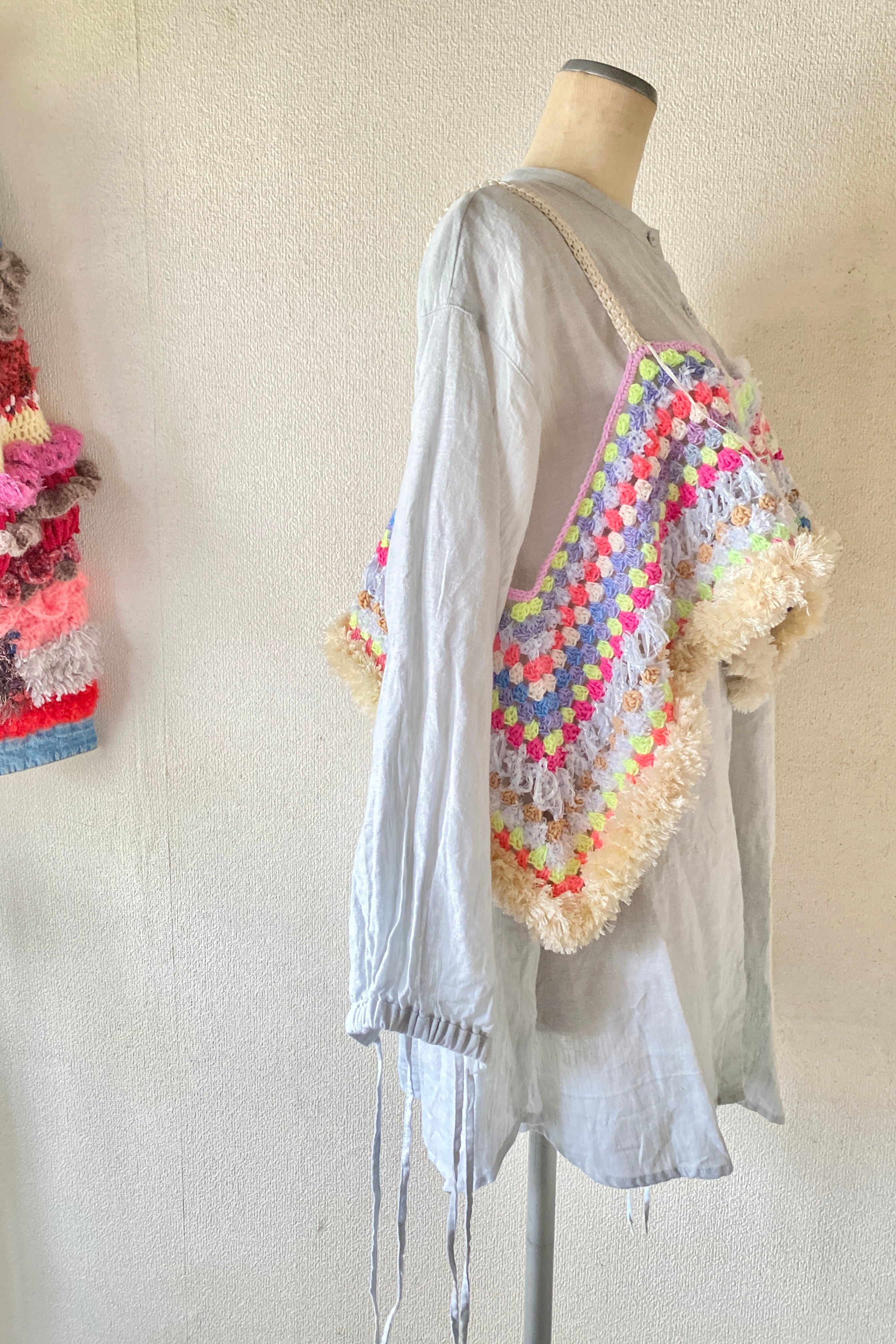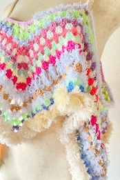トルコ生まれのネオンカラーが鮮やかな糸をメイン素材にして、パステル〜ビビッドカラーをランダムに組み合わせたグラニーモチーフを、胸元からふんわり広がる個性的なシルエットに仕上げました。