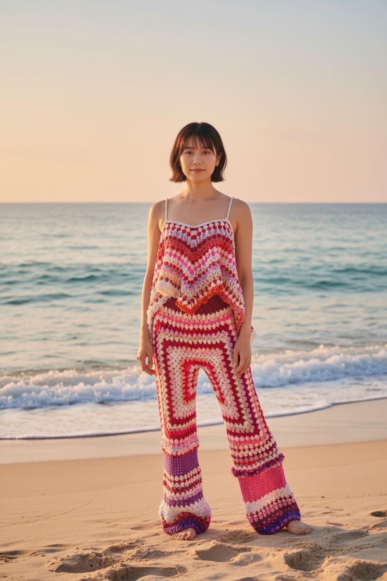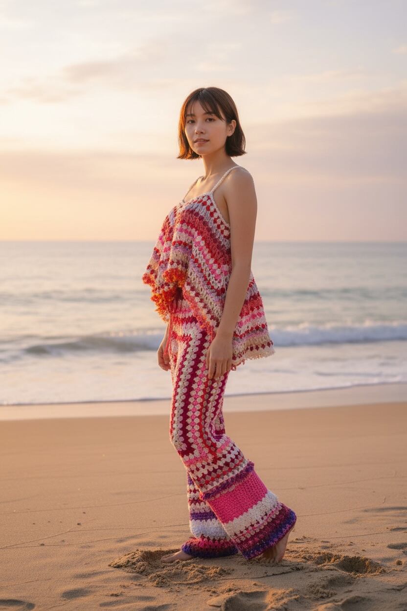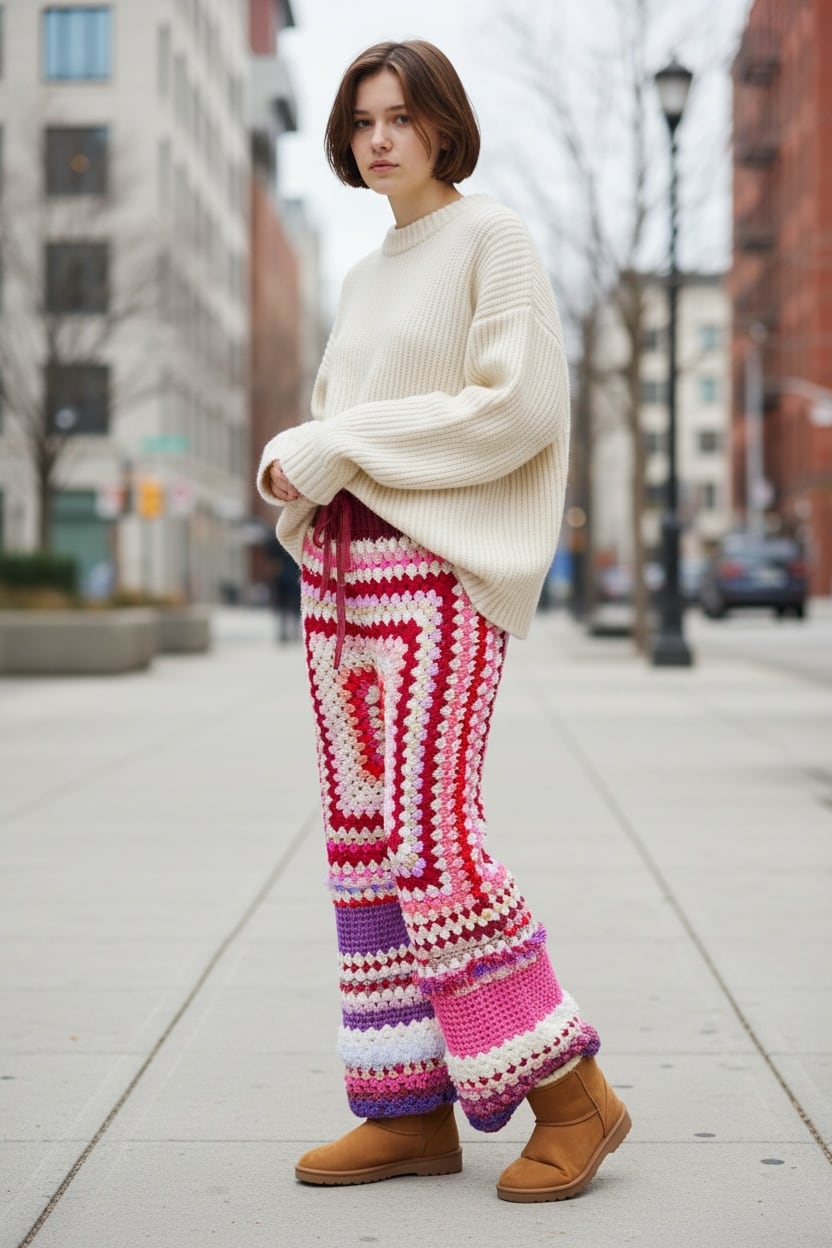 カラフルな毛糸を組み合わせて、ひと針ひと針丁寧に編み上げた完全ハンドメイドのクロシェパンツです