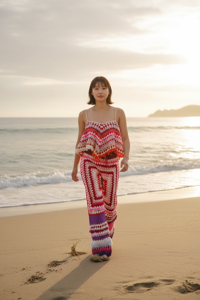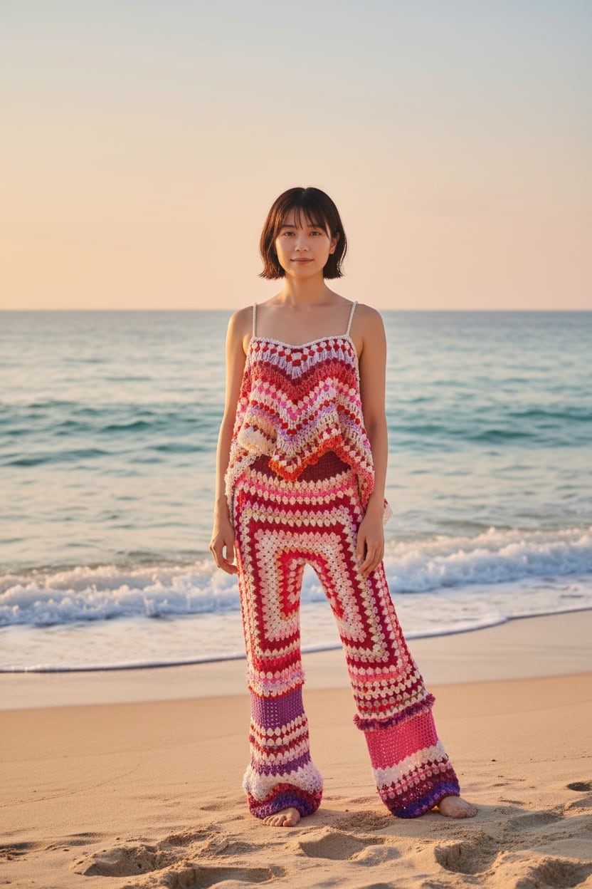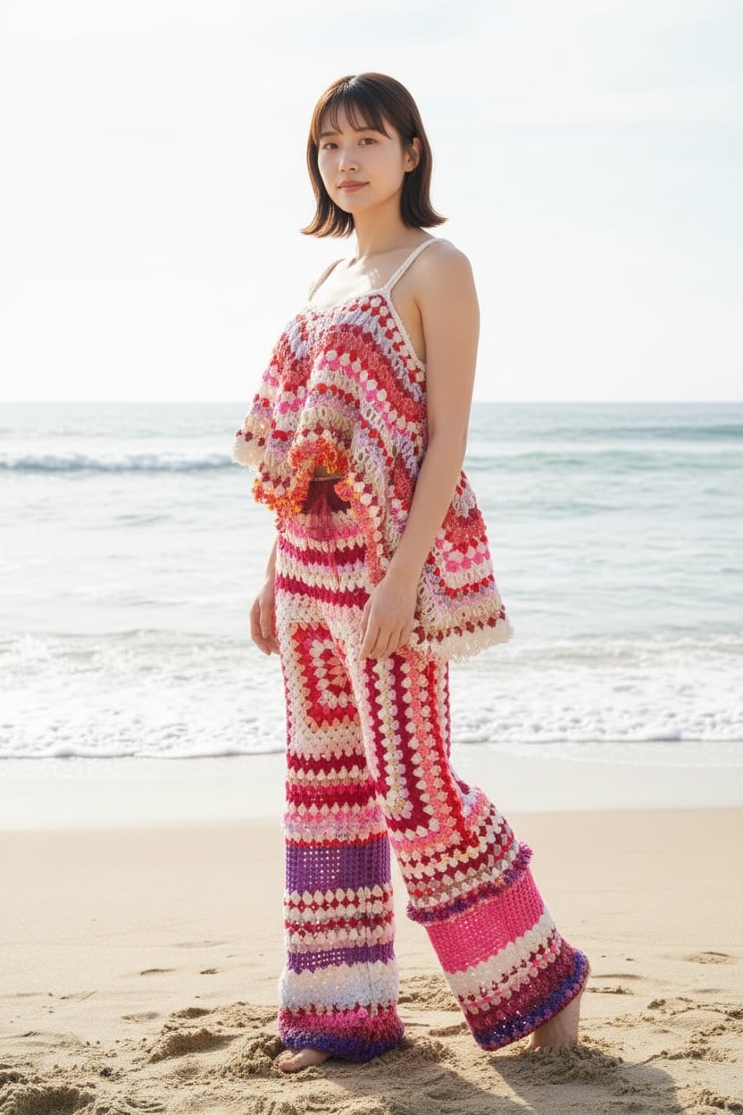 通常よく見られる四角いグラニーモチーフとは違うオクタゴングラニーモチーフで仕立てたシームレスなクロシェパンツは、レトロな雰囲気と鮮やかな色合いで、穿くだけで気分も明るくなる1着。