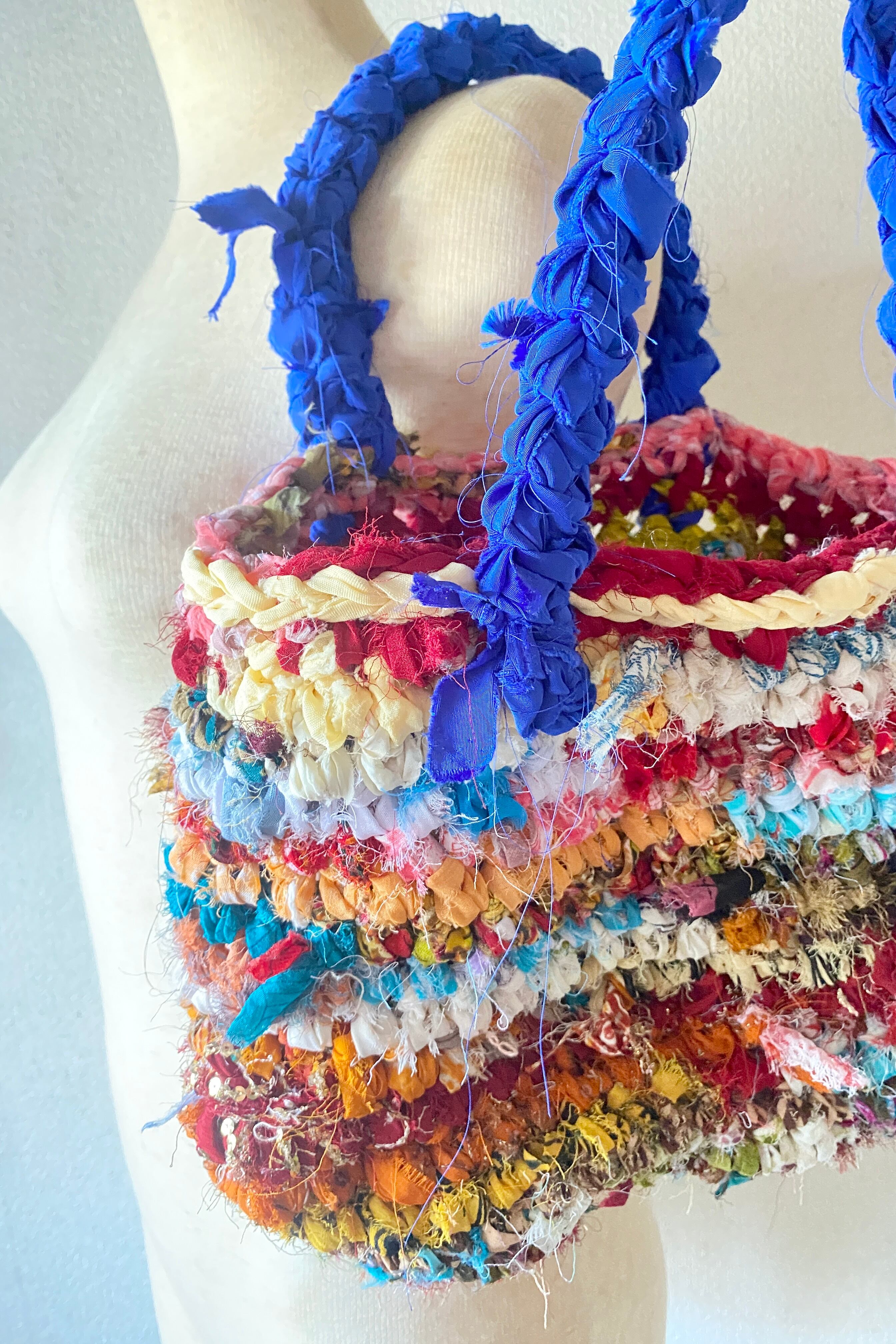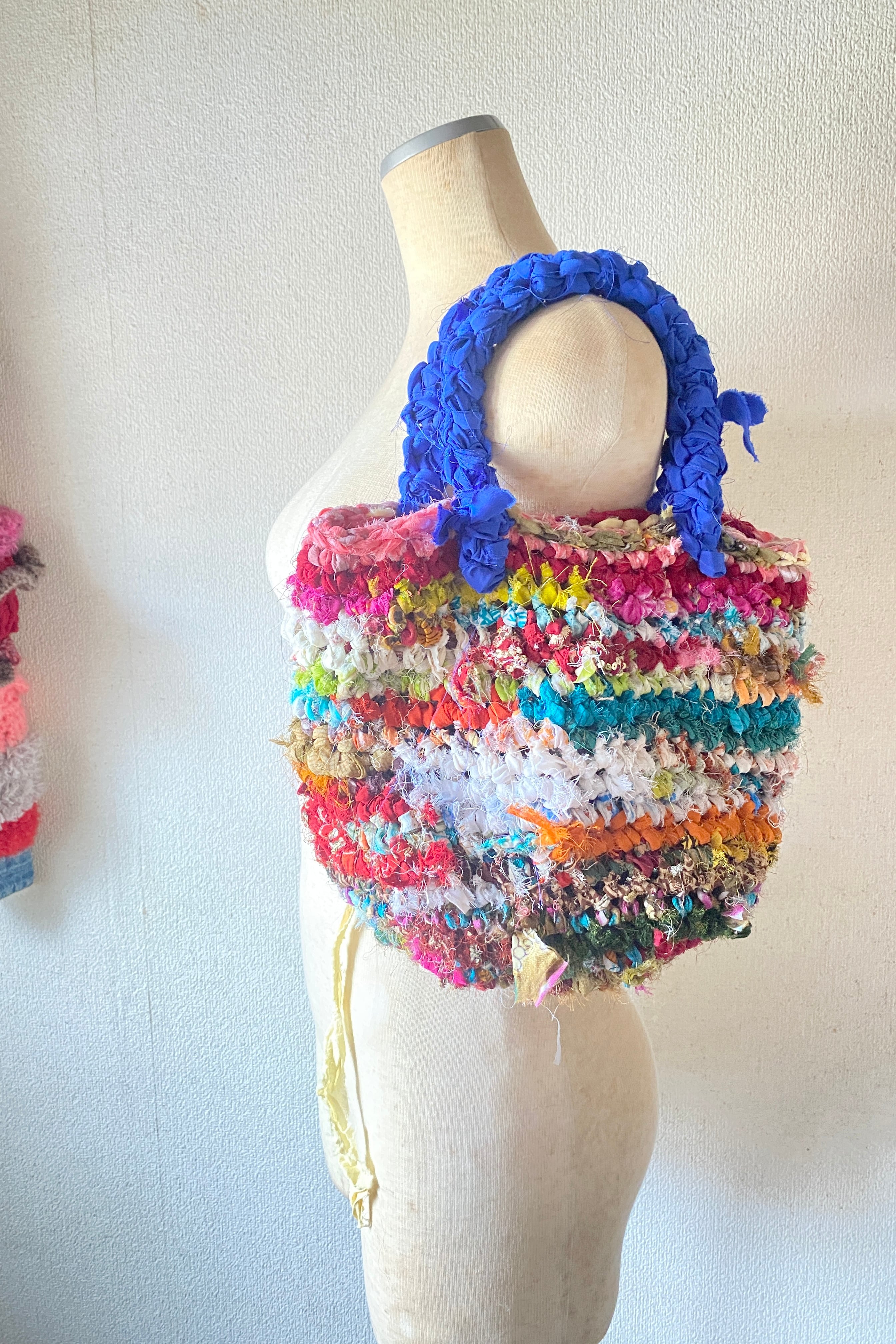 アップサイクル素材を使用した裂き編みのバッグです