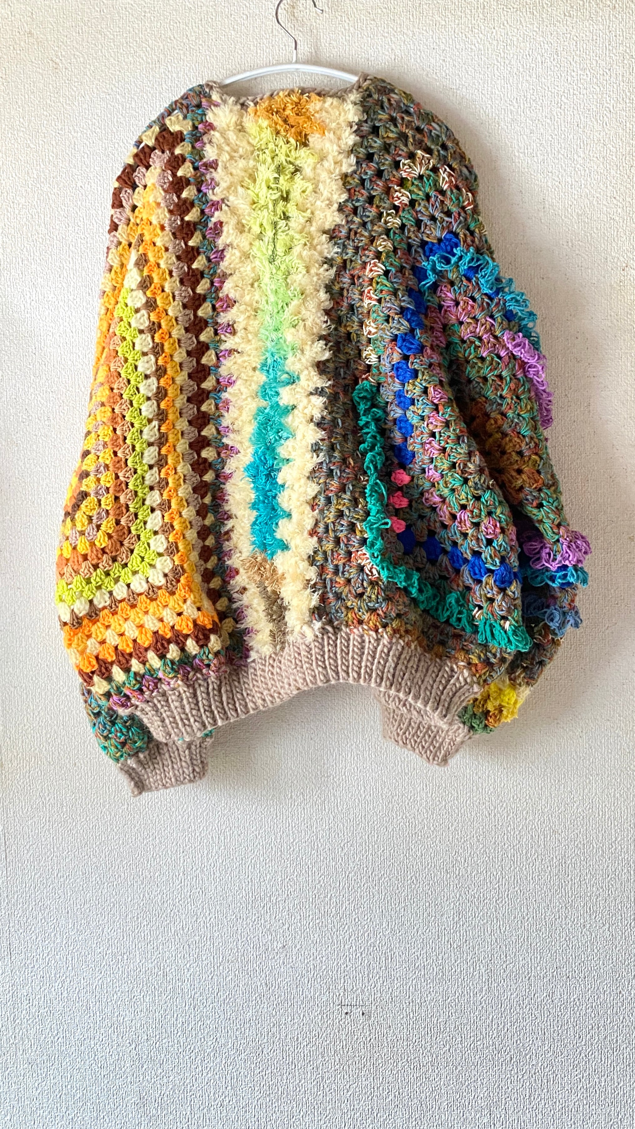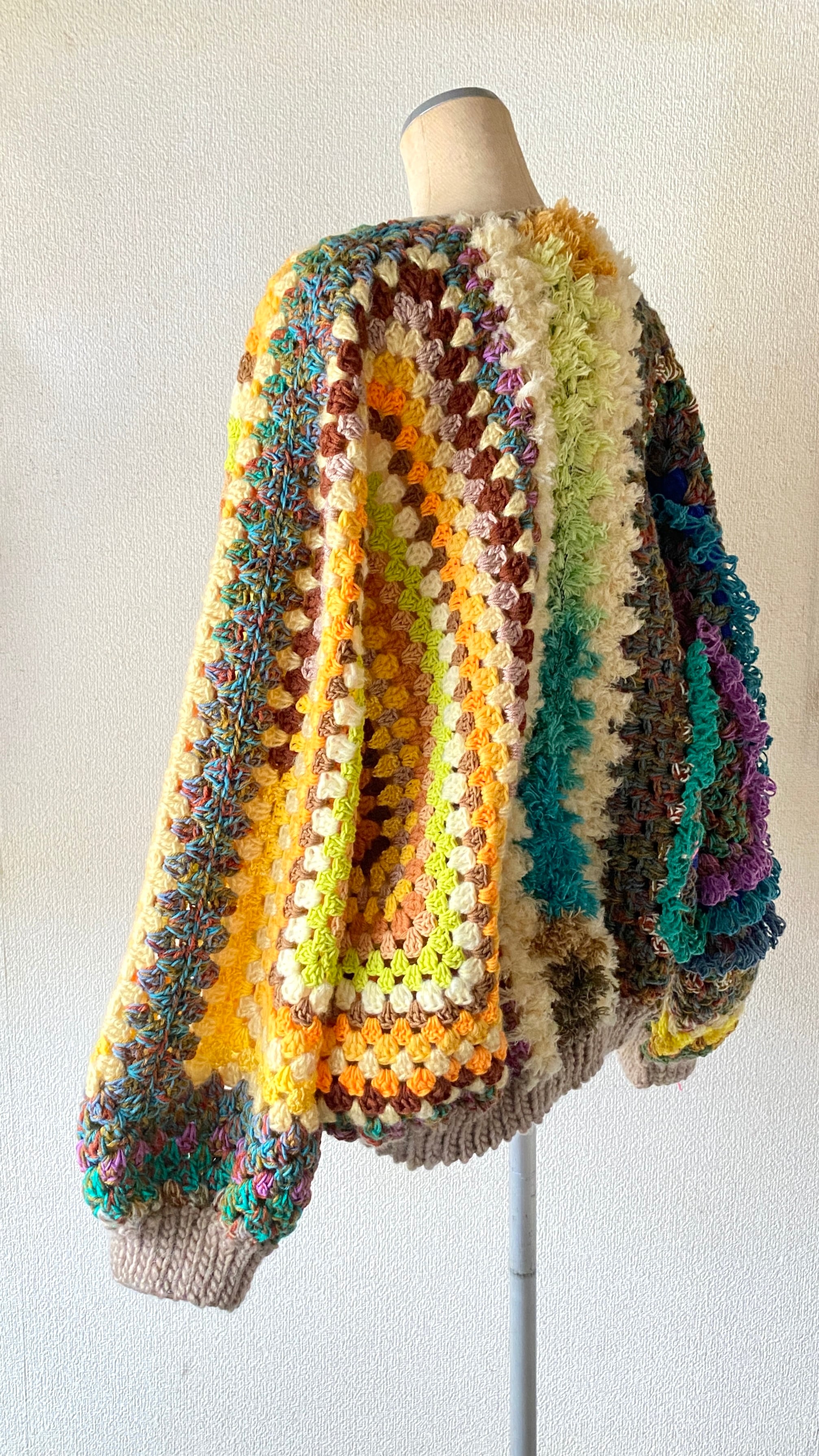 そして、クリアな発色の黄色をメインに編んだグラニーヘキサゴンモチーフを左見頃に配置