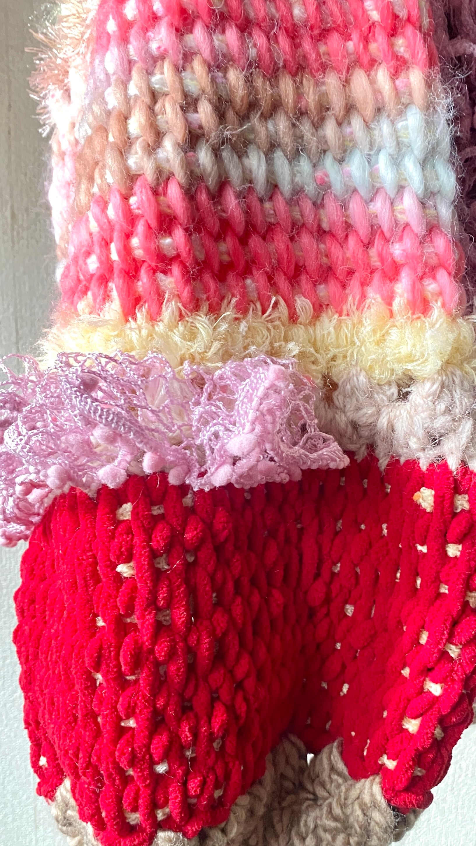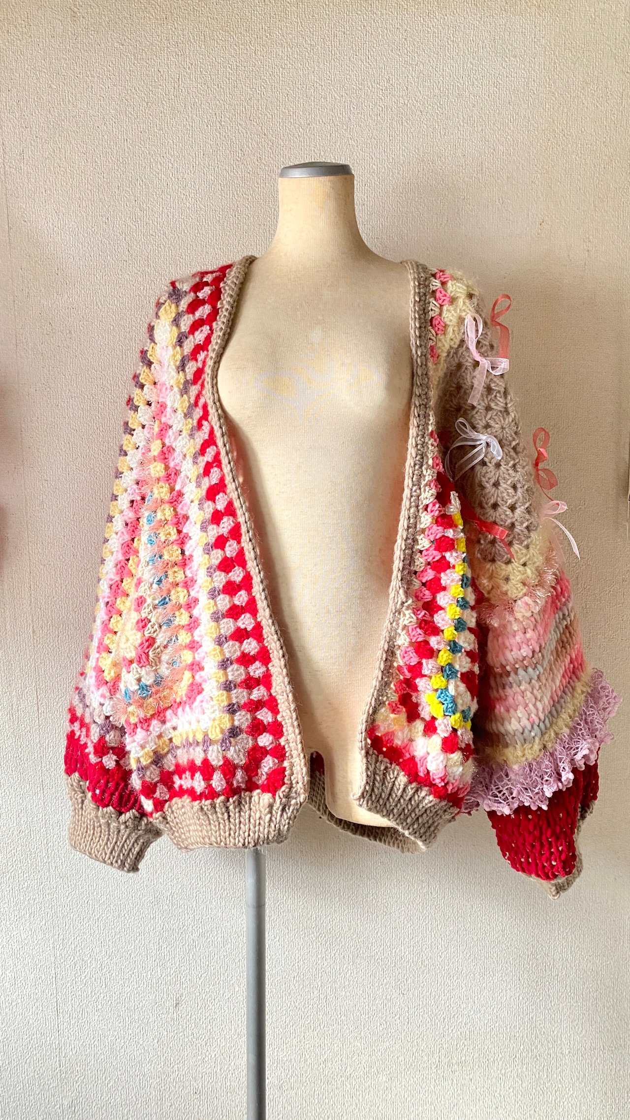 A hand-knitted asymmetrical cardigan with a granny hexagon and granny square motif in a cute, Harajuku-esque color scheme. ヘキサゴングラニーカーディガン いちごショートケーキ配色