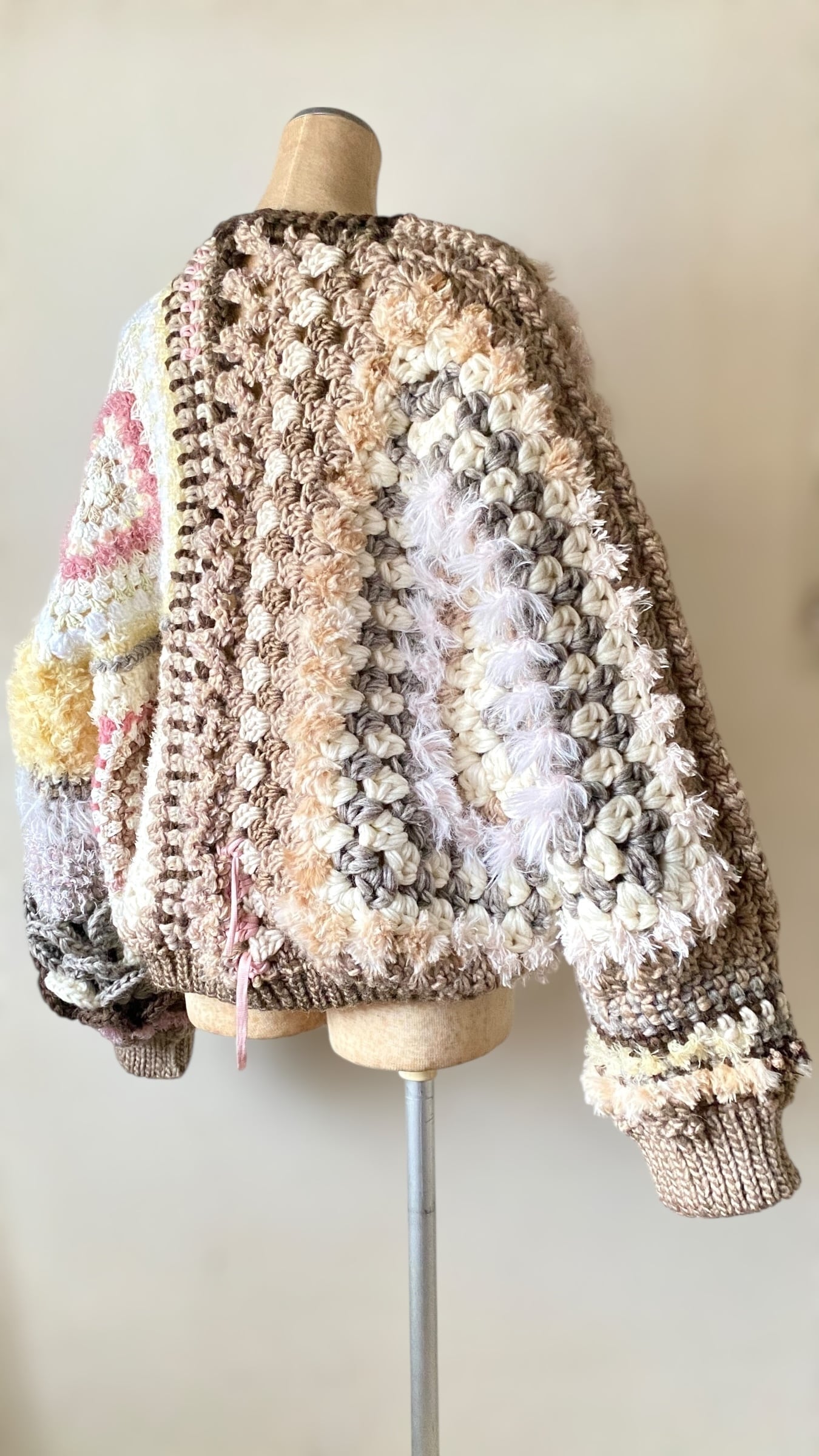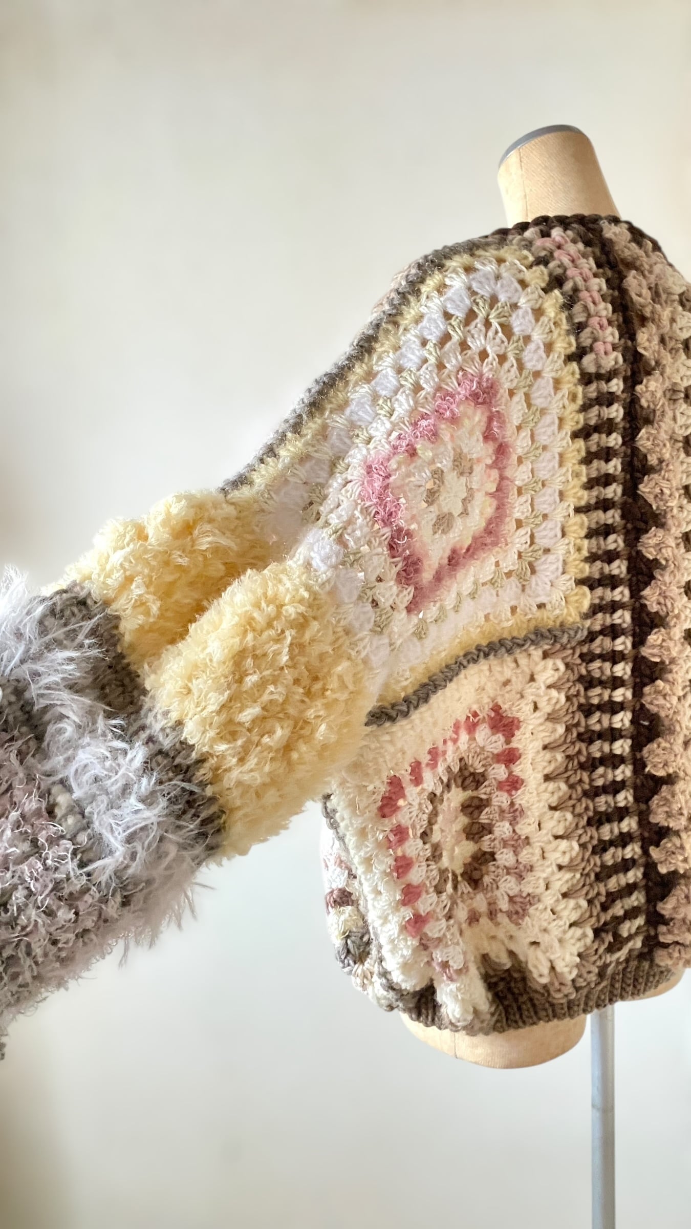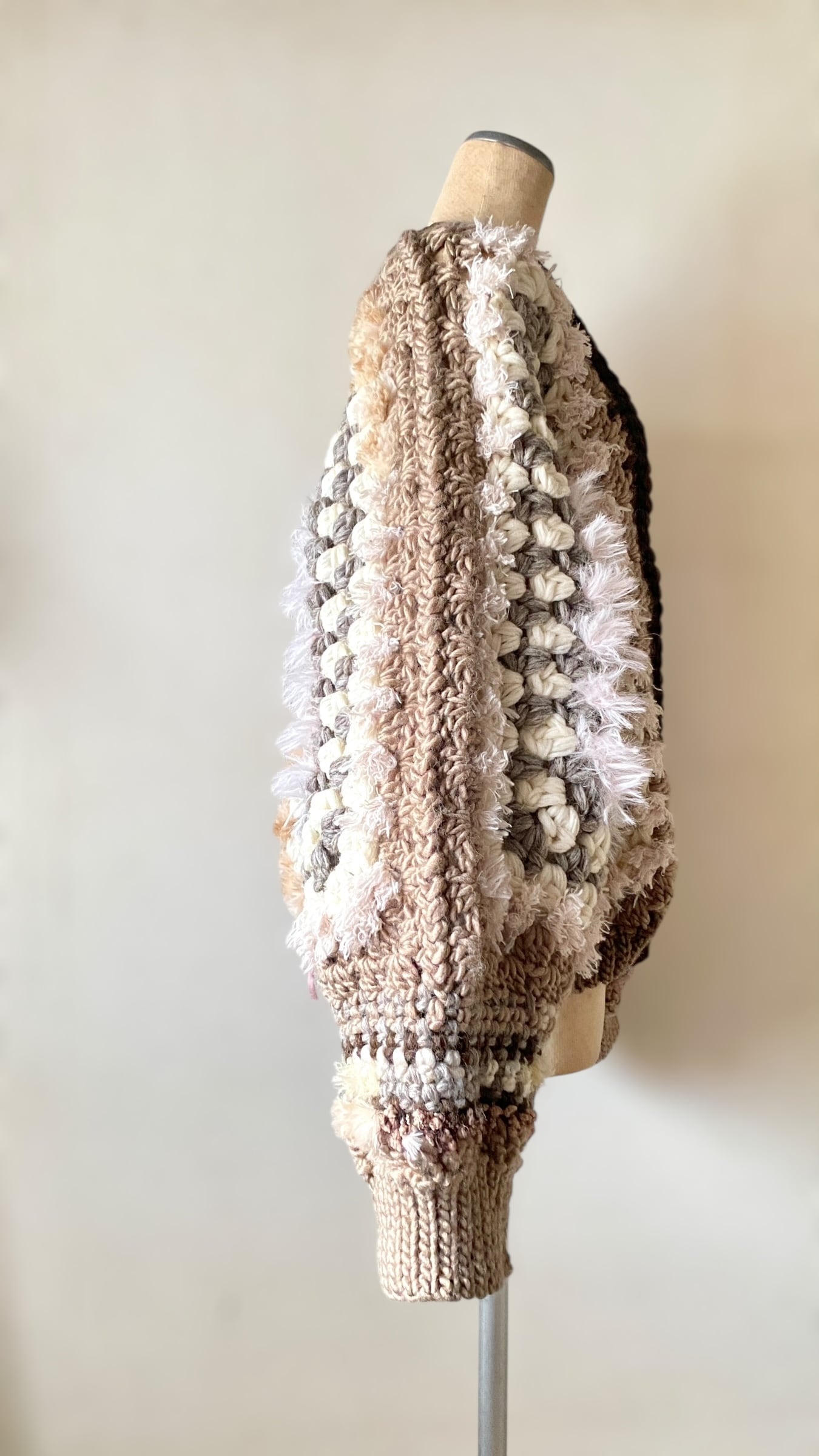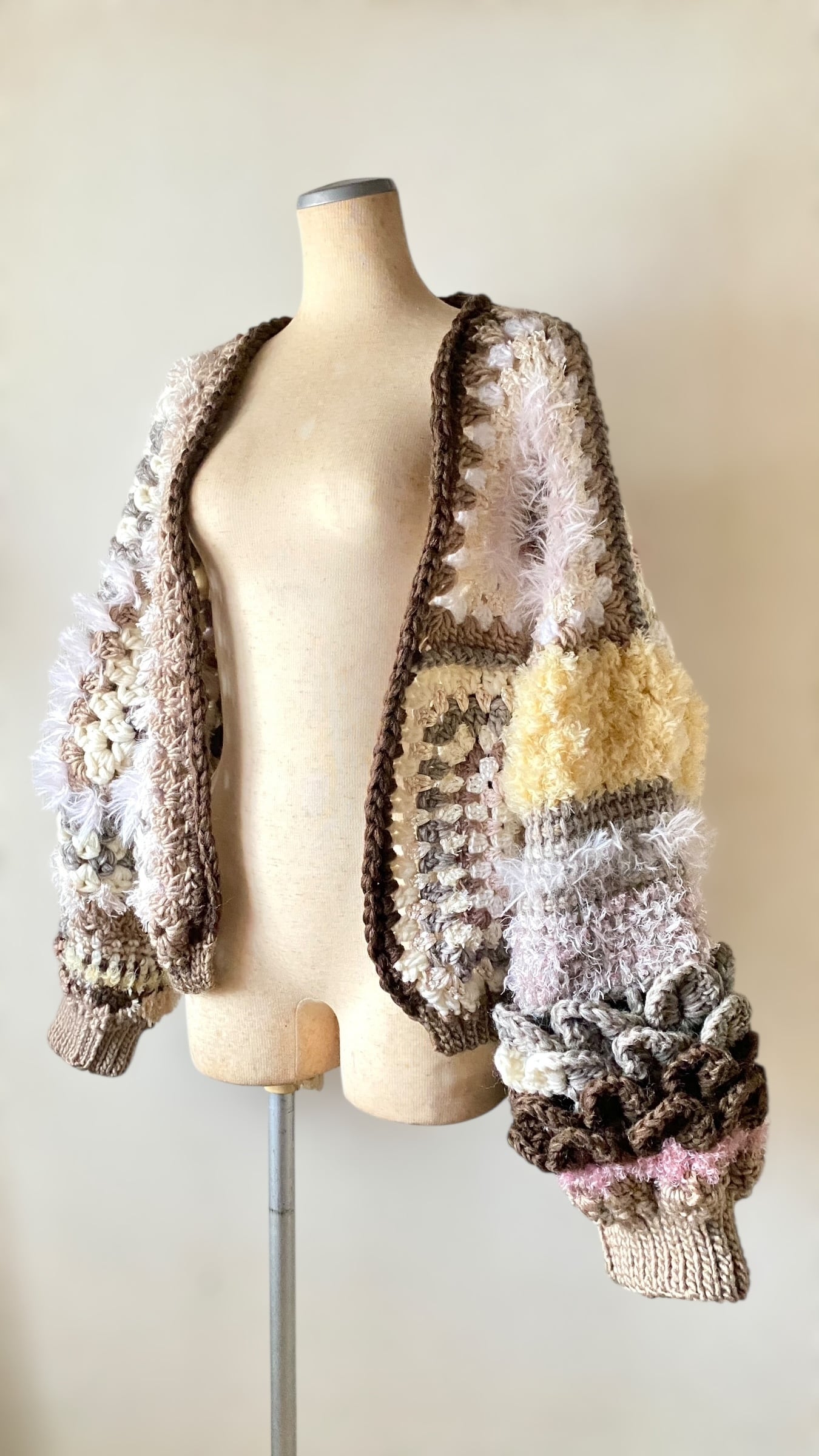カウチンヤーンをたっぷり使用したアシンメトリーデザインのヘキサゴングラニーカーディガンです