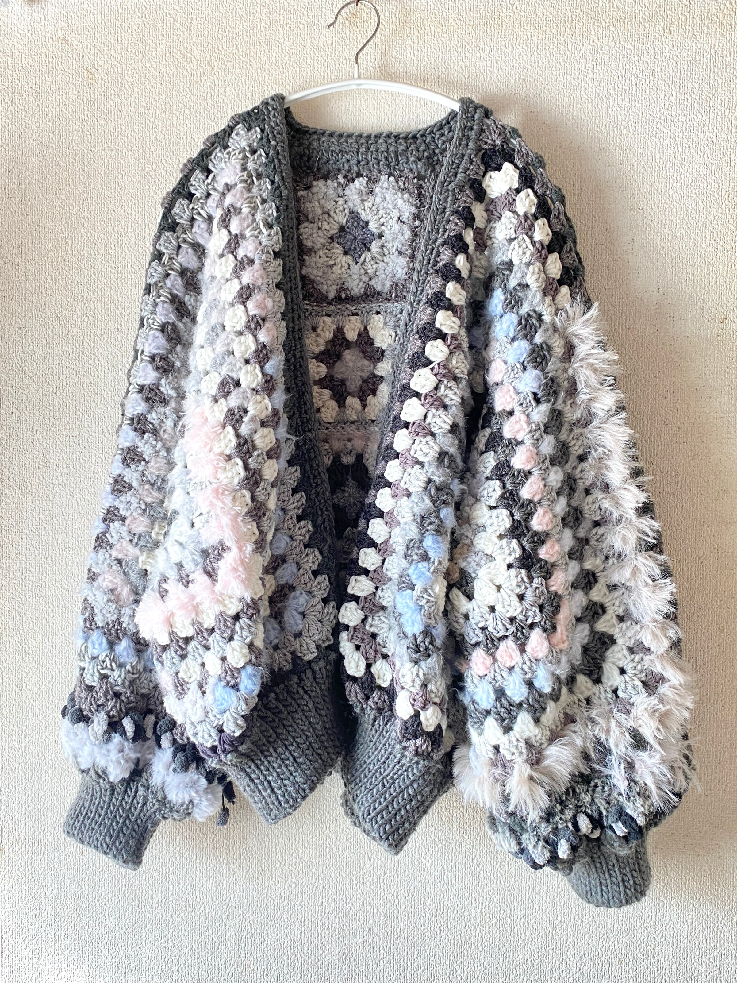 左右の配色はアシンメトリーですが、デザインはシンメトリーのヘキサゴングラニーカーディガンになります