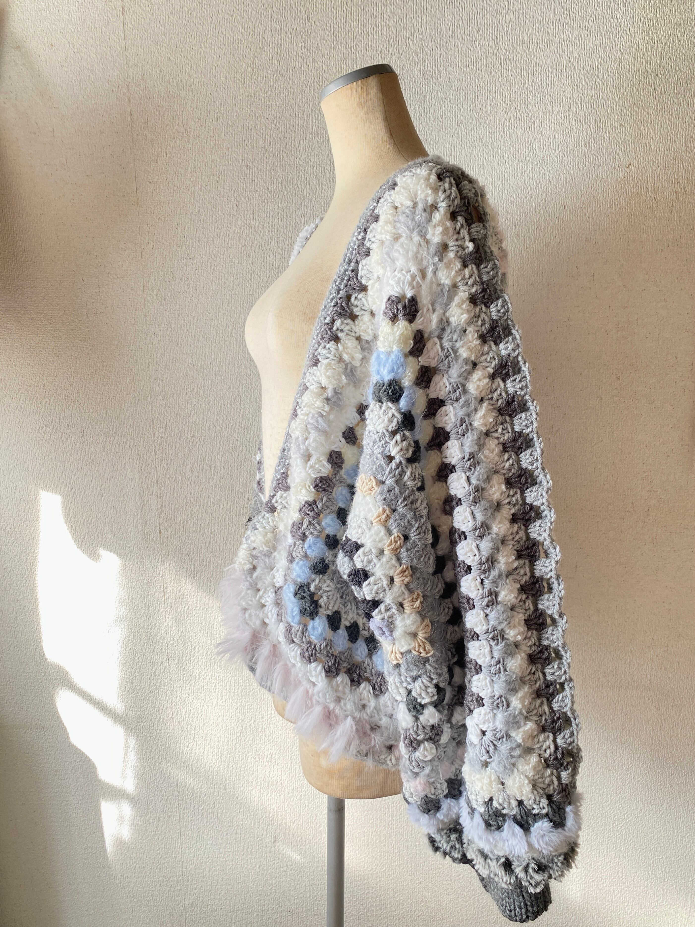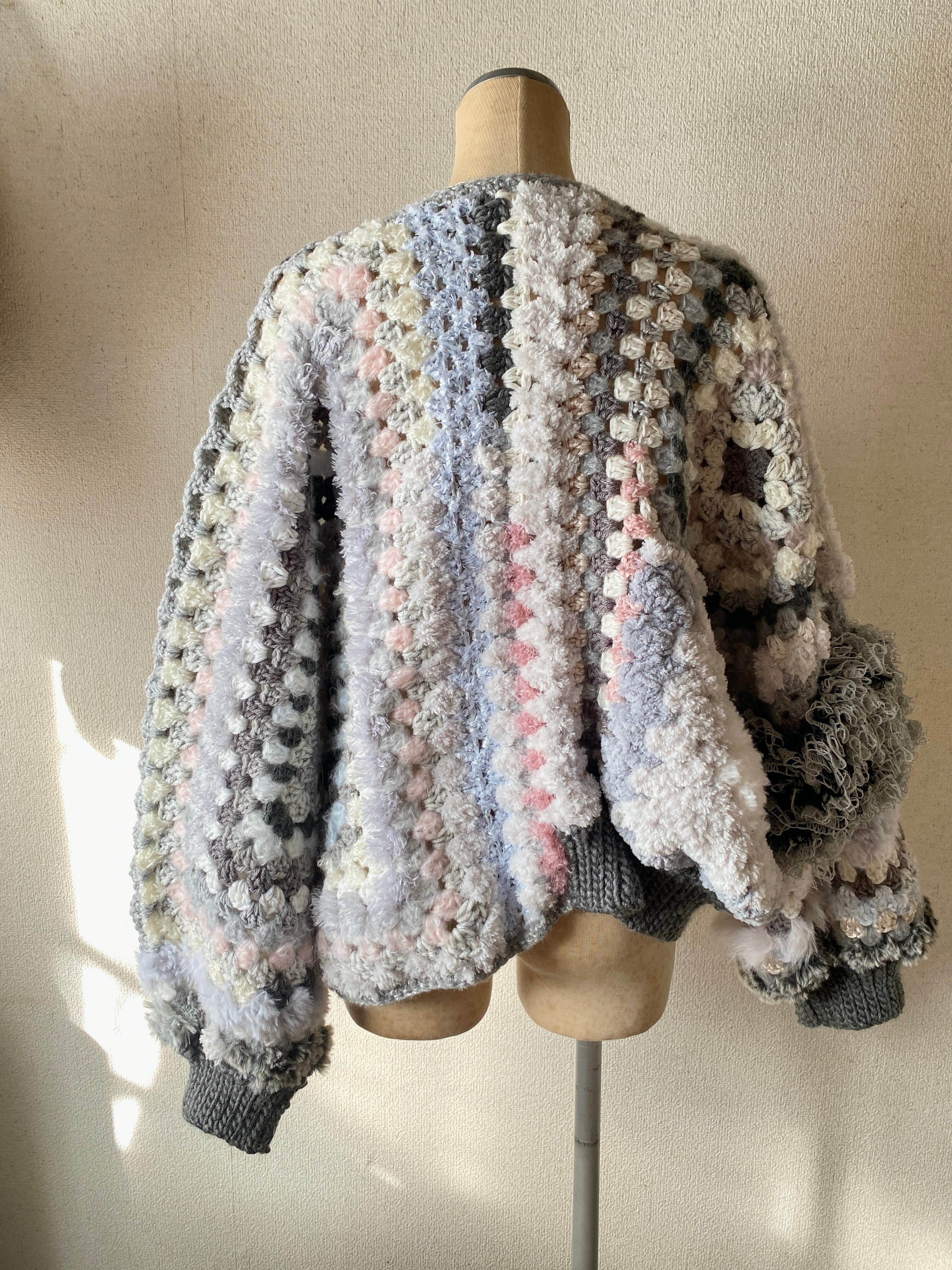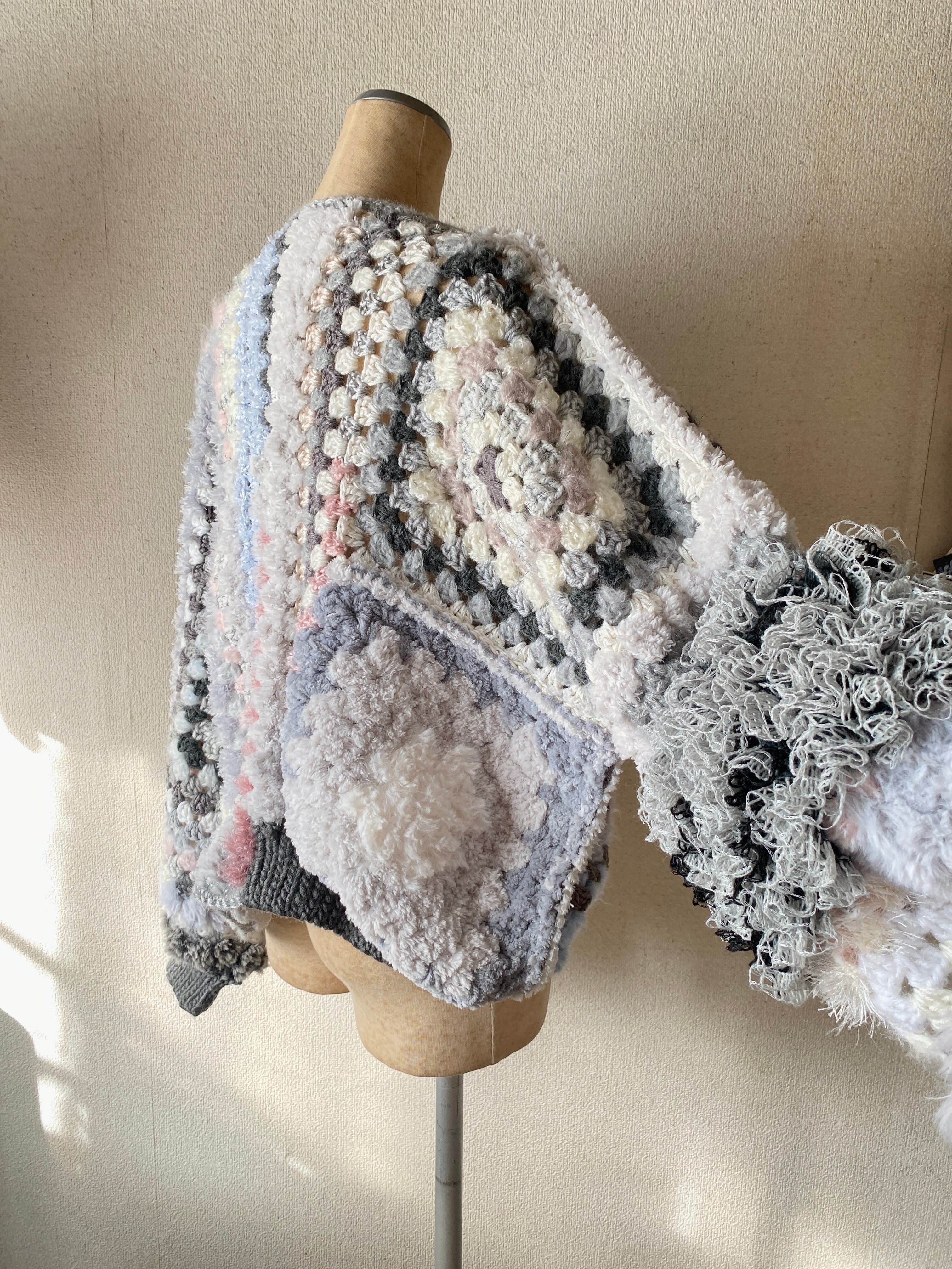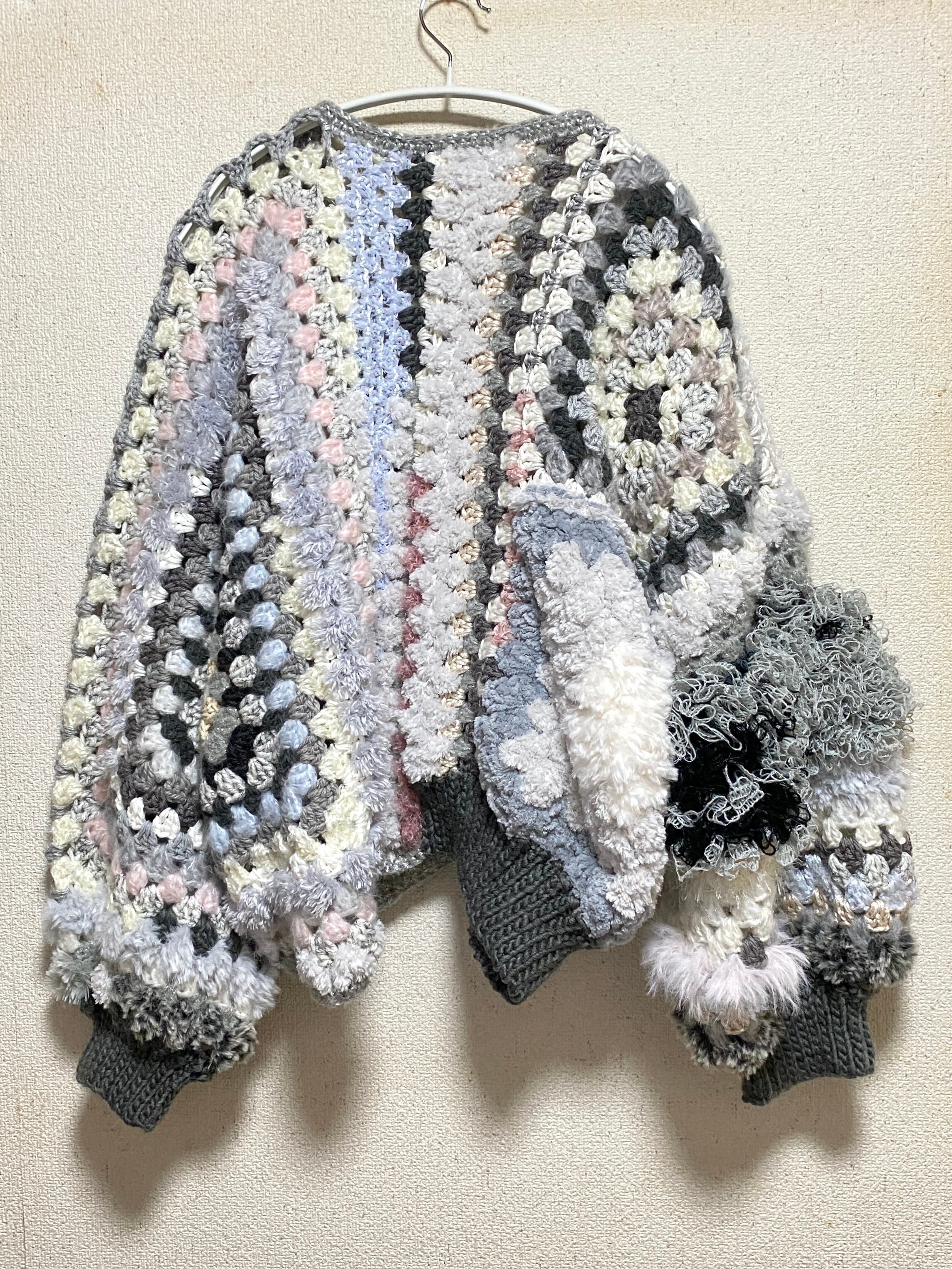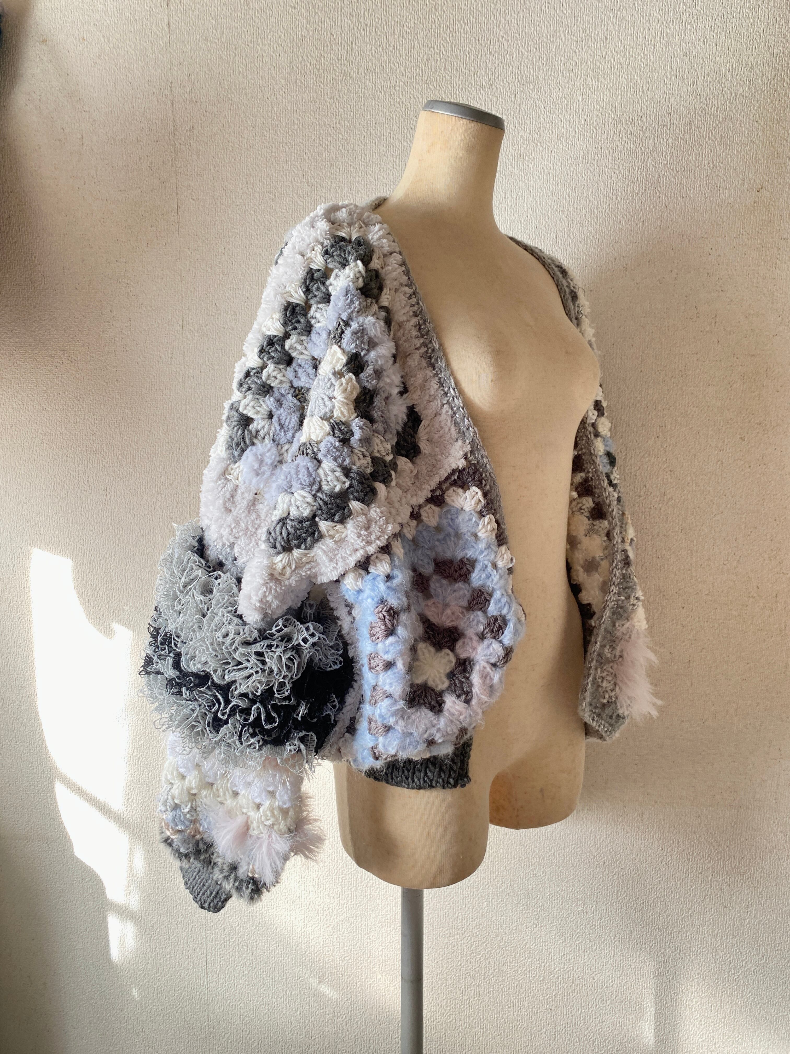 Granny hexagon cardigan with a cute asymmetrical design and a soft monotone color scheme. 優しいモノトーンのヘキサゴンカーディガン アシンメトリーデザイン