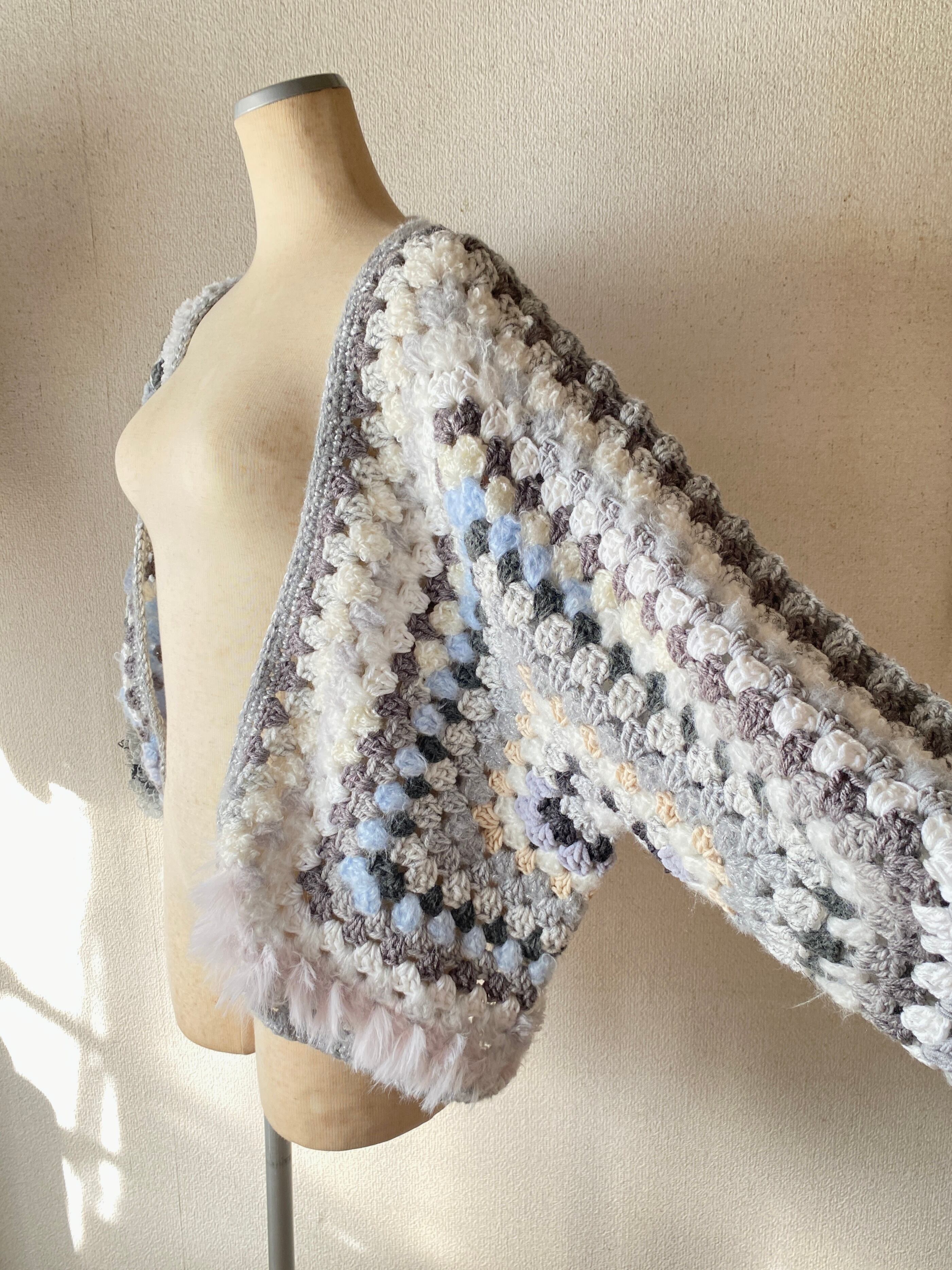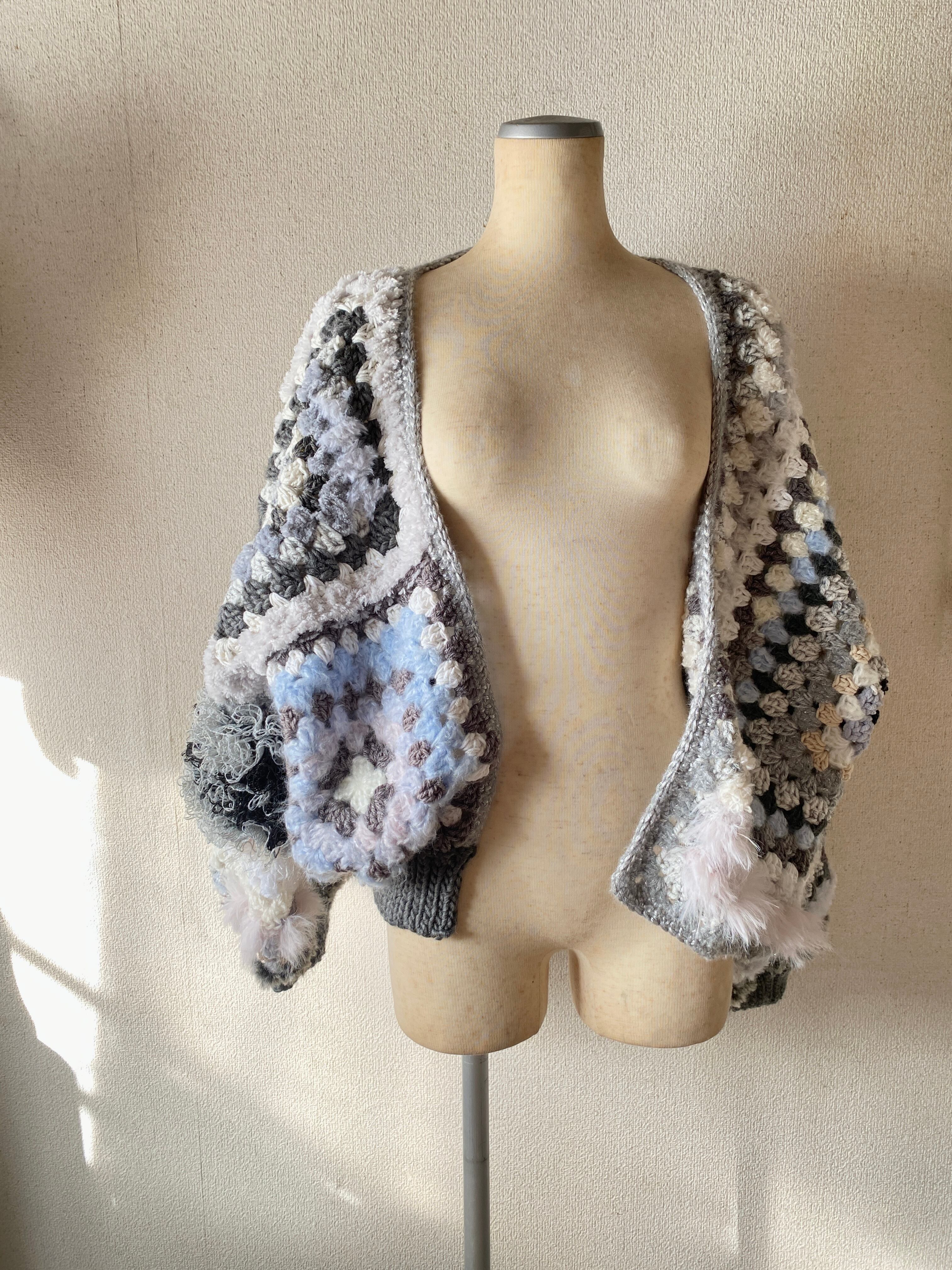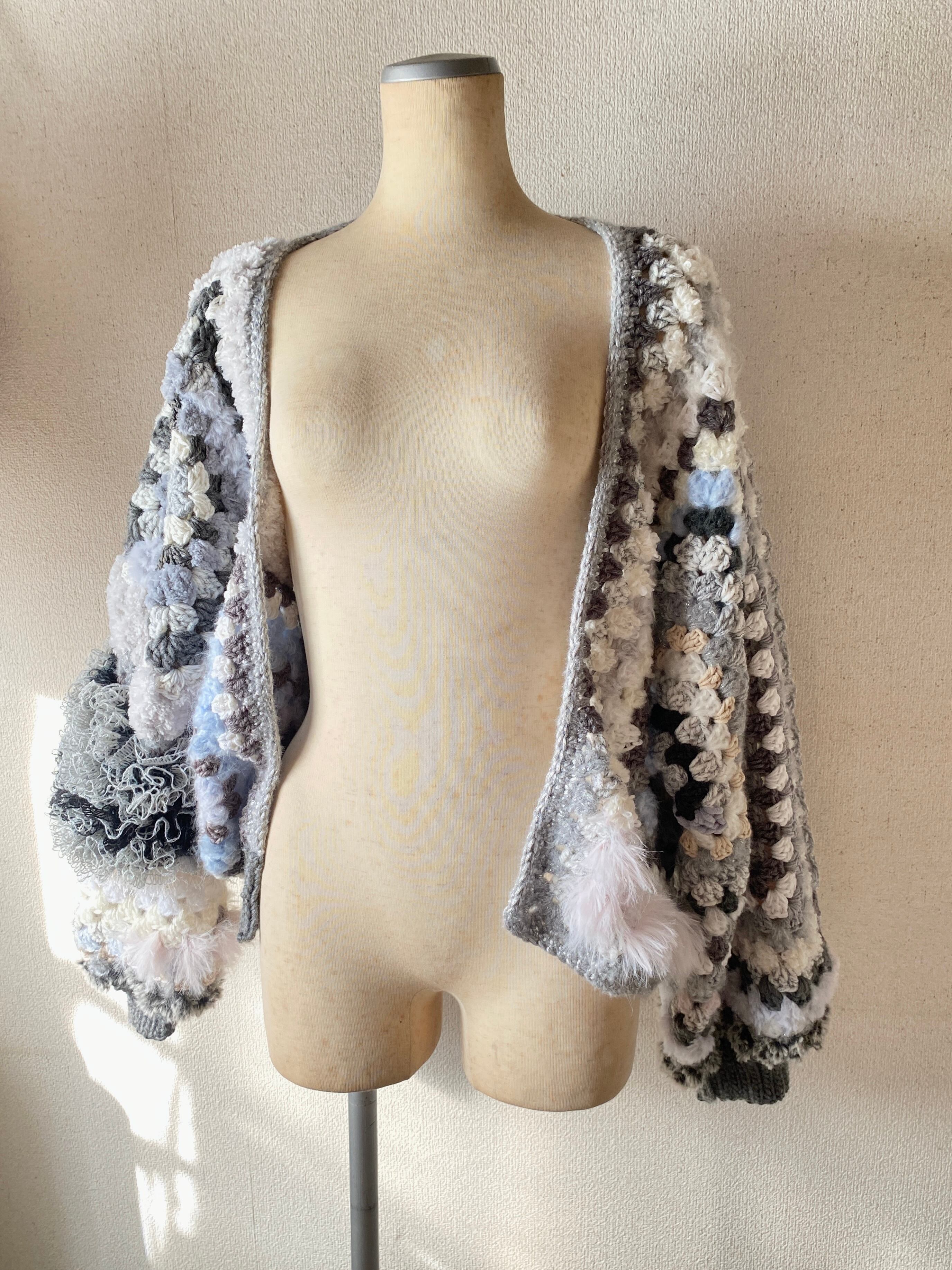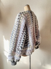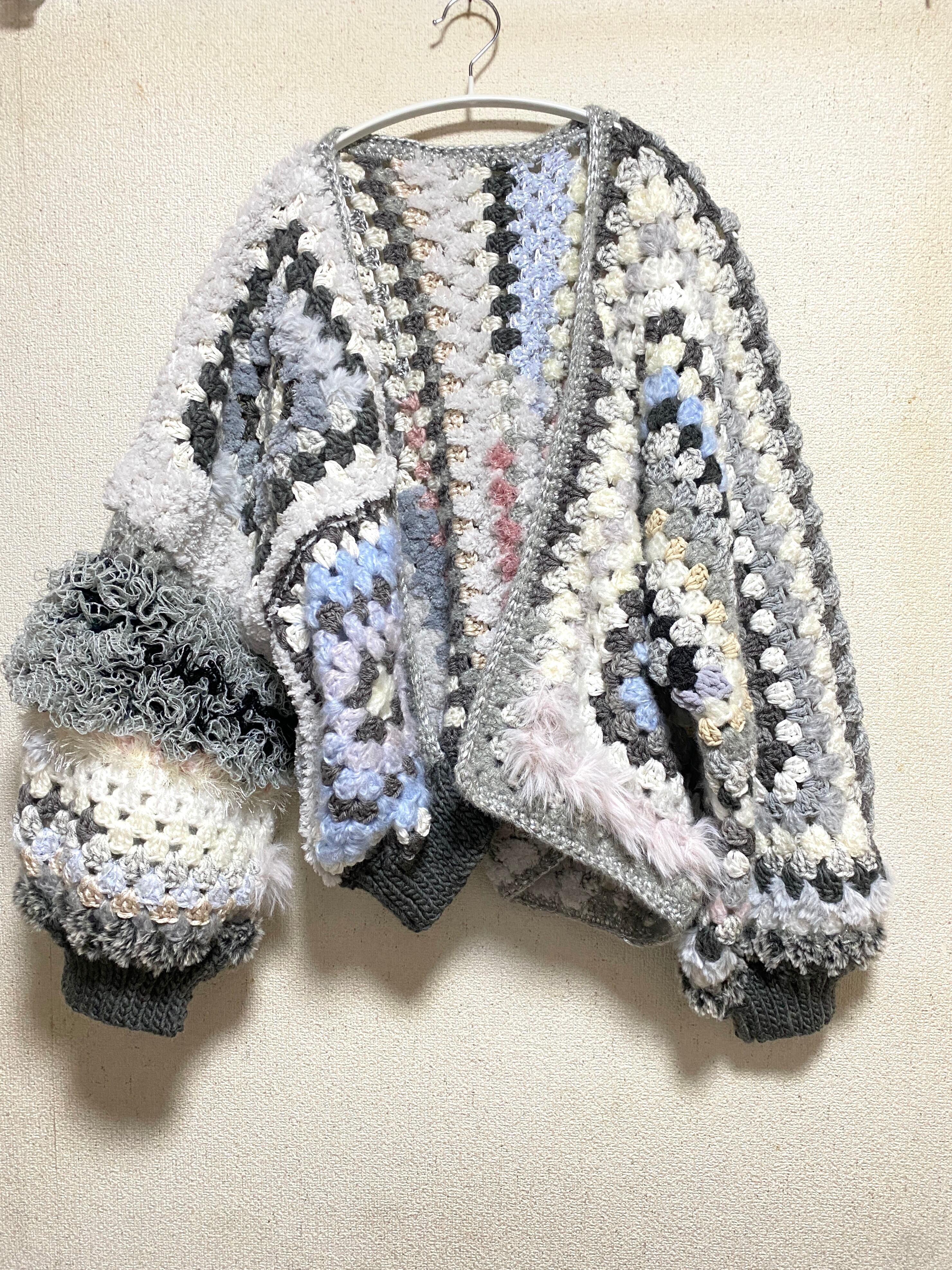 Granny hexagon cardigan with a cute asymmetrical design and a soft monotone color scheme. 優しいモノトーンのヘキサゴンカーディガン アシンメトリーデザイン