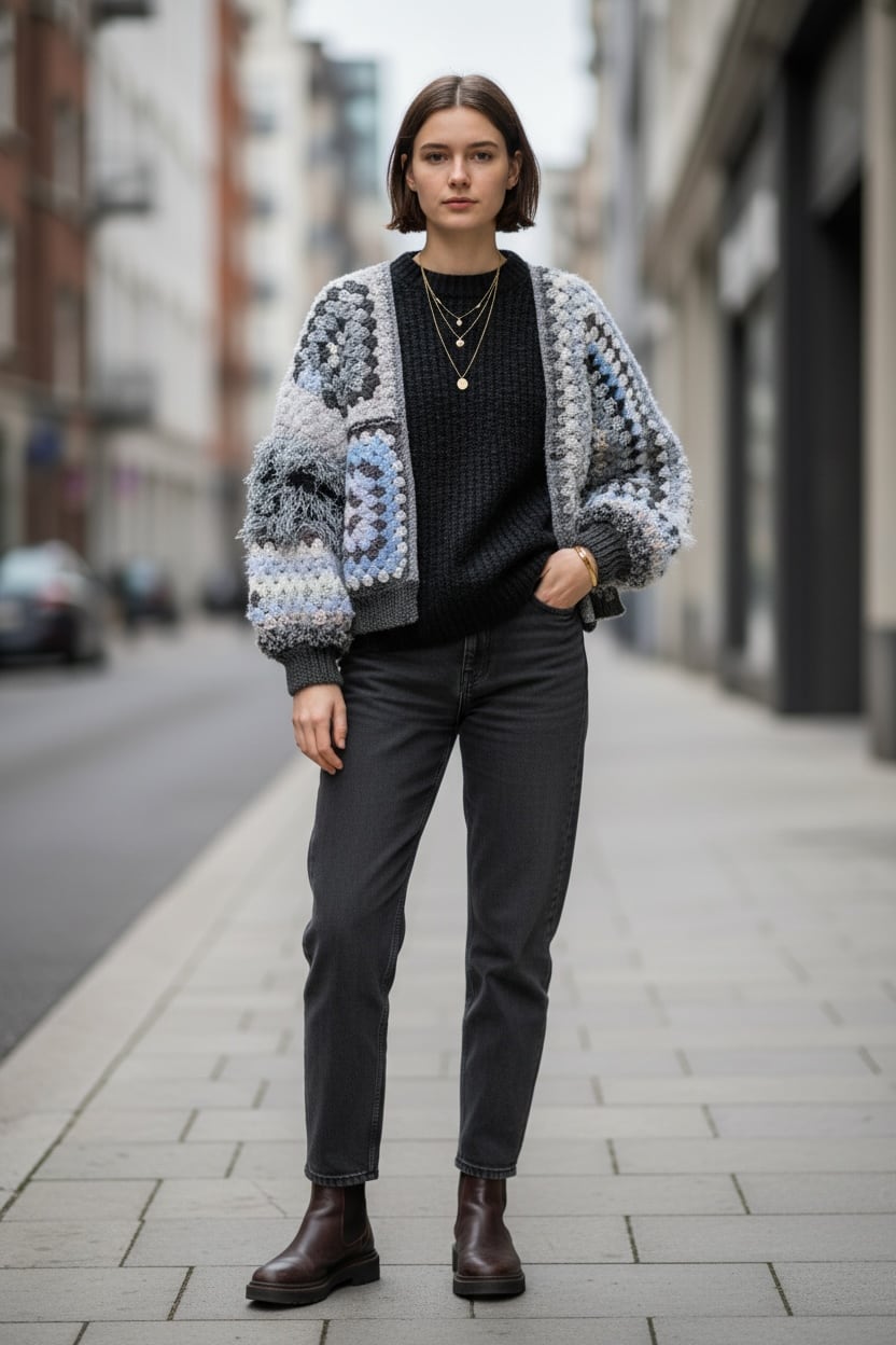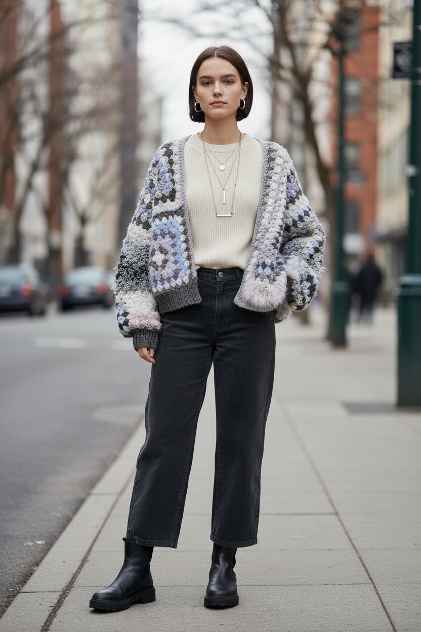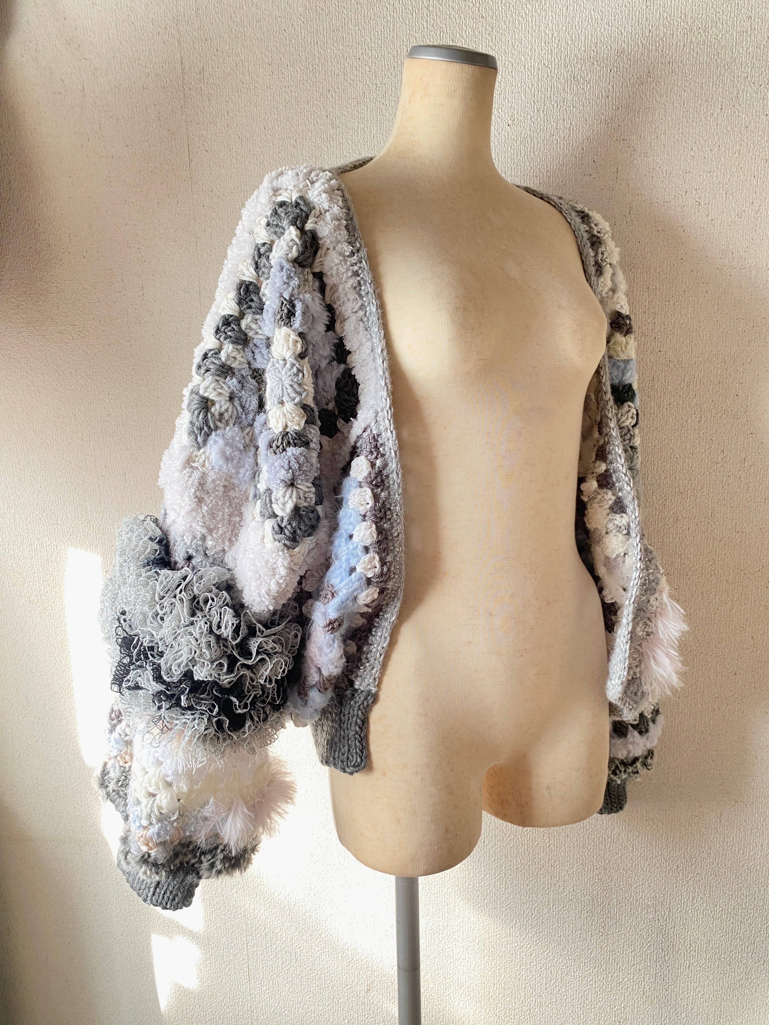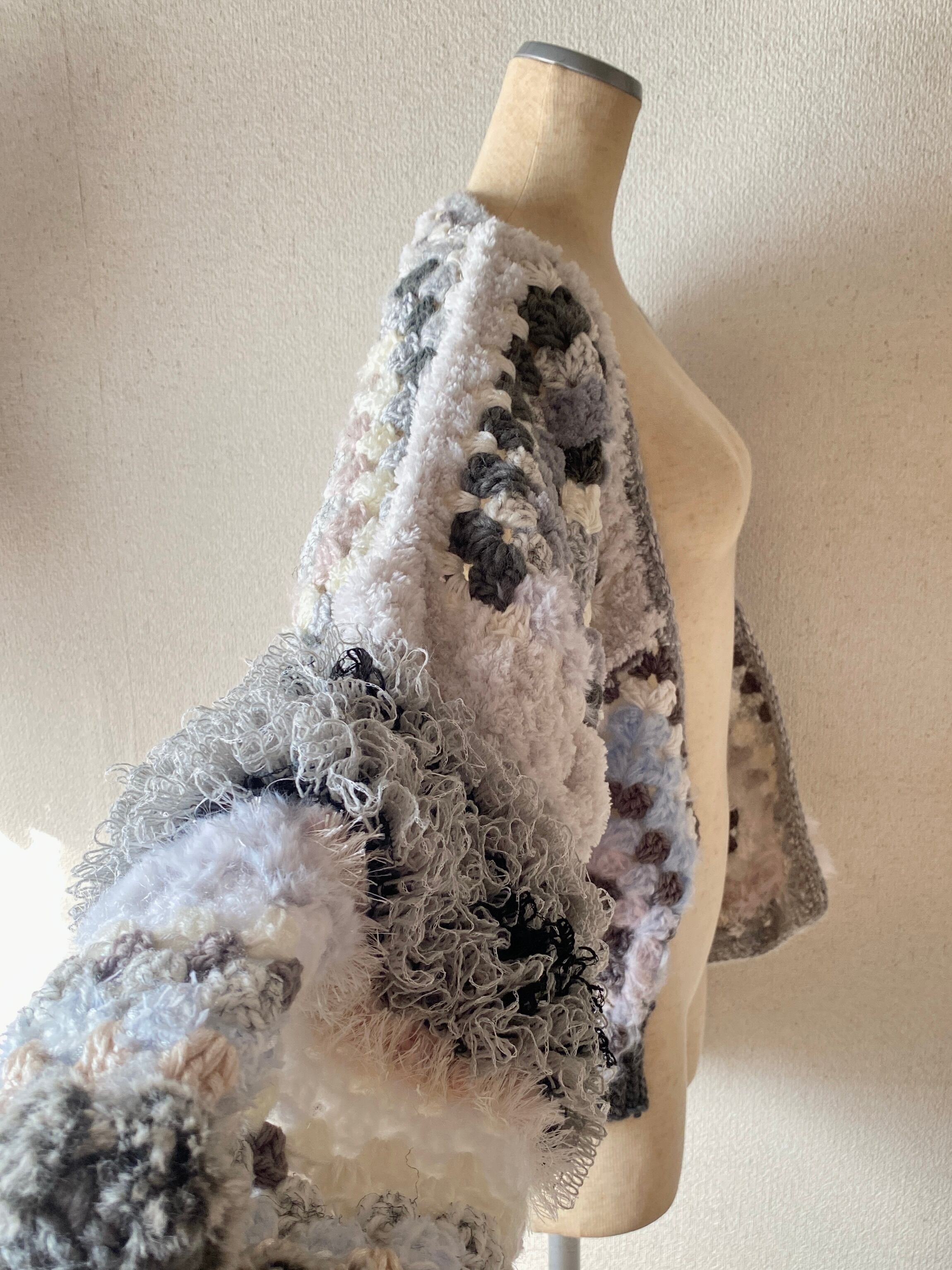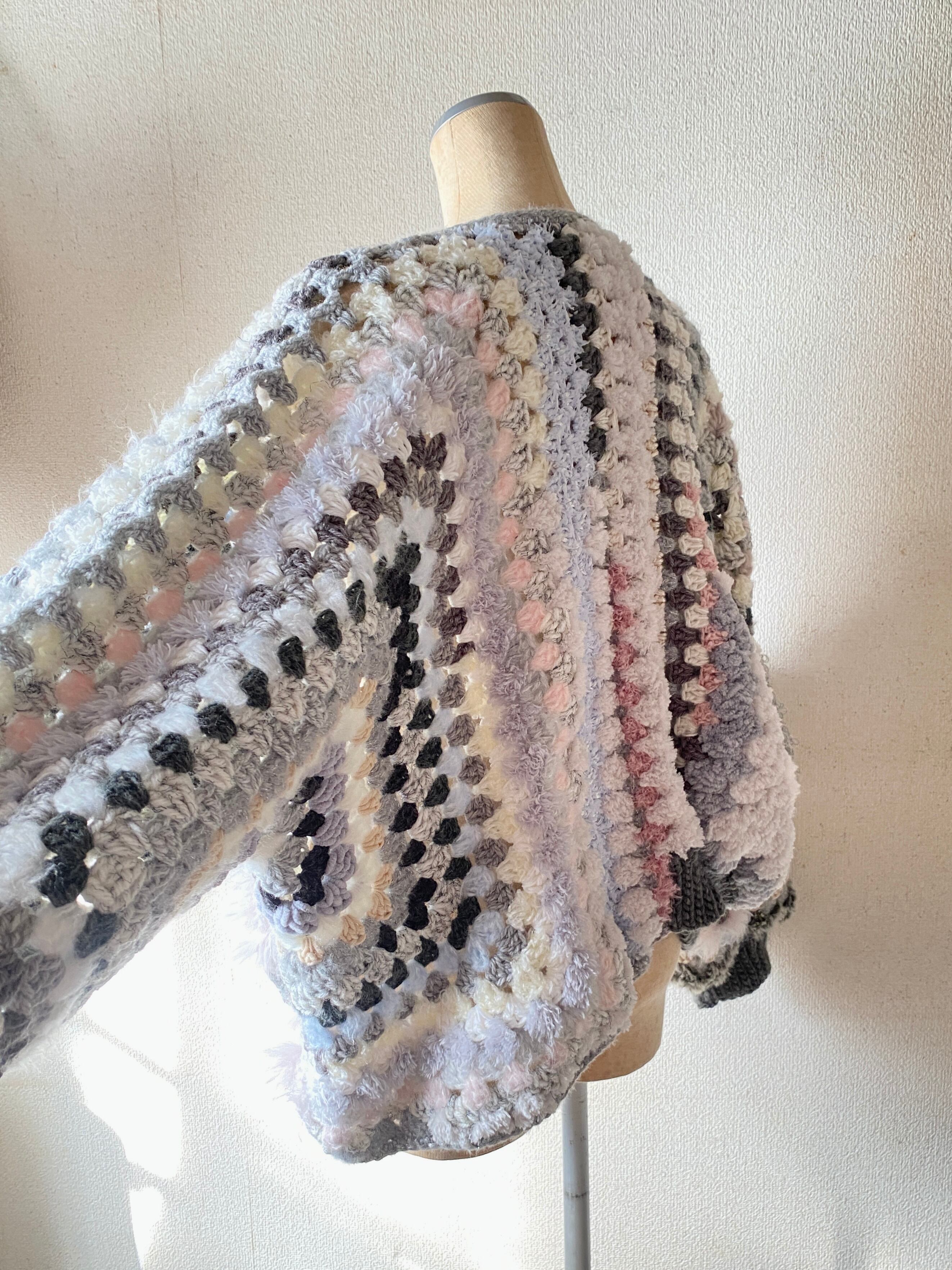 Granny hexagon cardigan with a cute asymmetrical design and a soft monotone color scheme. 優しいモノトーンのヘキサゴンカーディガン アシンメトリーデザイン
