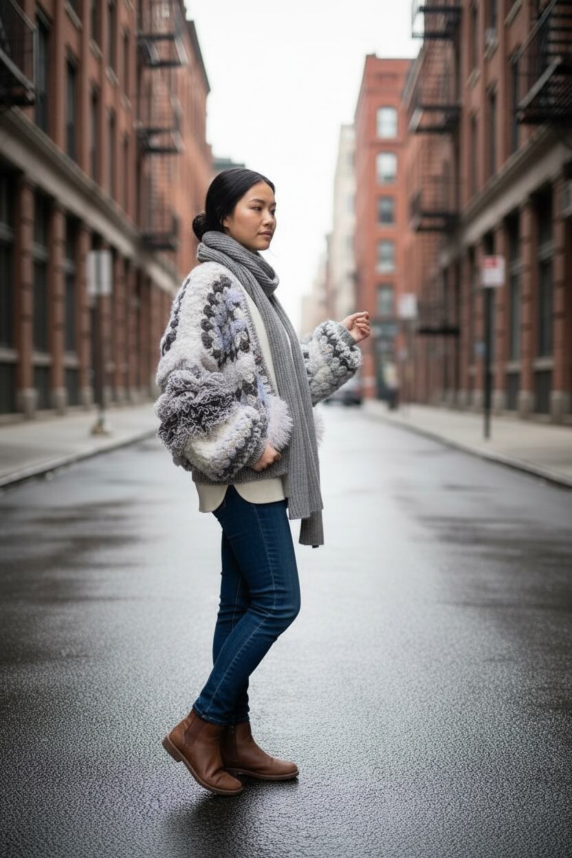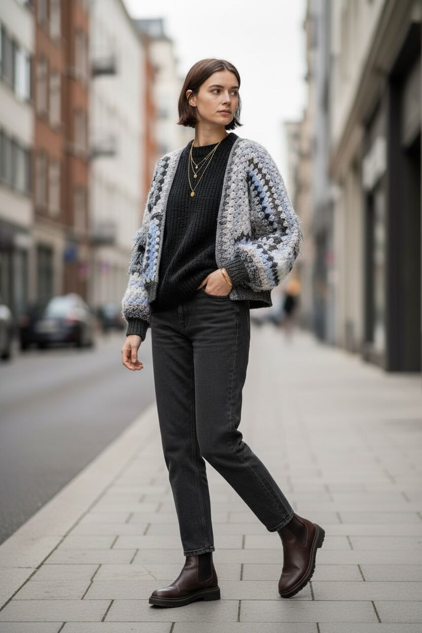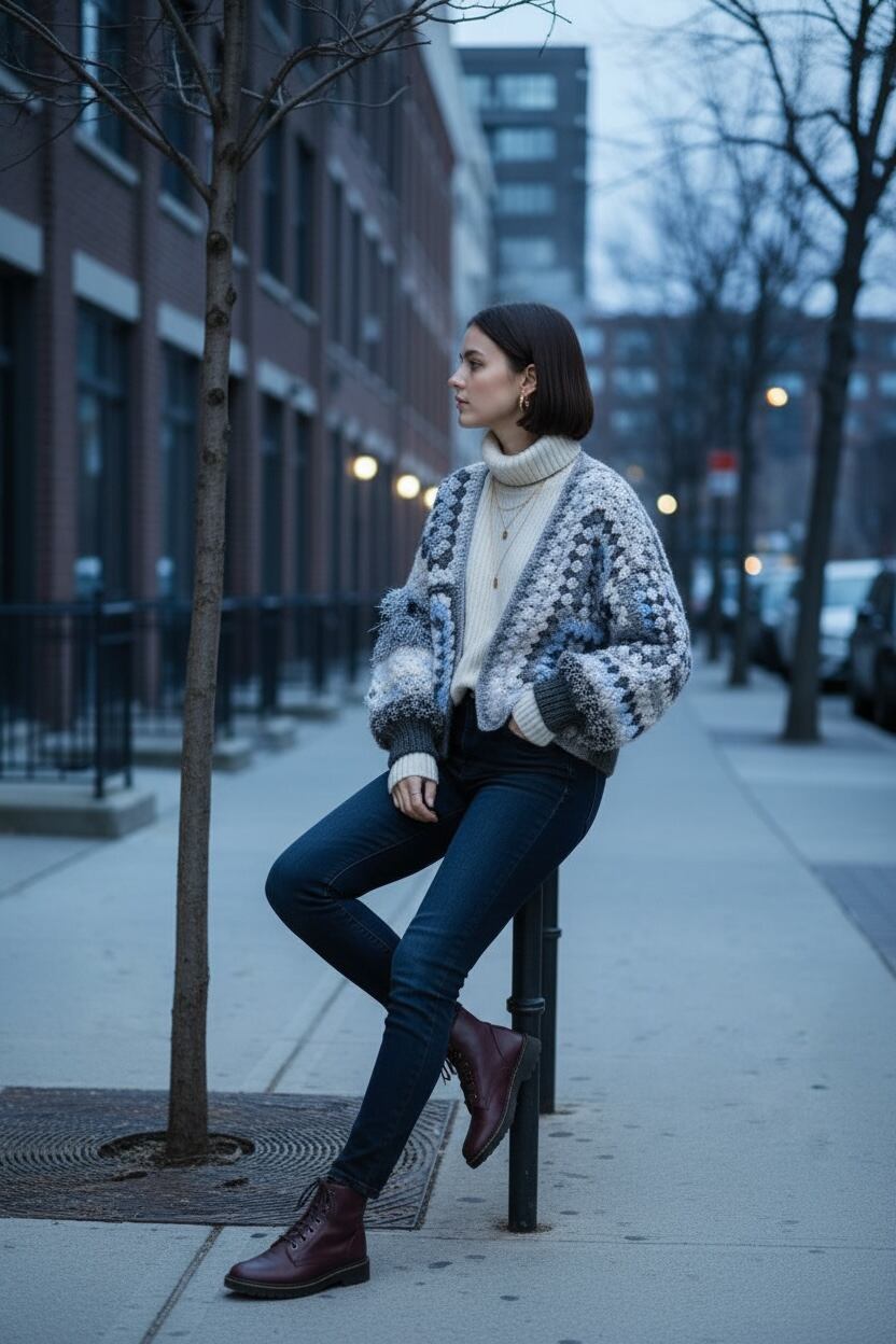 優しいモノトーン配色のグラニーヘキサゴンモチーフをアシンメトリーにデザインしたカーディガンです