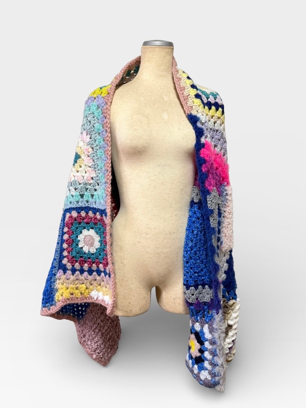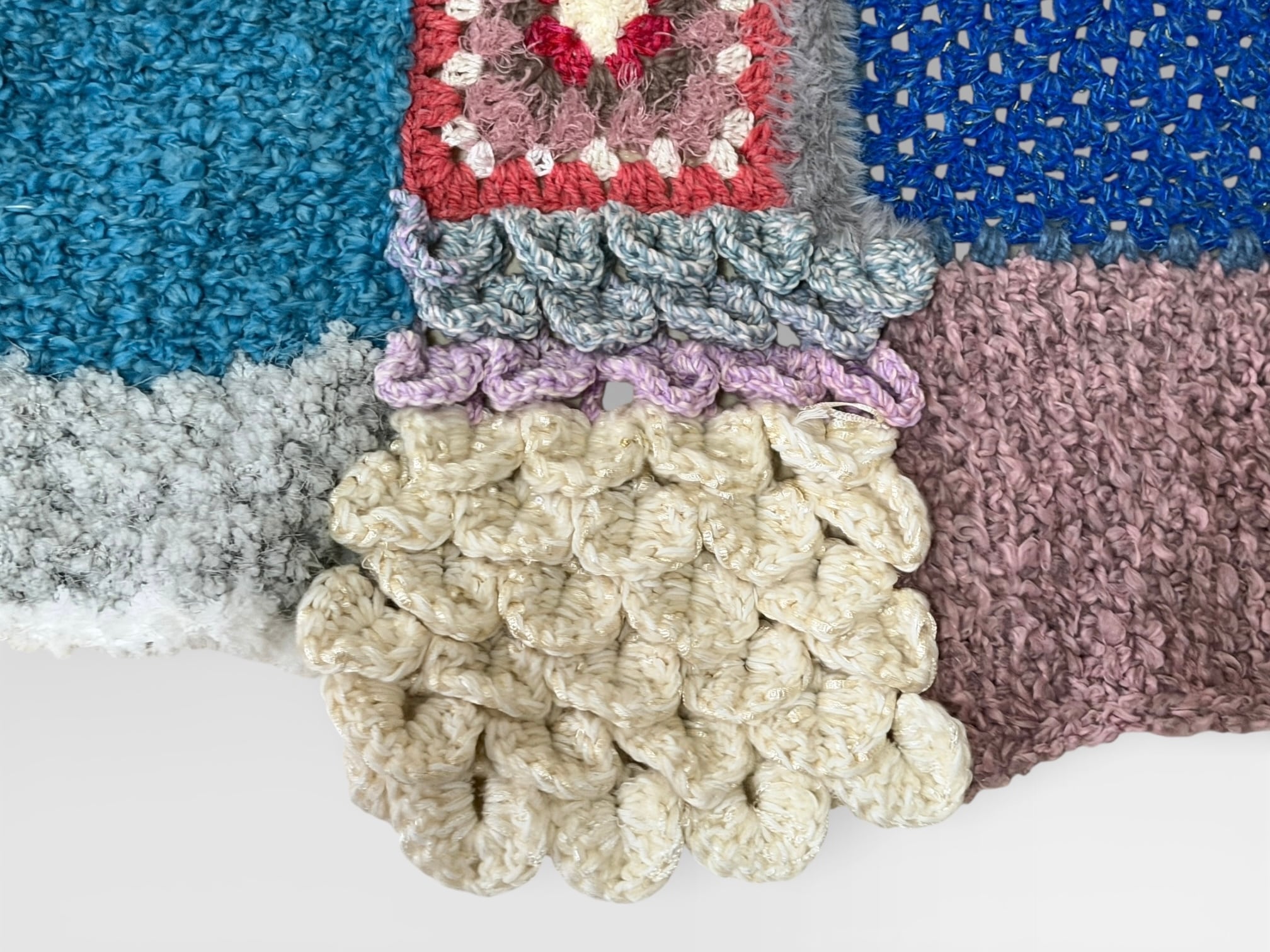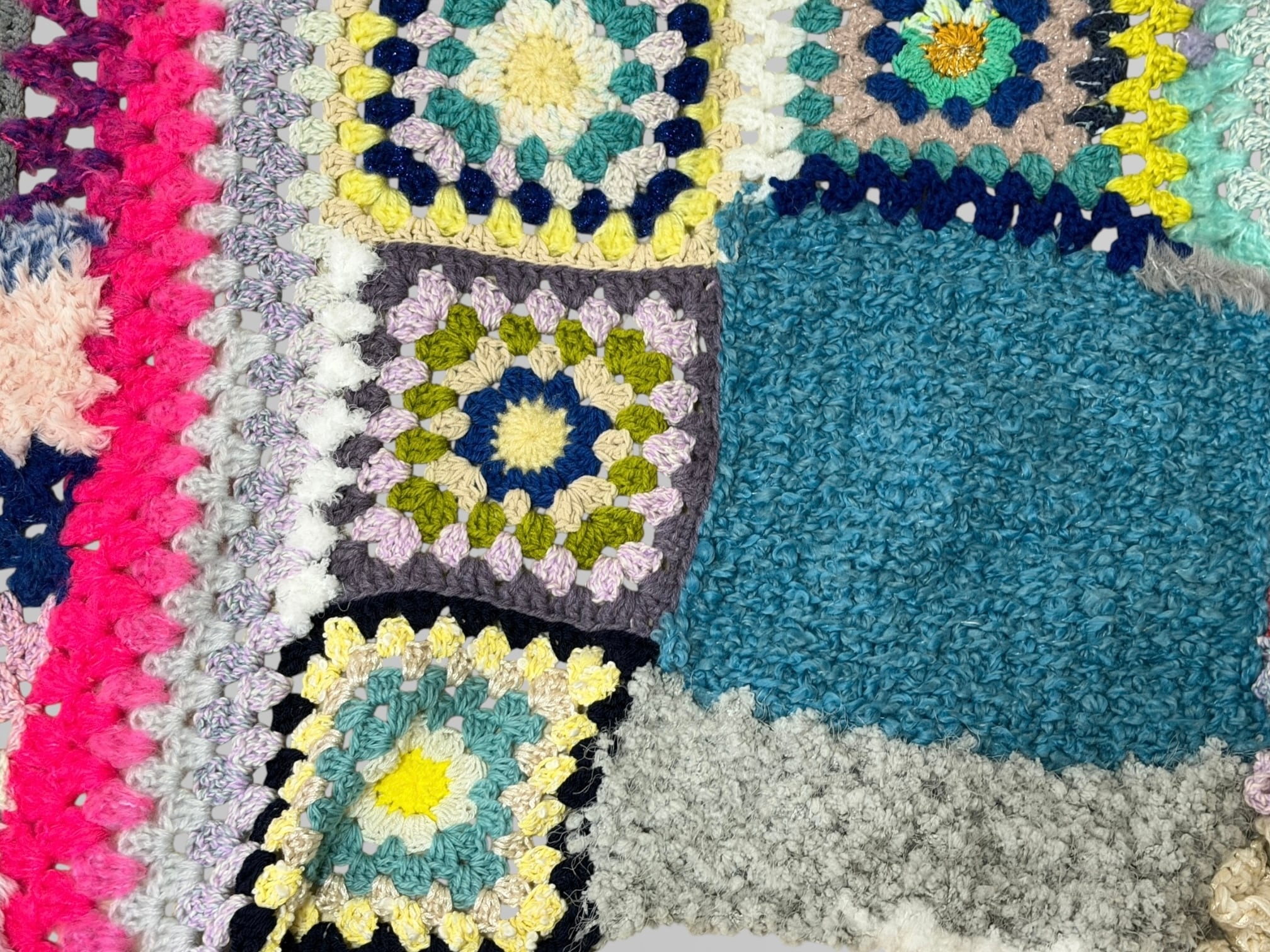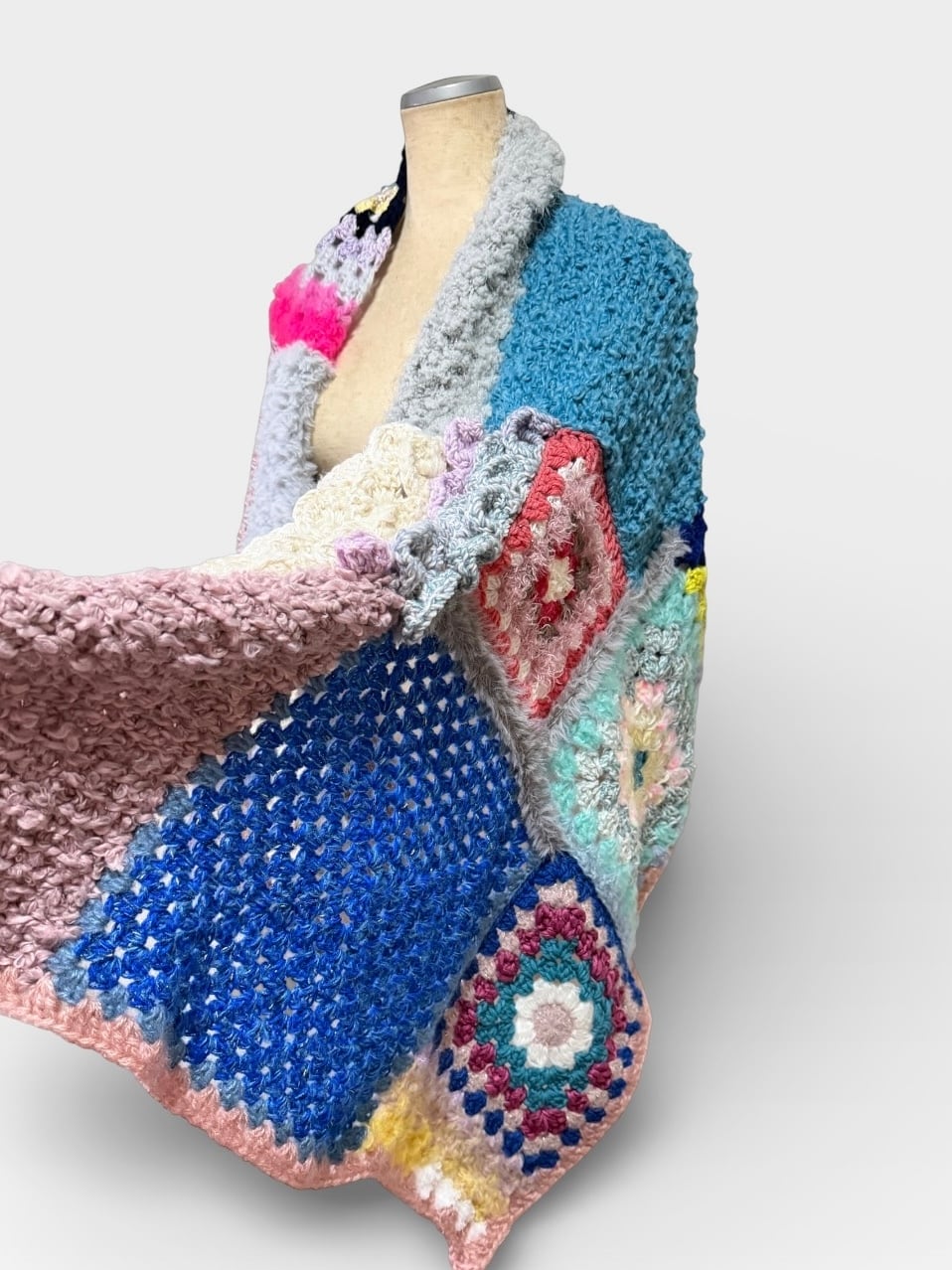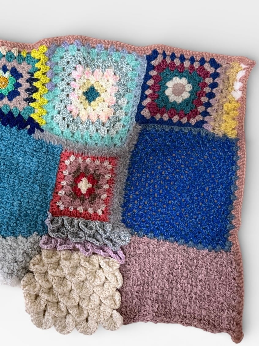 大小さまざまなサイズのグラニースクエアモチーフを繋ぎ合わせた大判のブランケットです