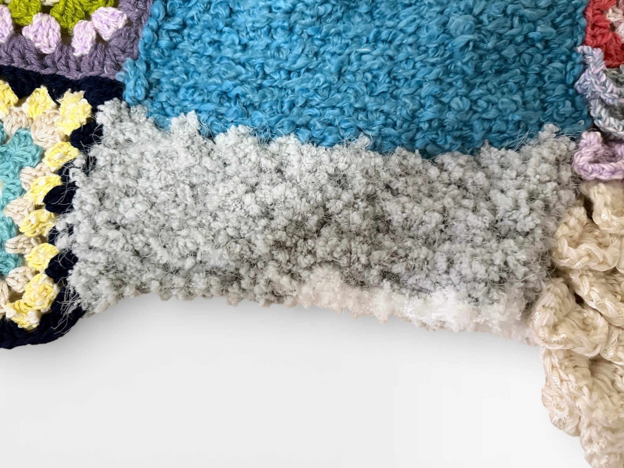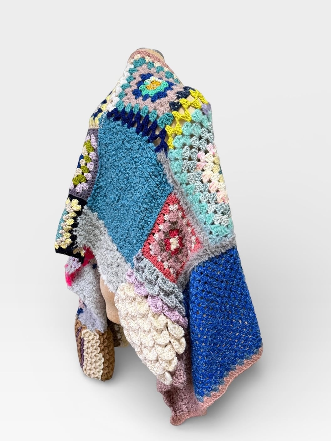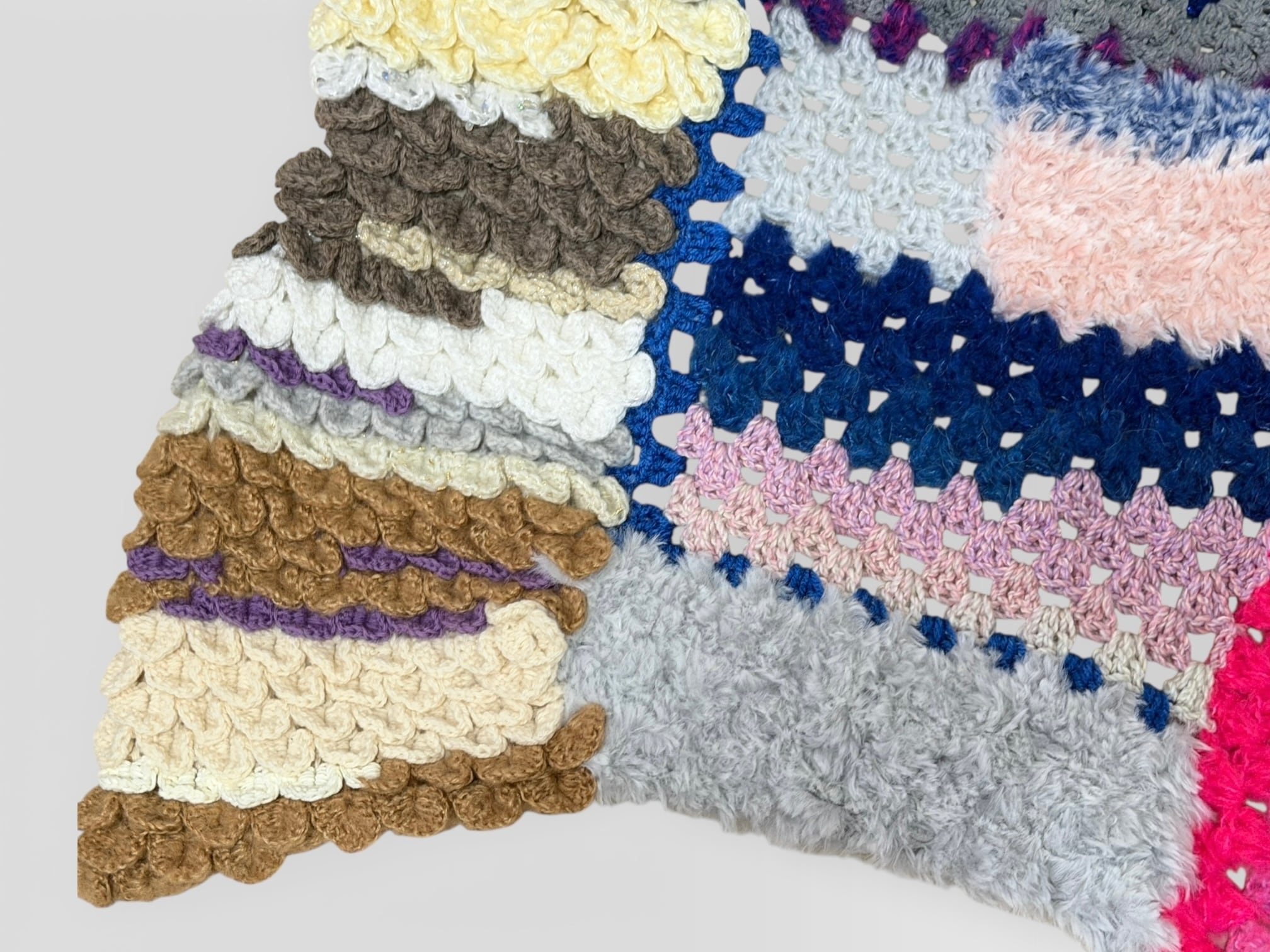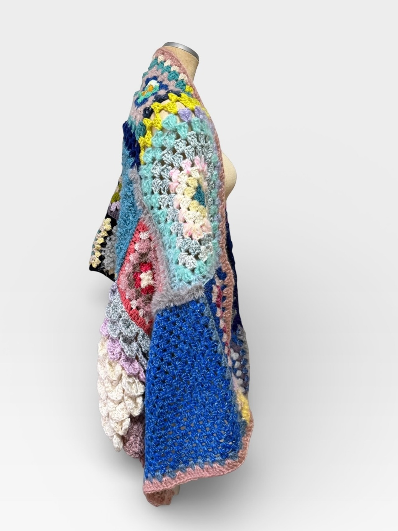 大小さまざまなサイズのグラニースクエアモチーフを繋ぎ合わせた大判のブランケットです