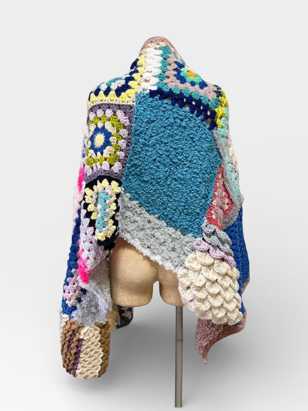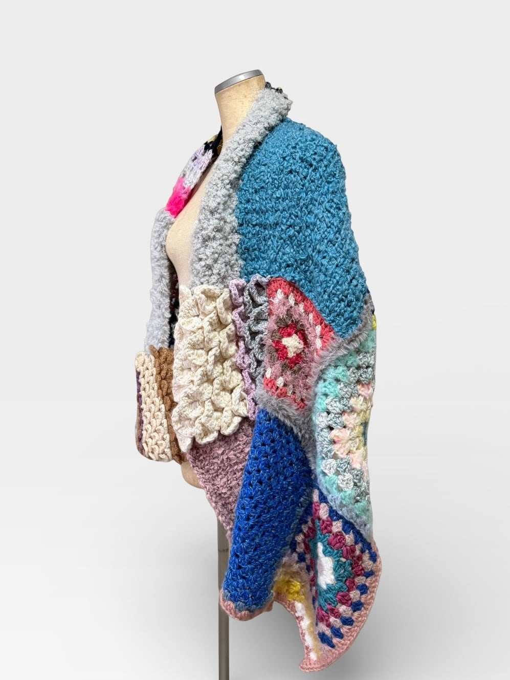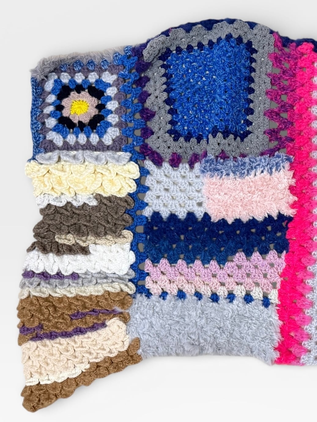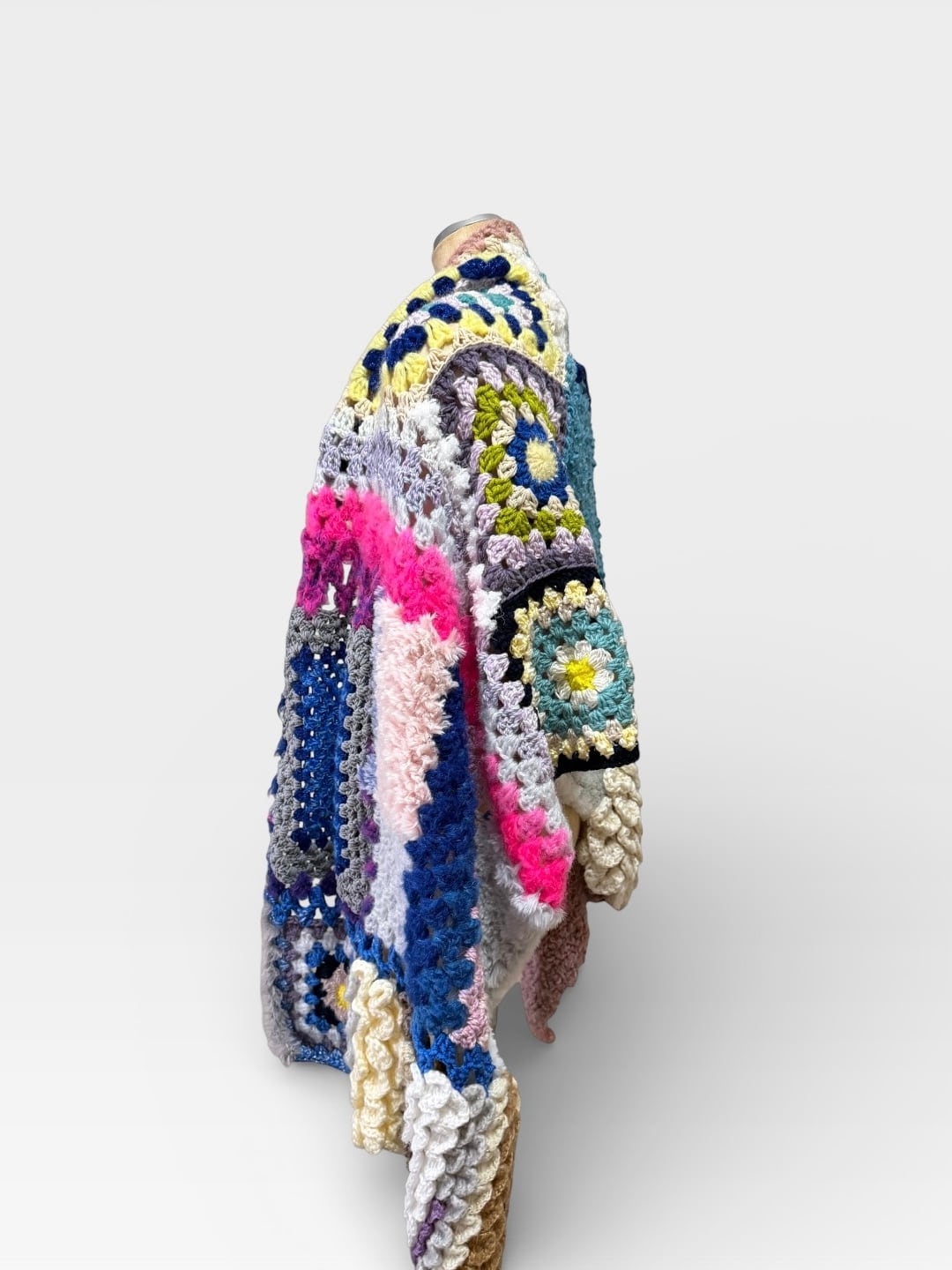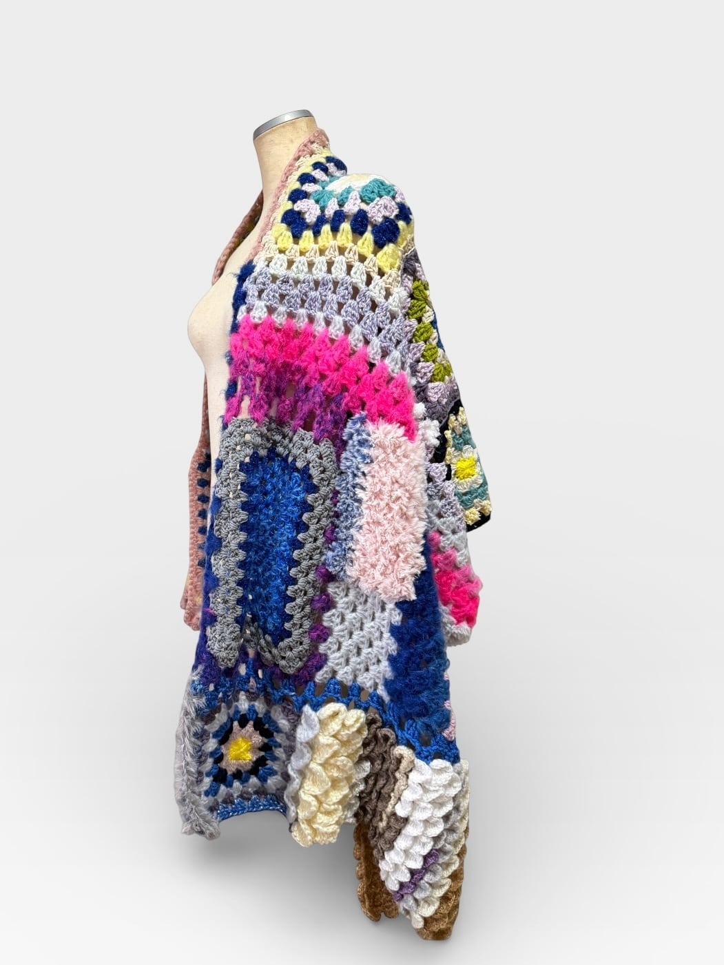 大小さまざまなサイズのグラニースクエアモチーフを繋ぎ合わせた大判のブランケットです