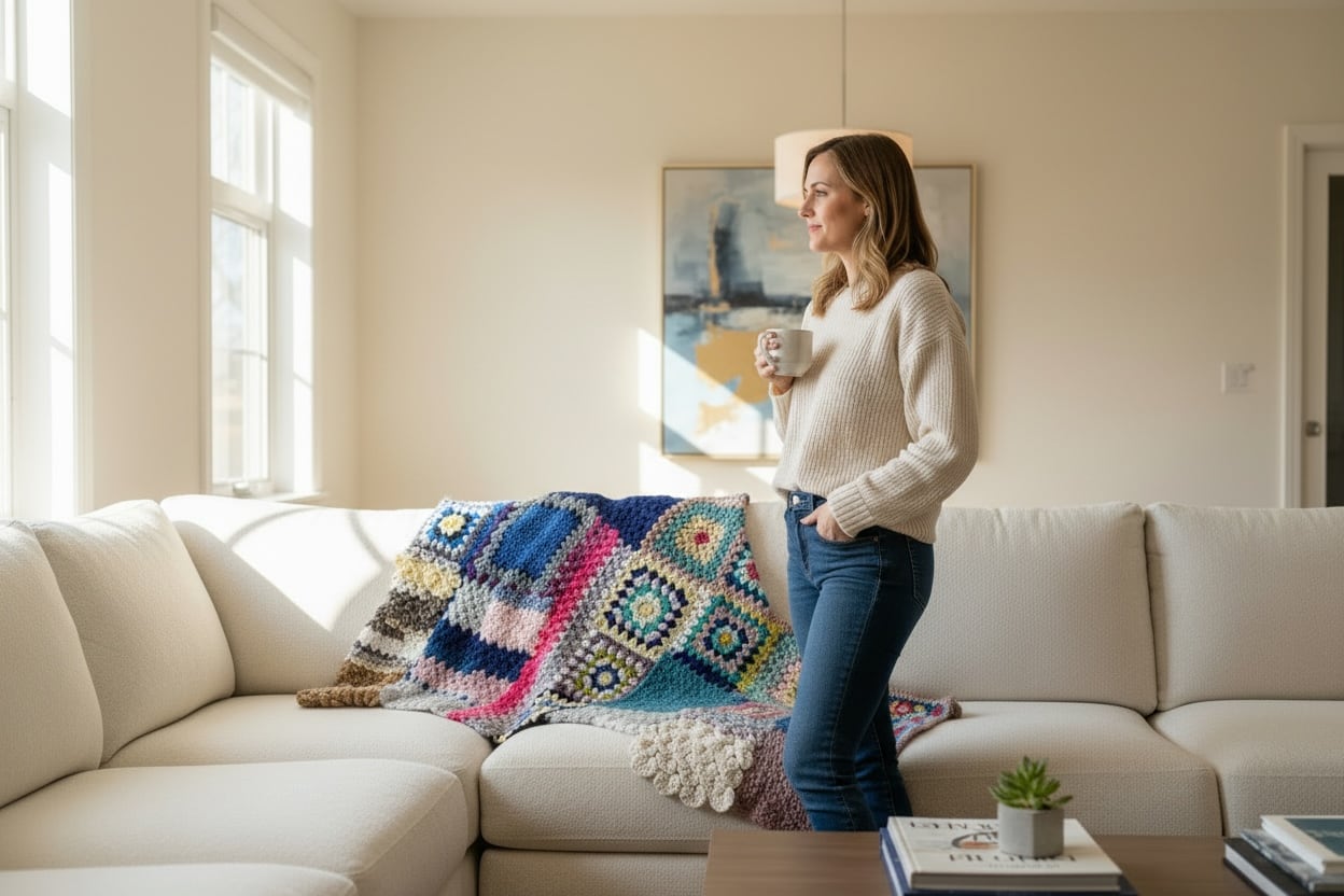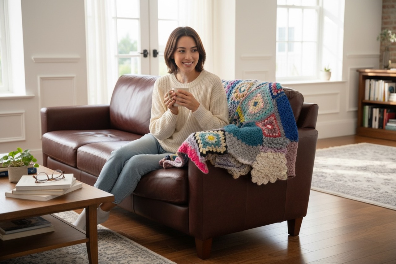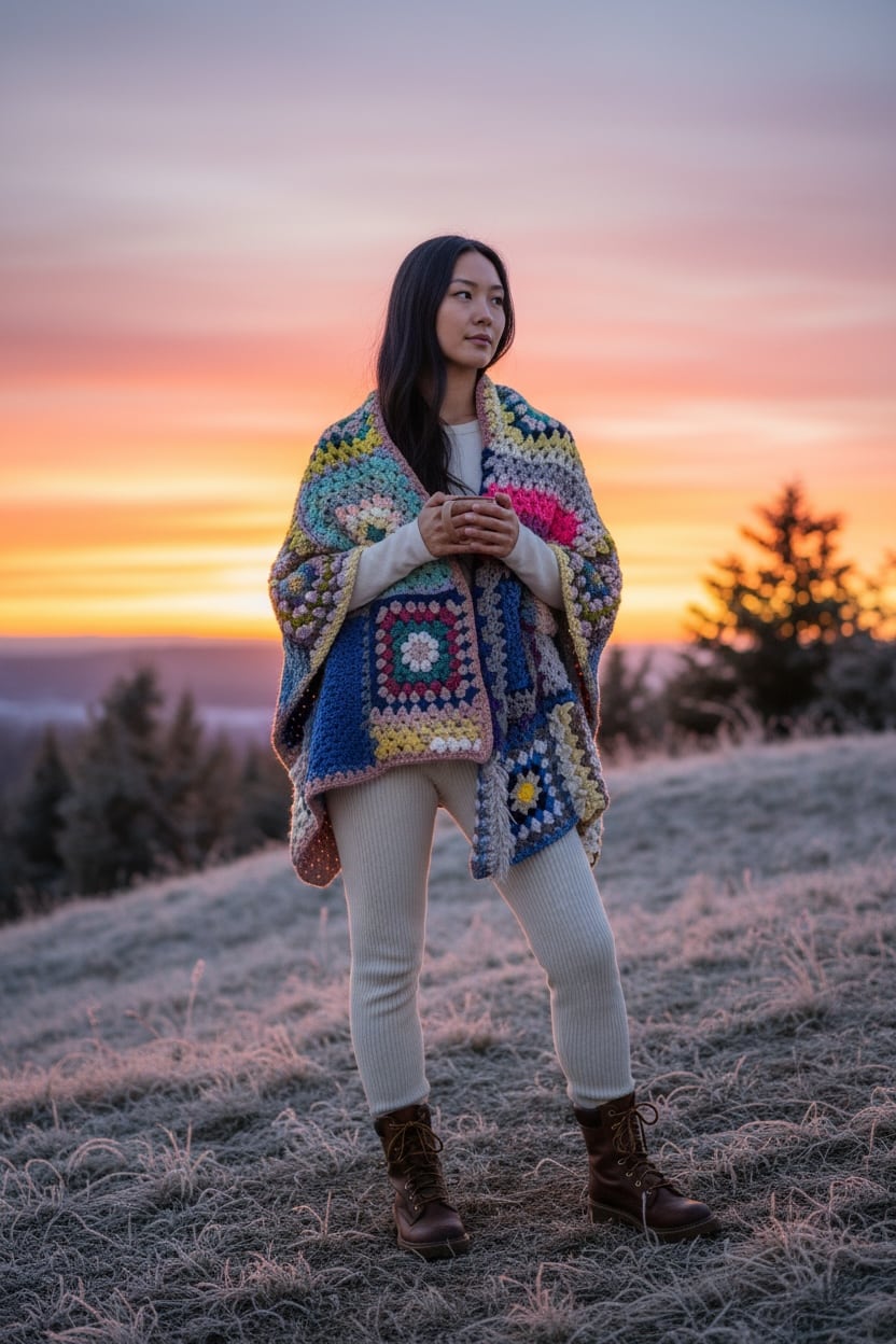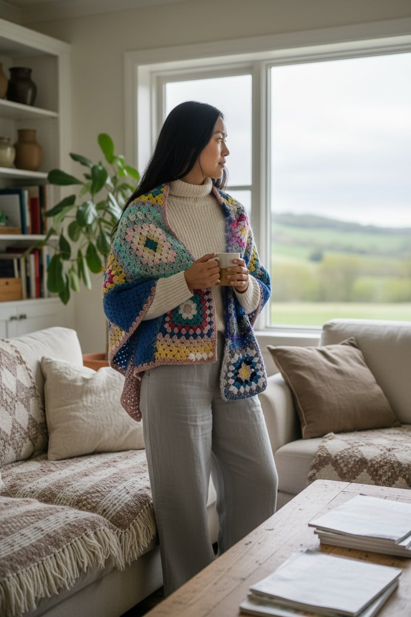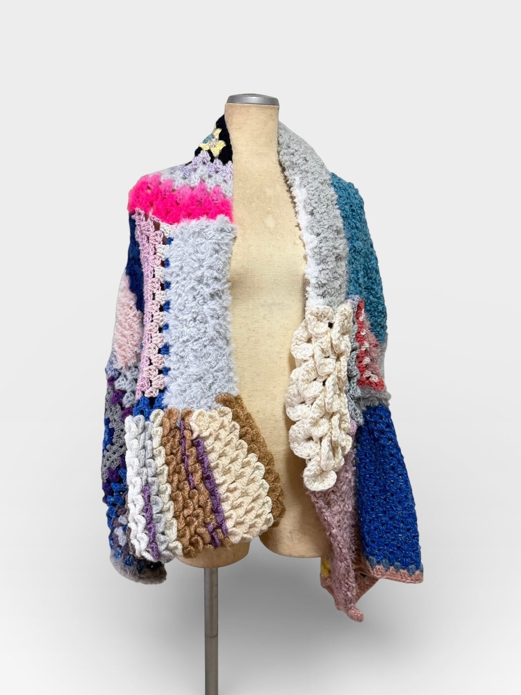 大小さまざまなサイズのグラニースクエアモチーフを繋ぎ合わせた大判のブランケットです