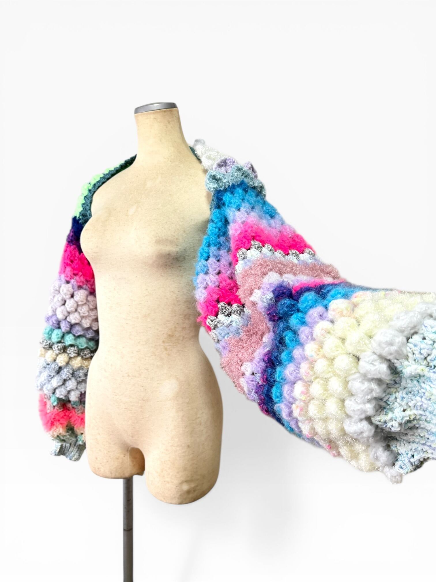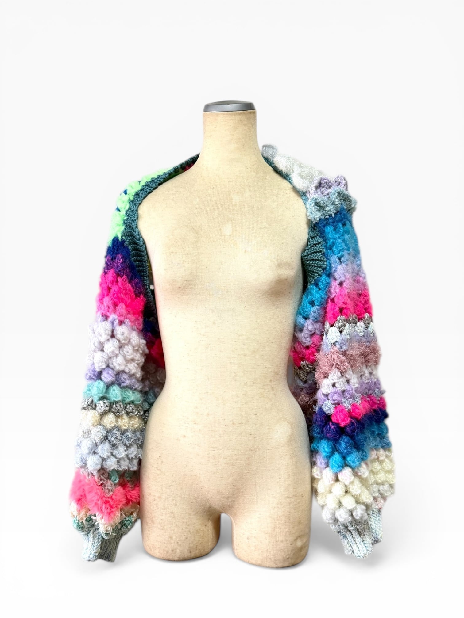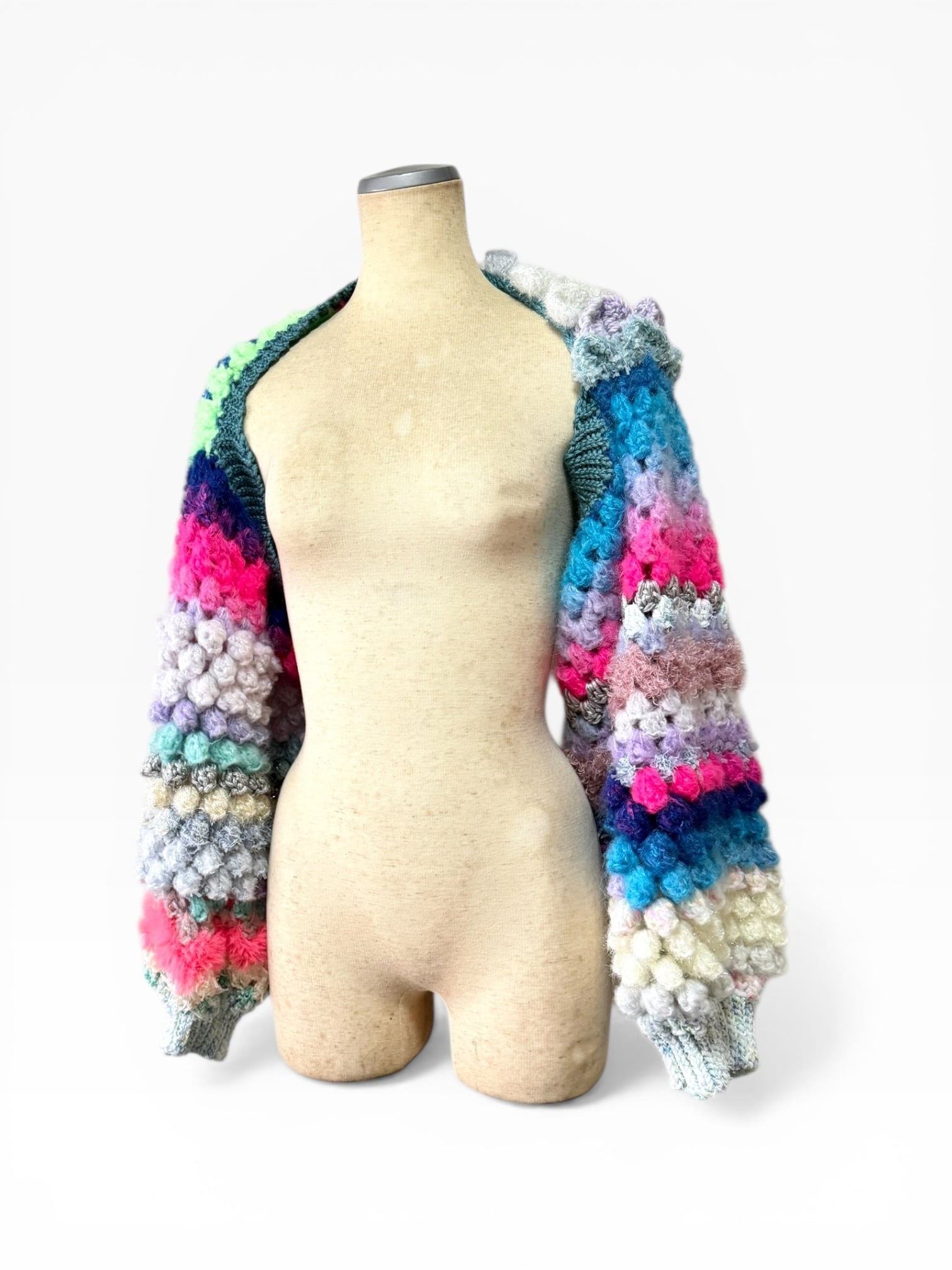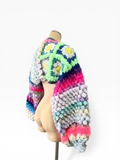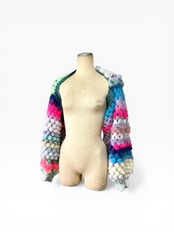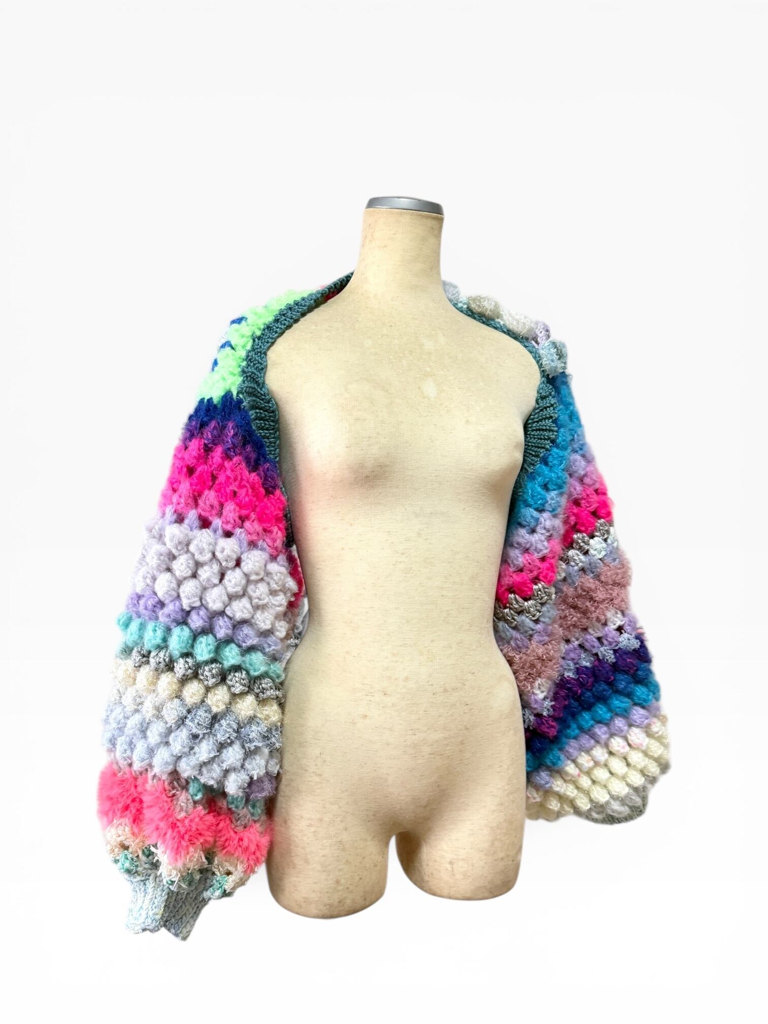 A short, hand-knitted cardigan with distinctive popcorn sleeves. 【袖】ぽこぽことカラフルときらきらうろこの袖だけカーディガン