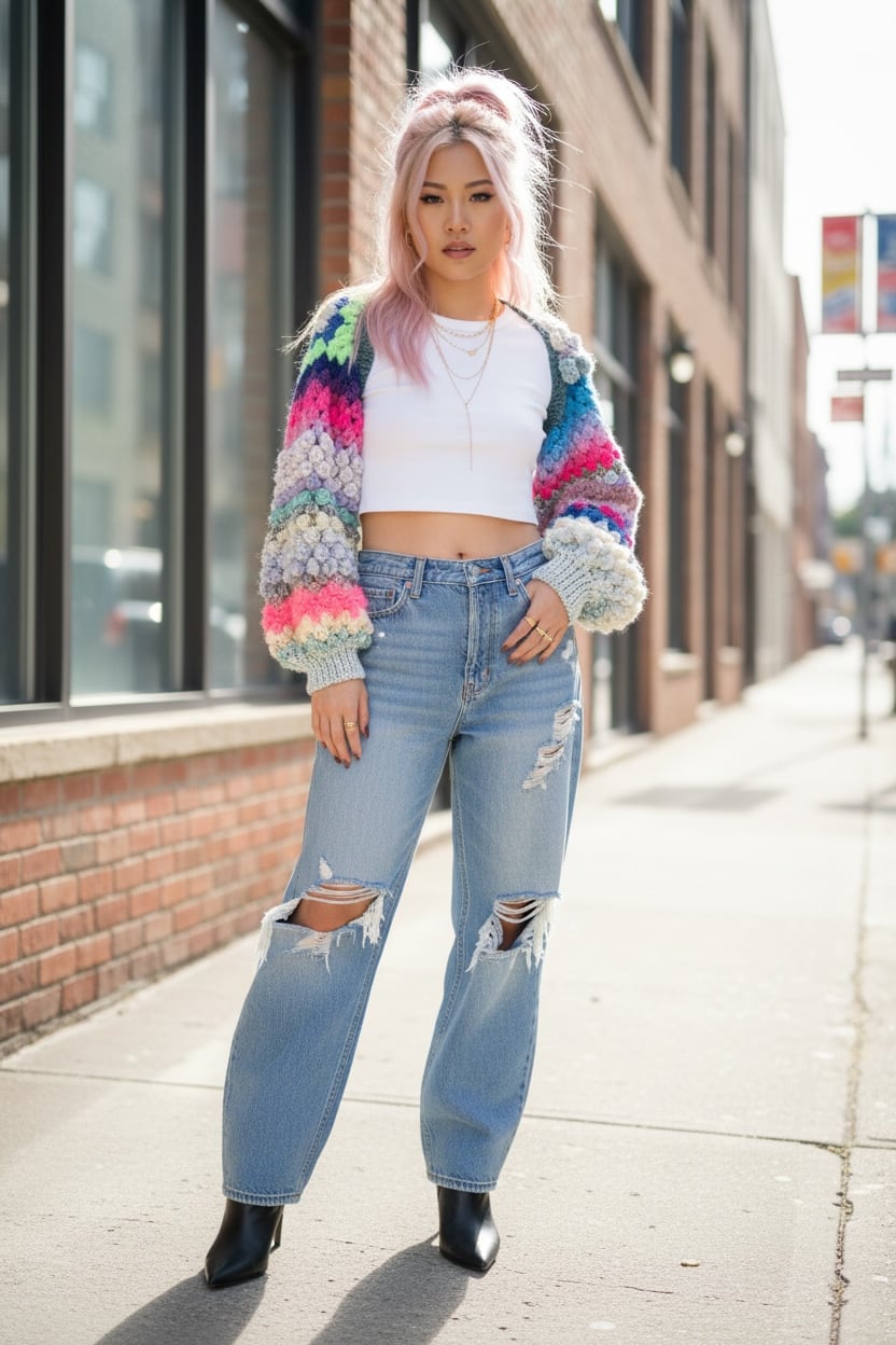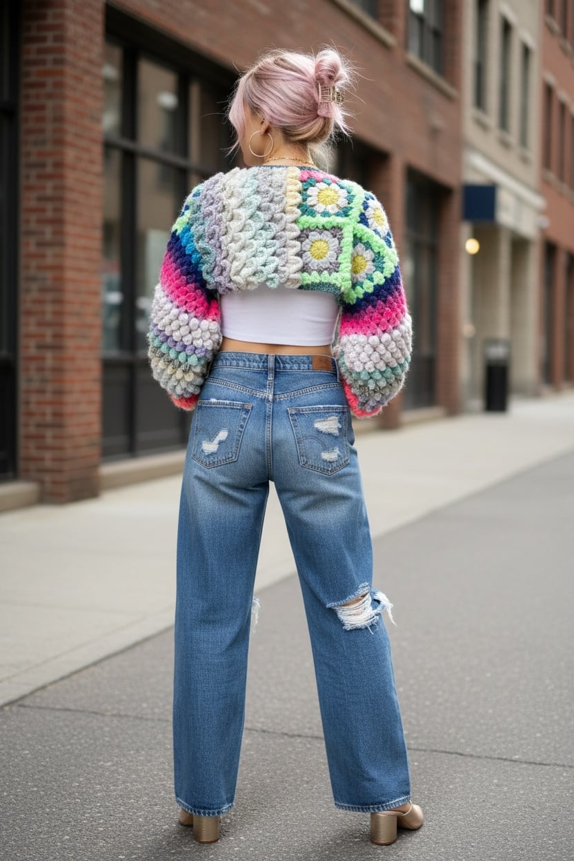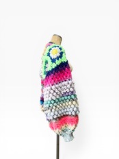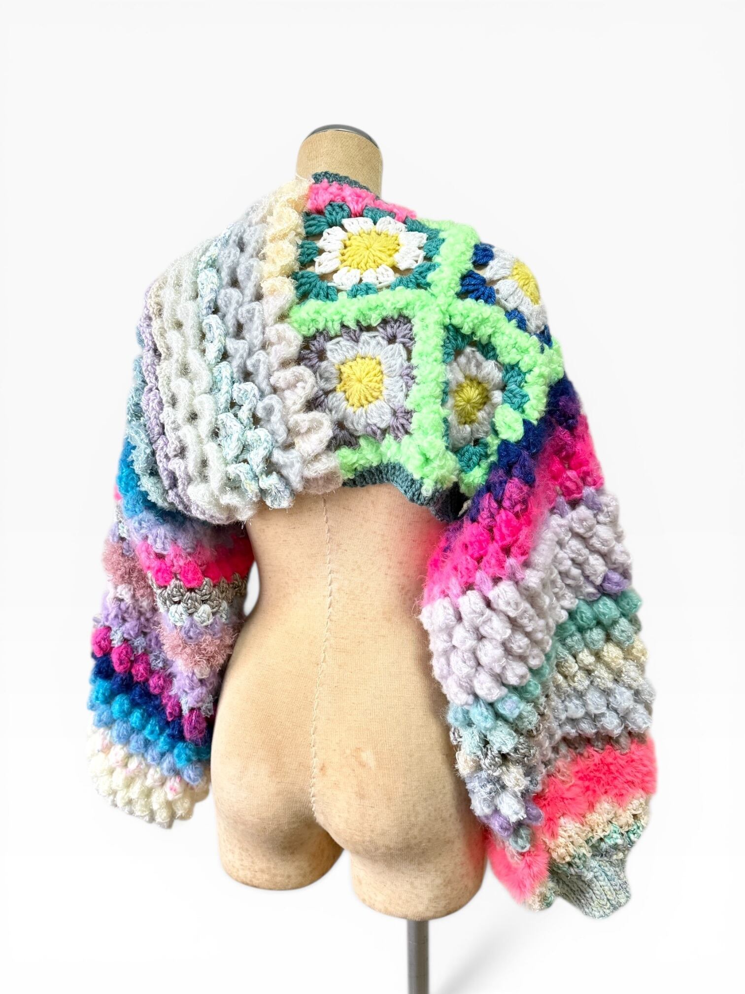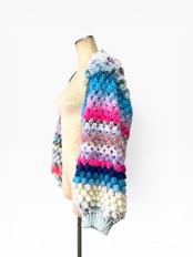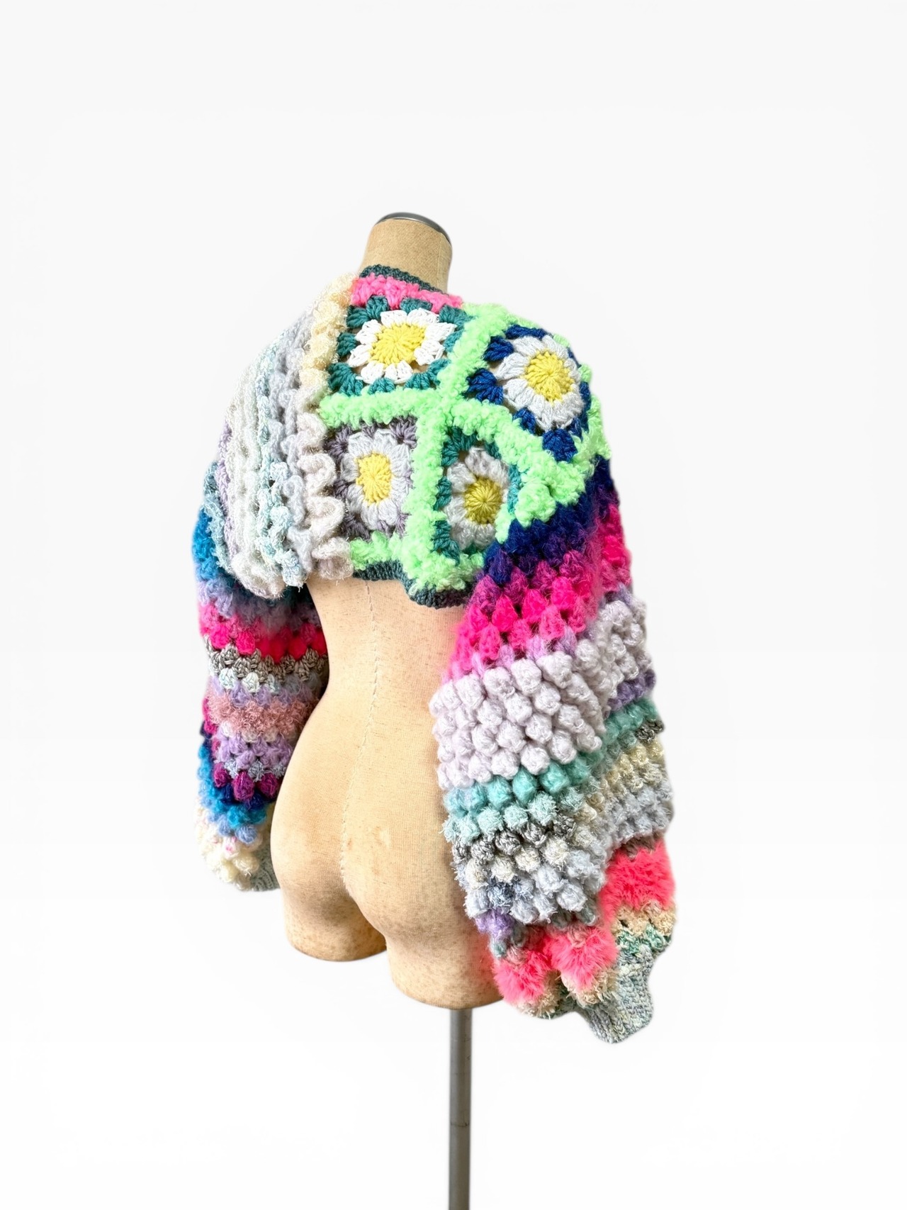 A short, hand-knitted cardigan with distinctive popcorn sleeves. 【袖】ぽこぽことカラフルときらきらうろこの袖だけカーディガン
