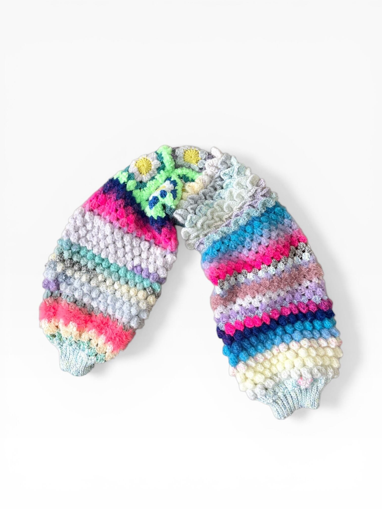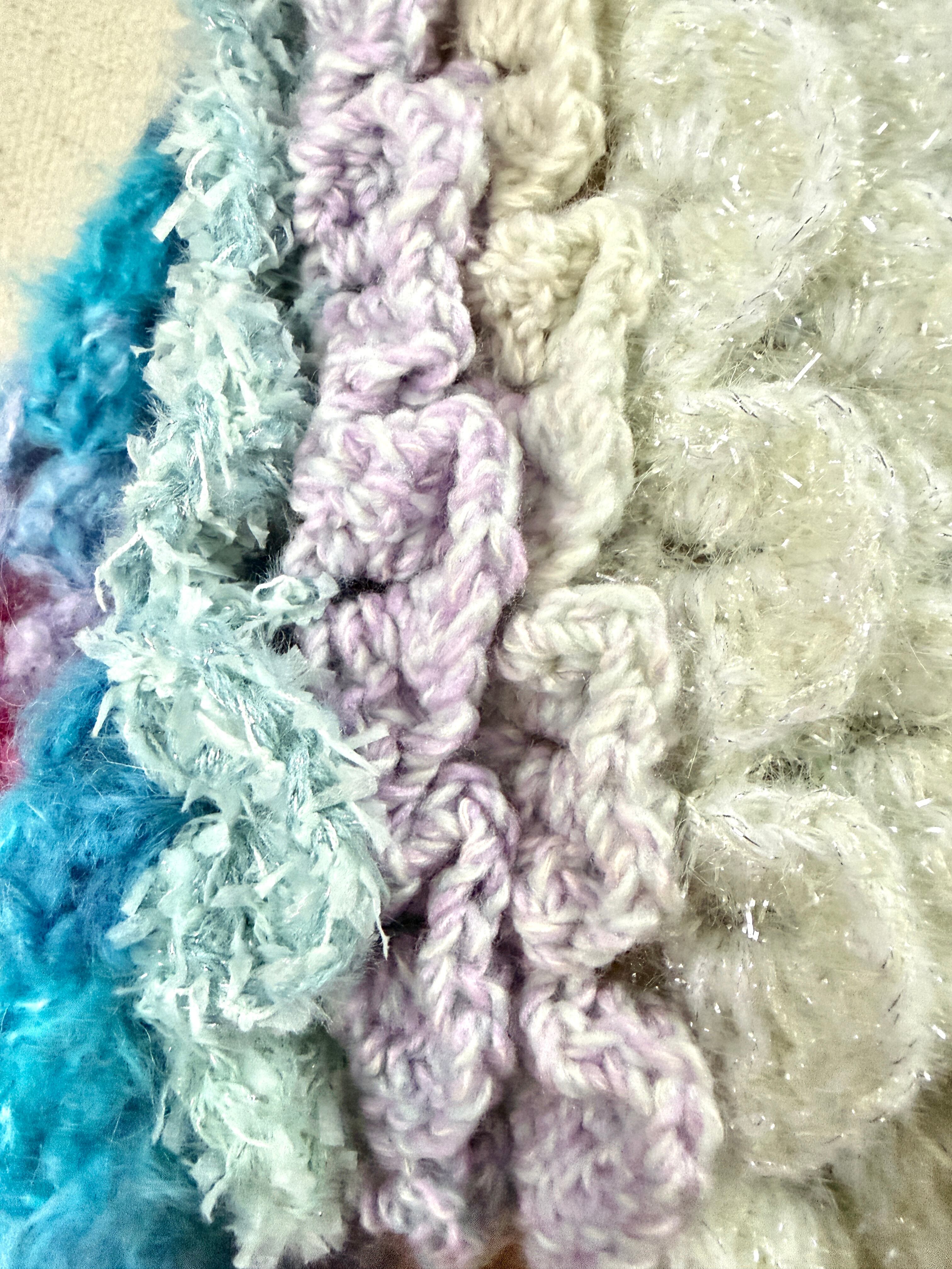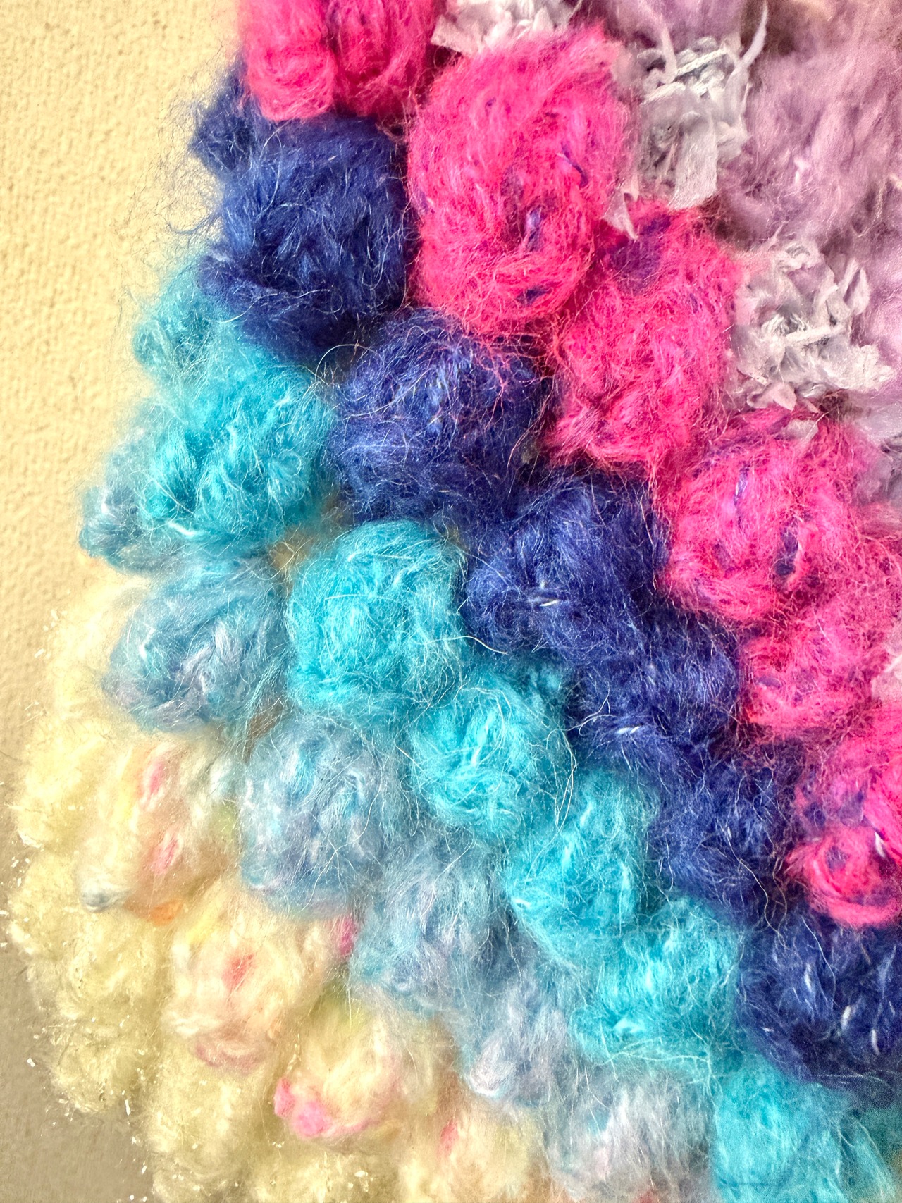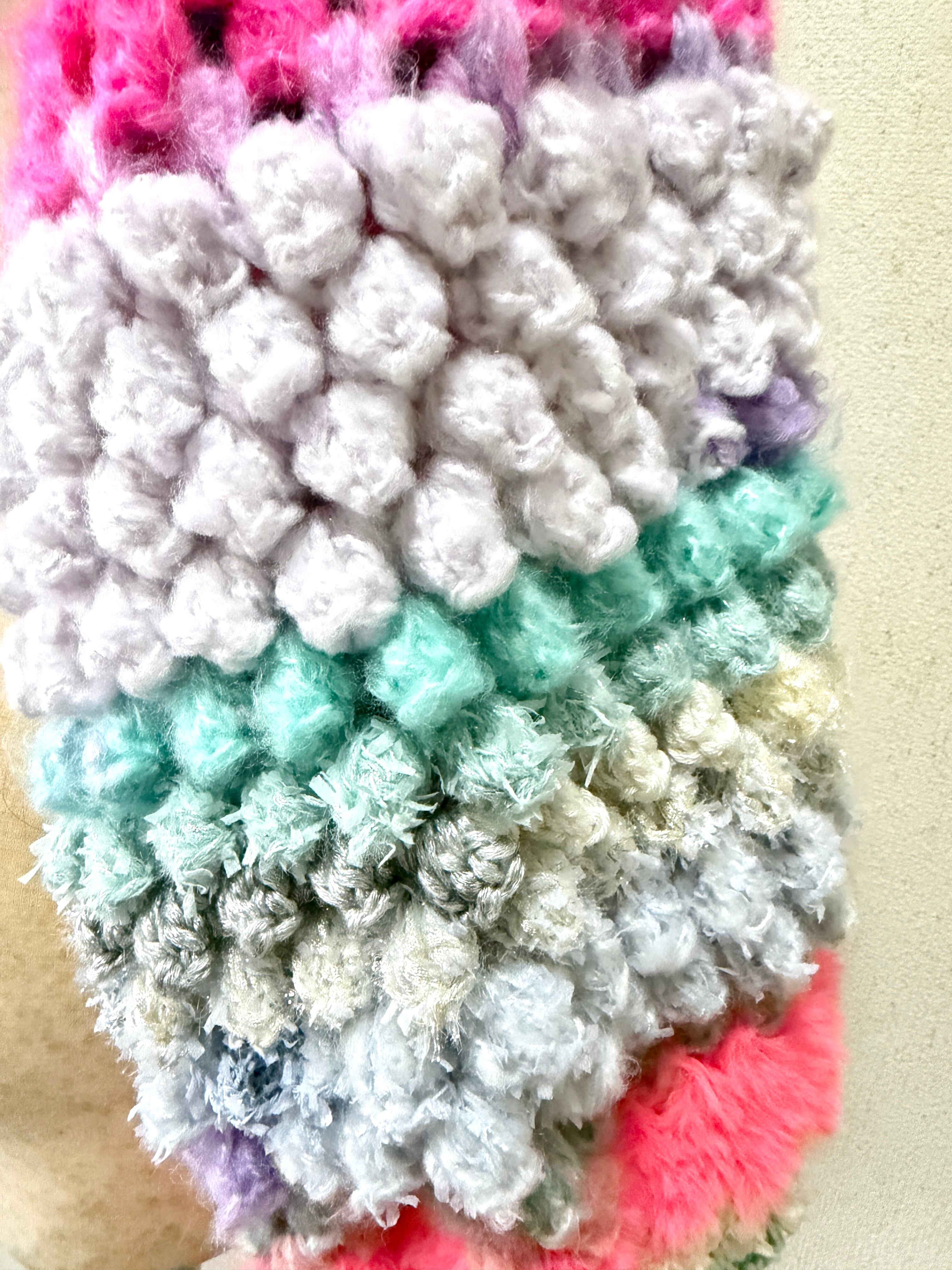 今回は立体的なぽこぽこをカラフルかつキラキラに編んでみました