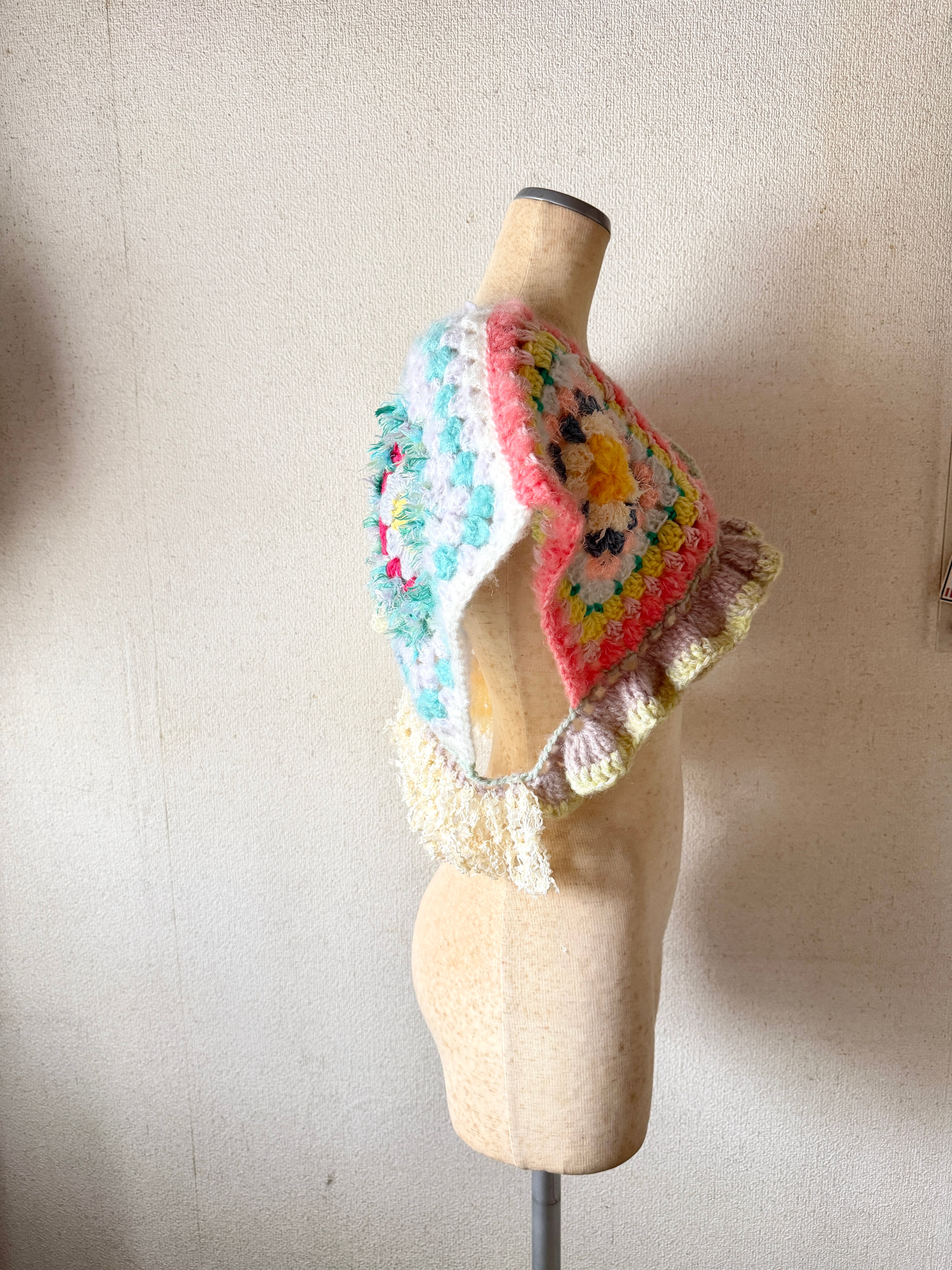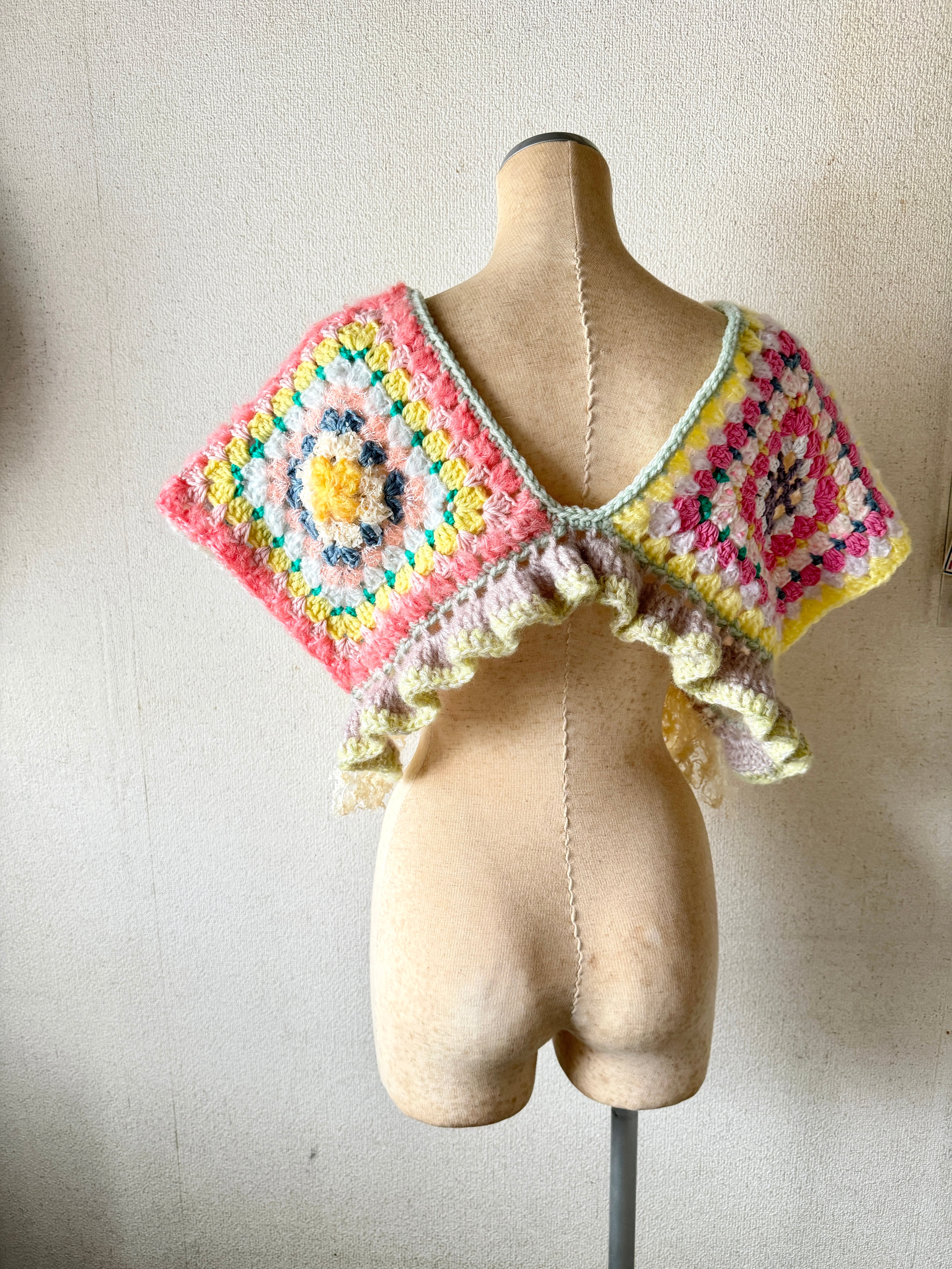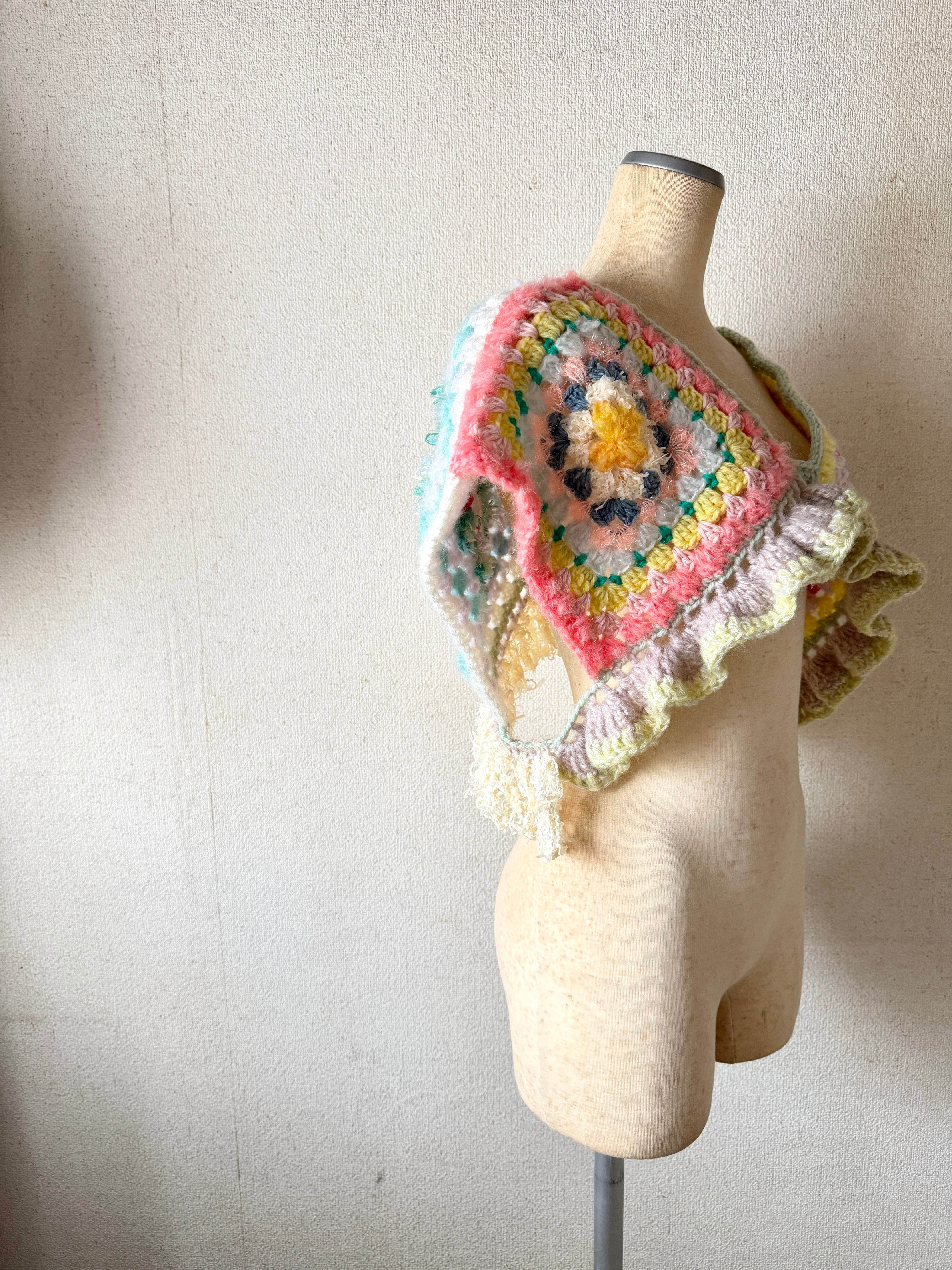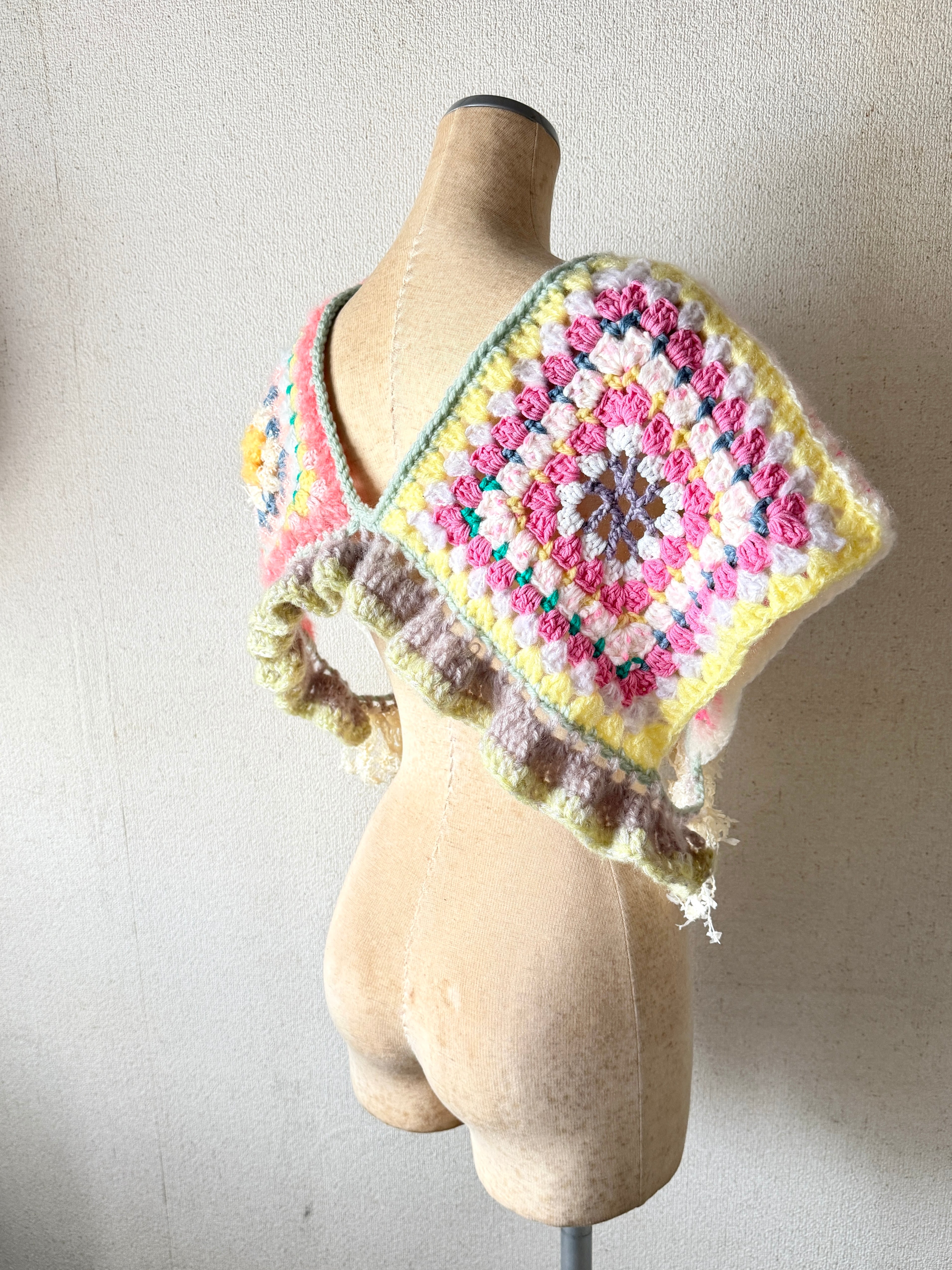A short crochet vest made with colorful granny square motifs. バタフライグラニー クロシェベスト レイヤードアイテム