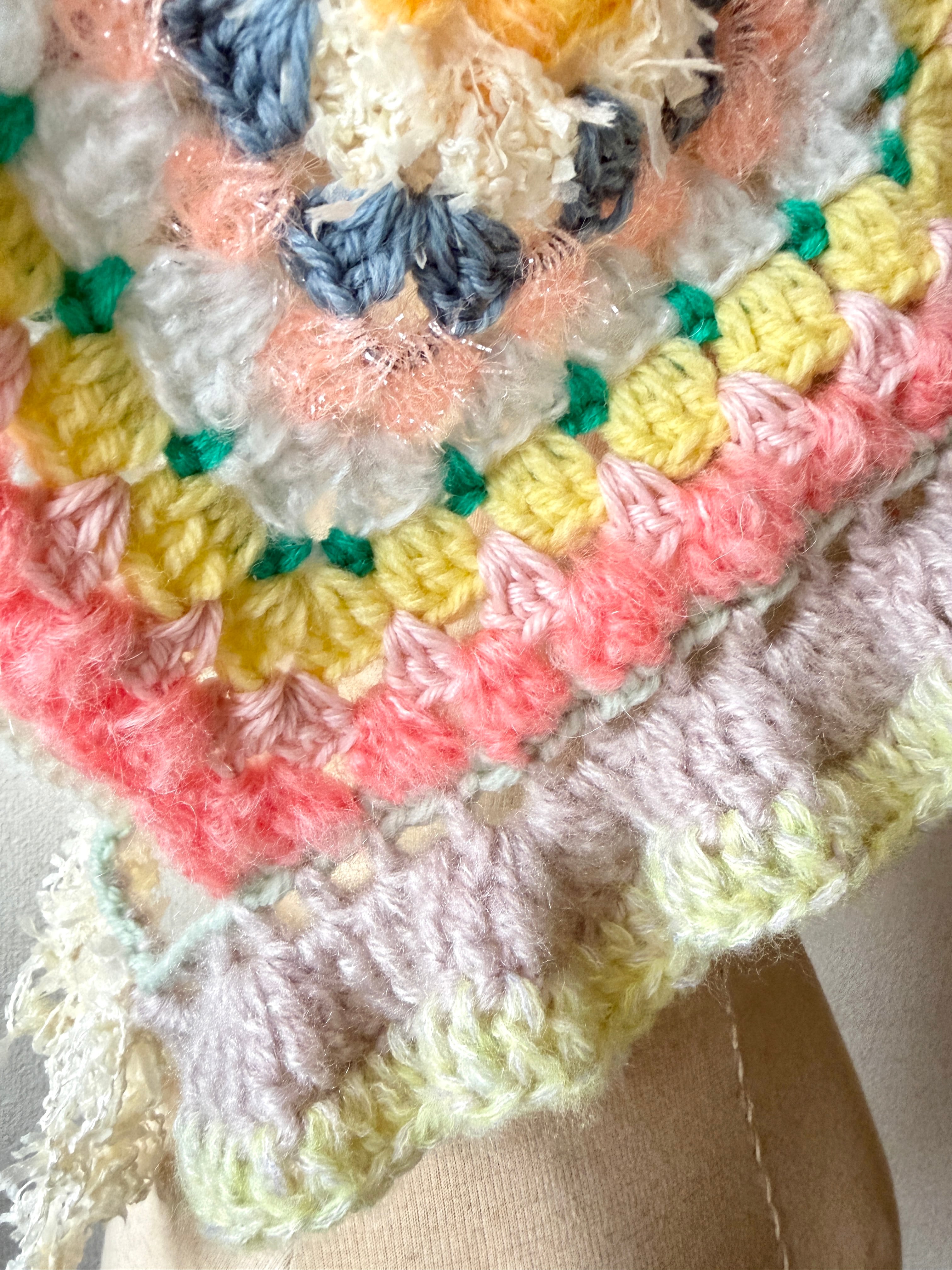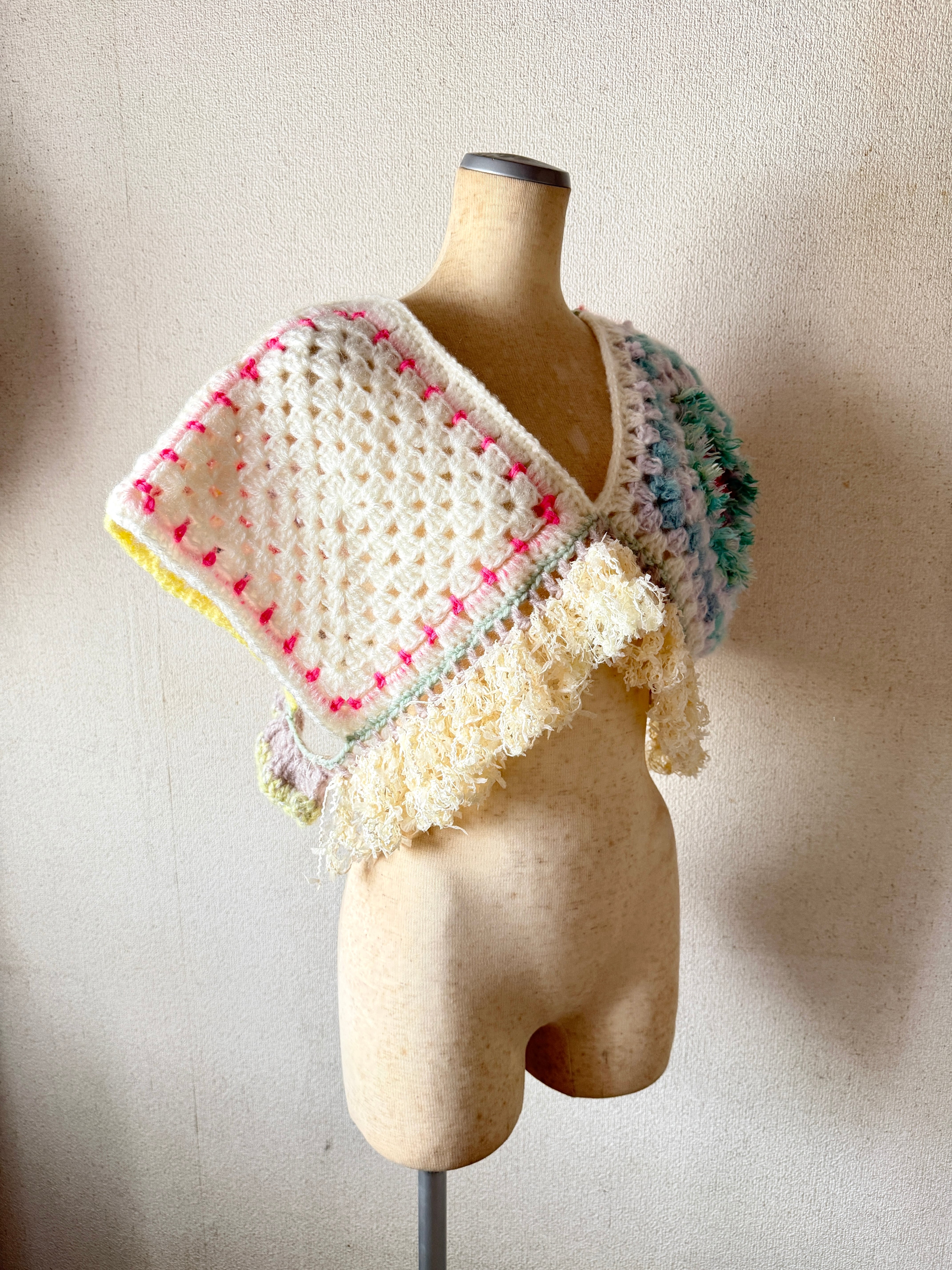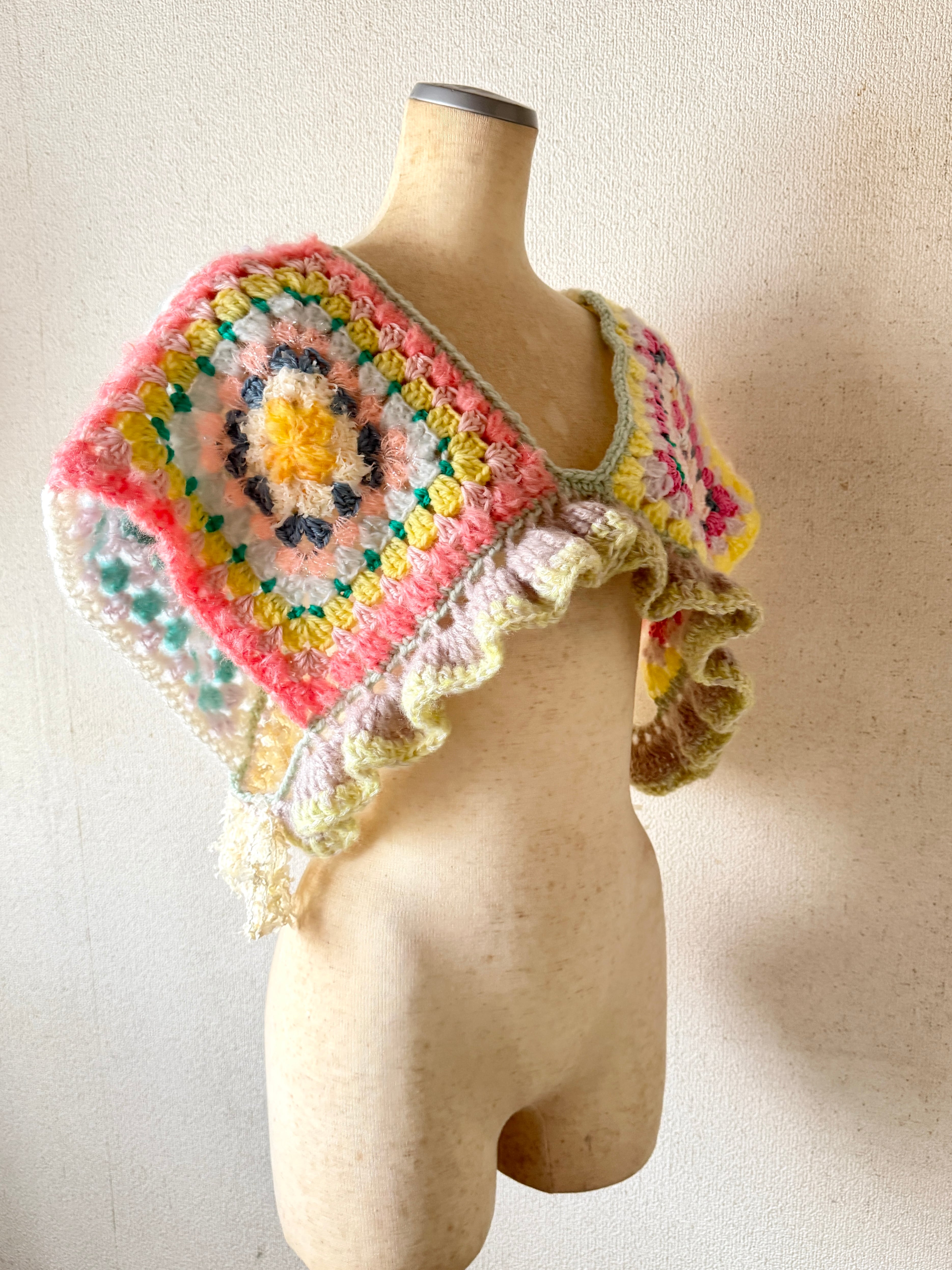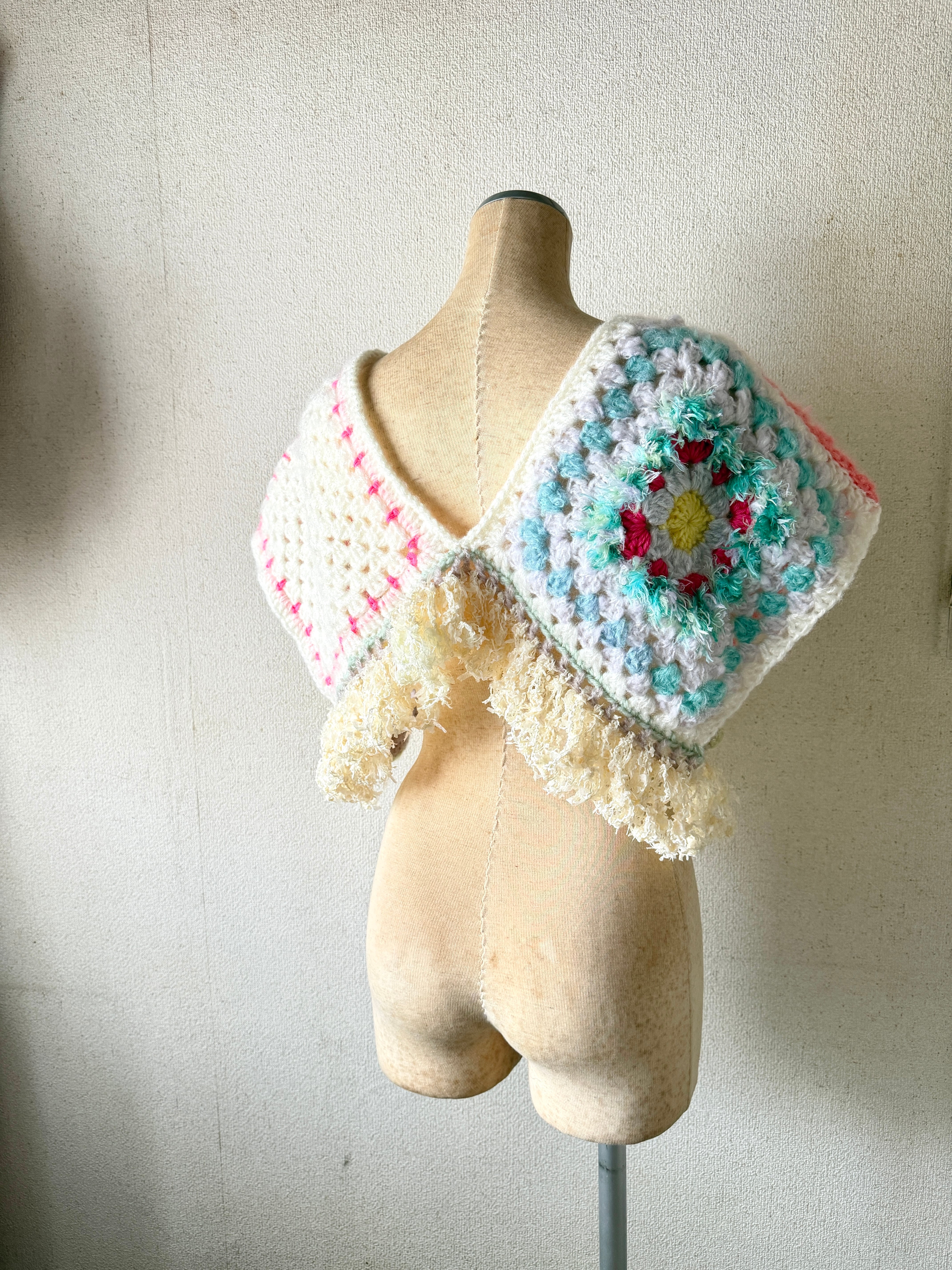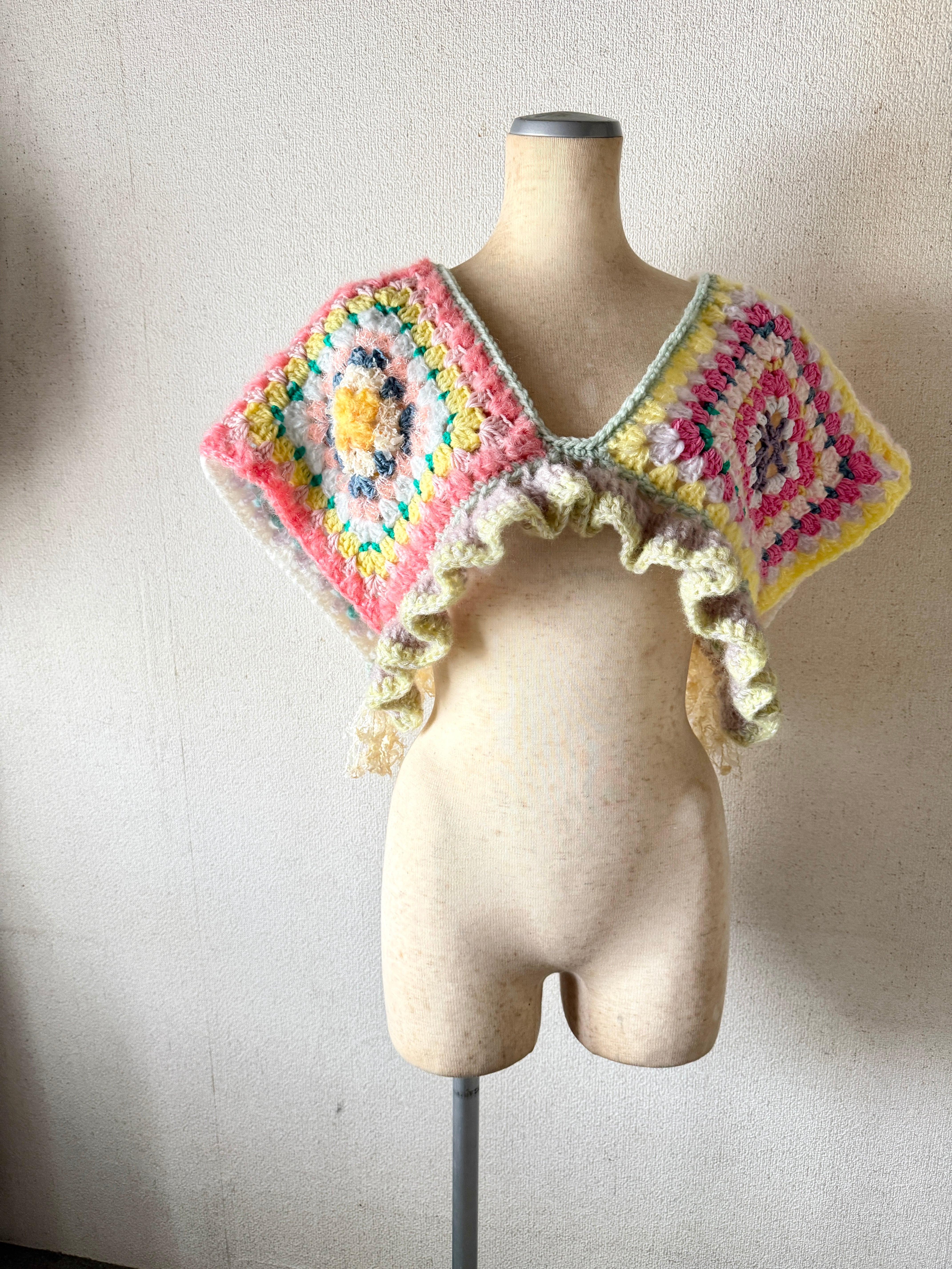 A short crochet vest made with colorful granny square motifs. バタフライグラニー クロシェベスト レイヤードアイテム