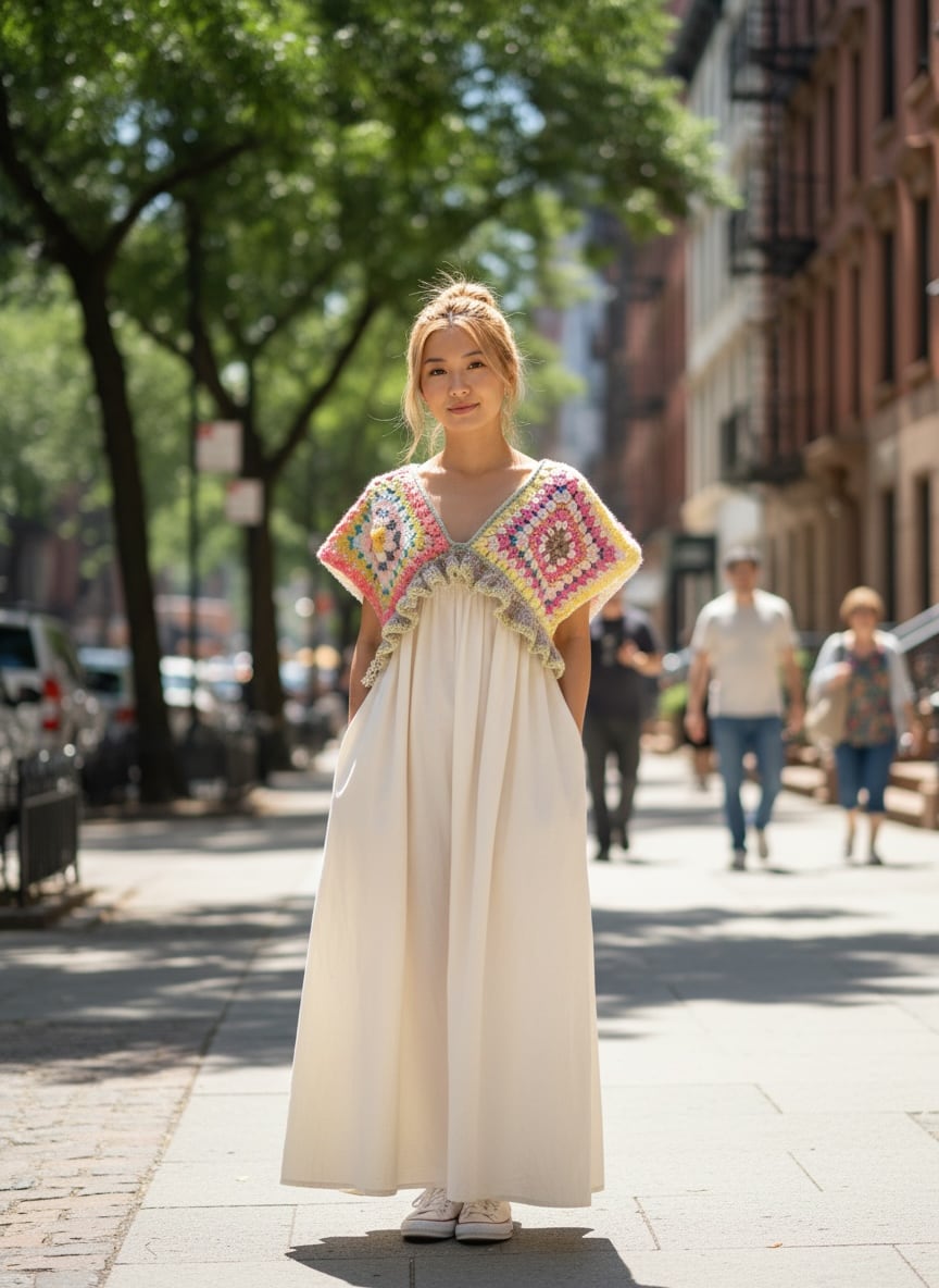 大きめのグラニースクエアモチーフを繋いだら、カラフルな蝶々のようなシルエット
