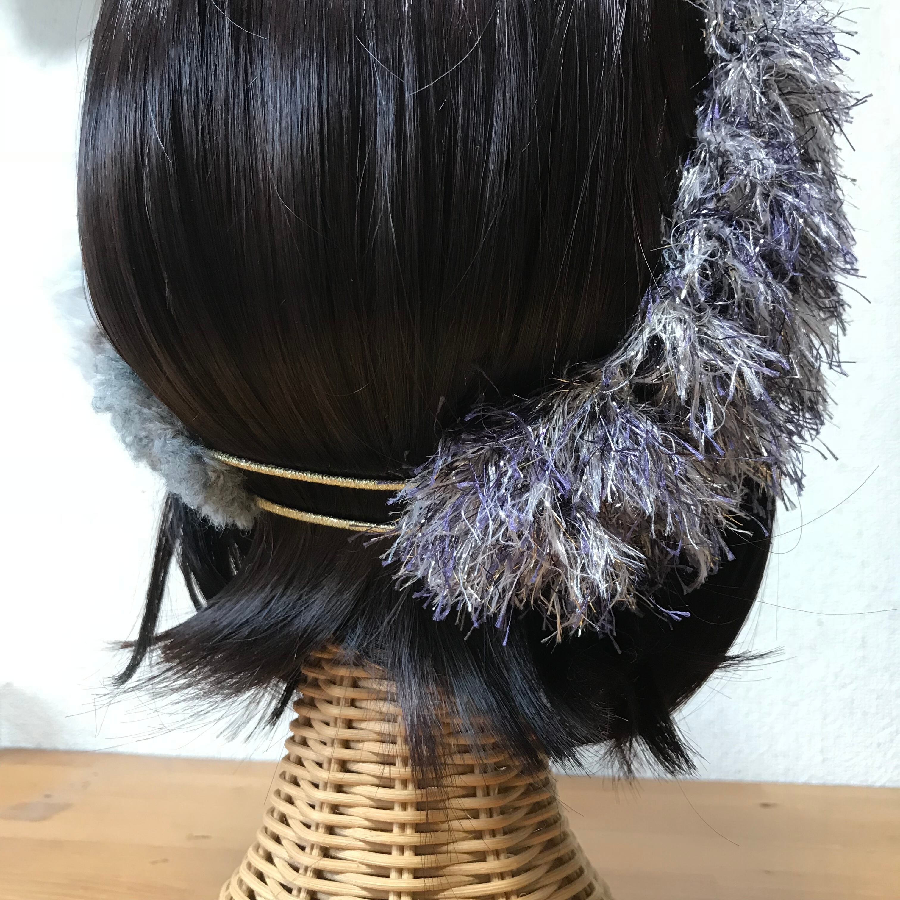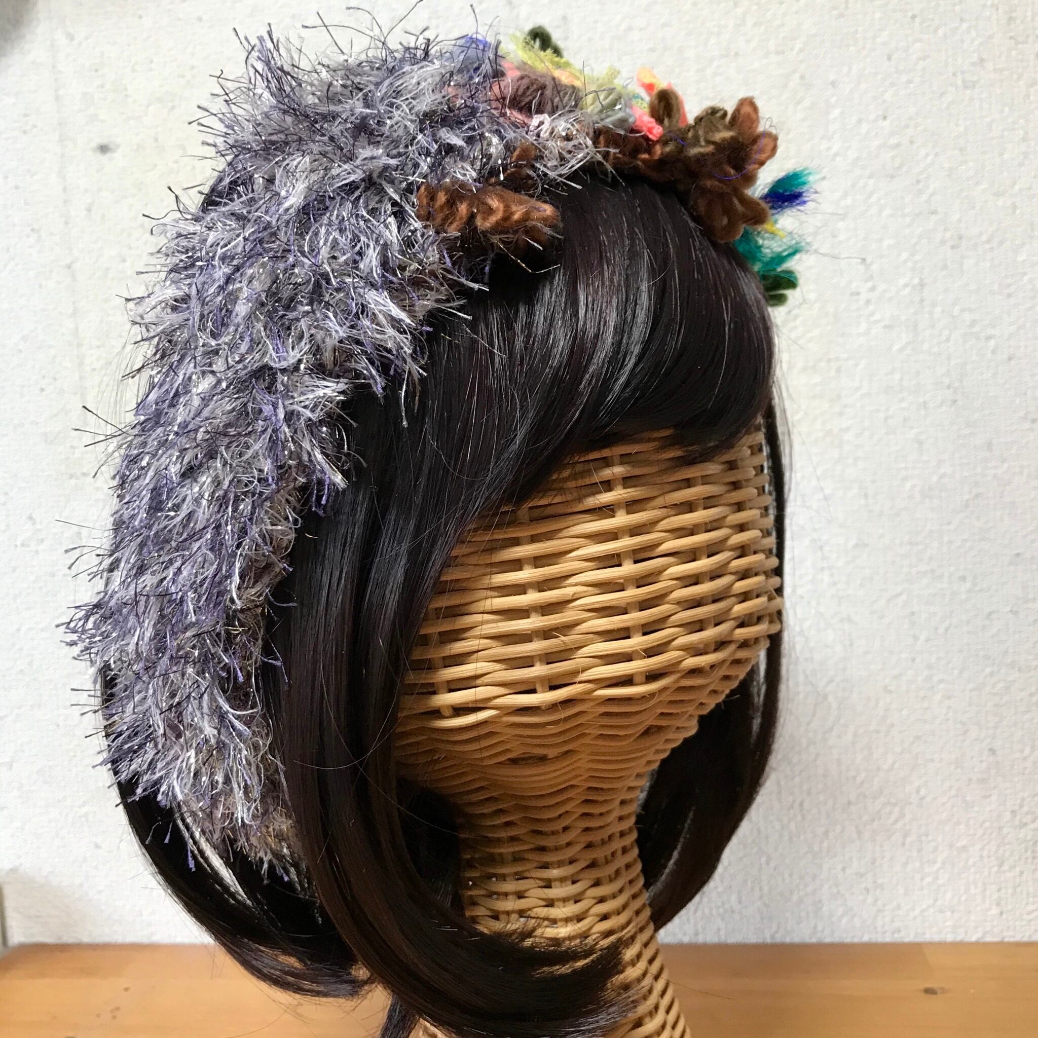 ふわふわのフェイクファーに艶のあるシャギーヤーン 立体感のあるうろこ模様(クロコダイルステッチと言います)もあちこちに配置してÖRÜGらしい編みコラージュのニットターバン が出来ました