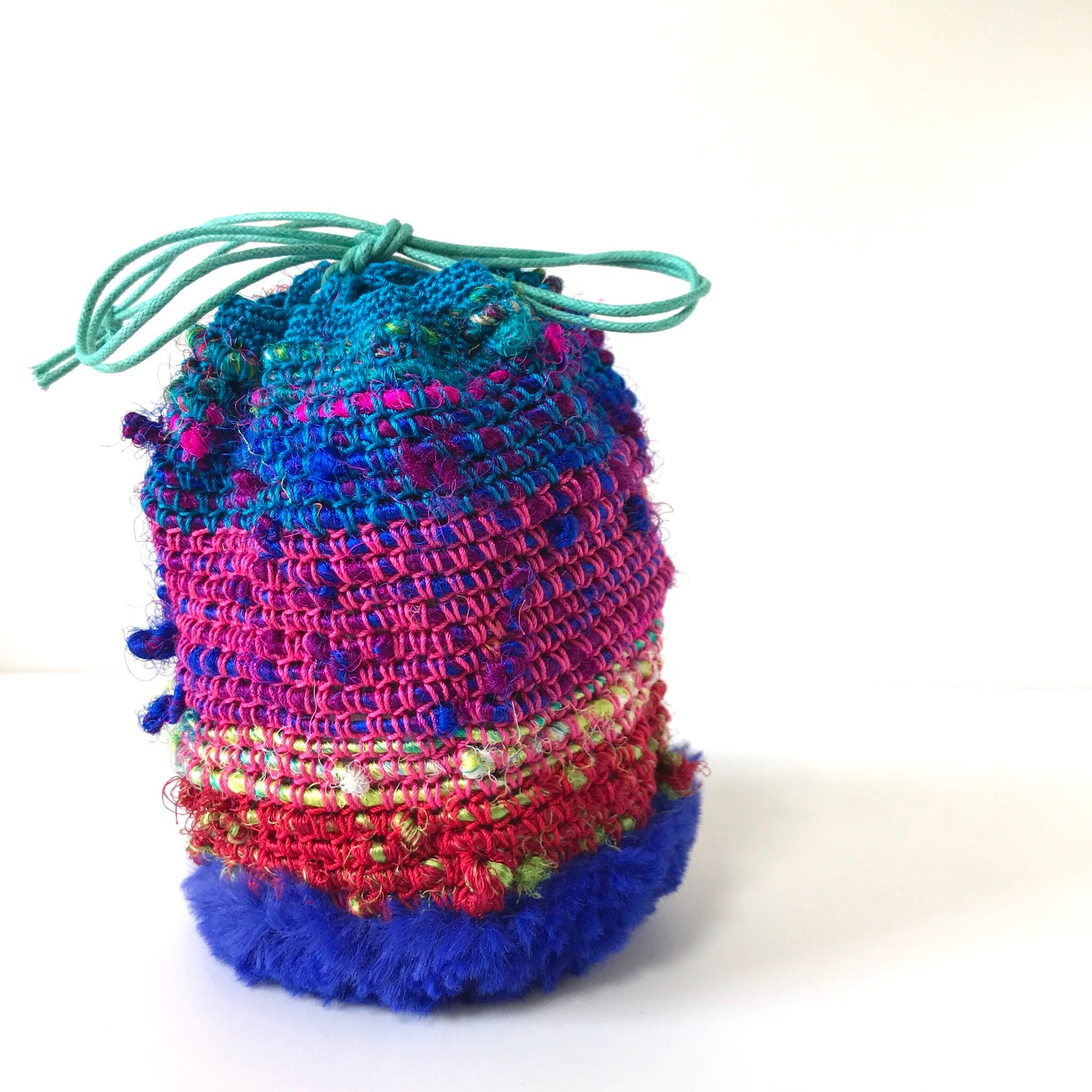 リサイクルシルクヤーンと クリアなフェイクファーで巾着を作りました
