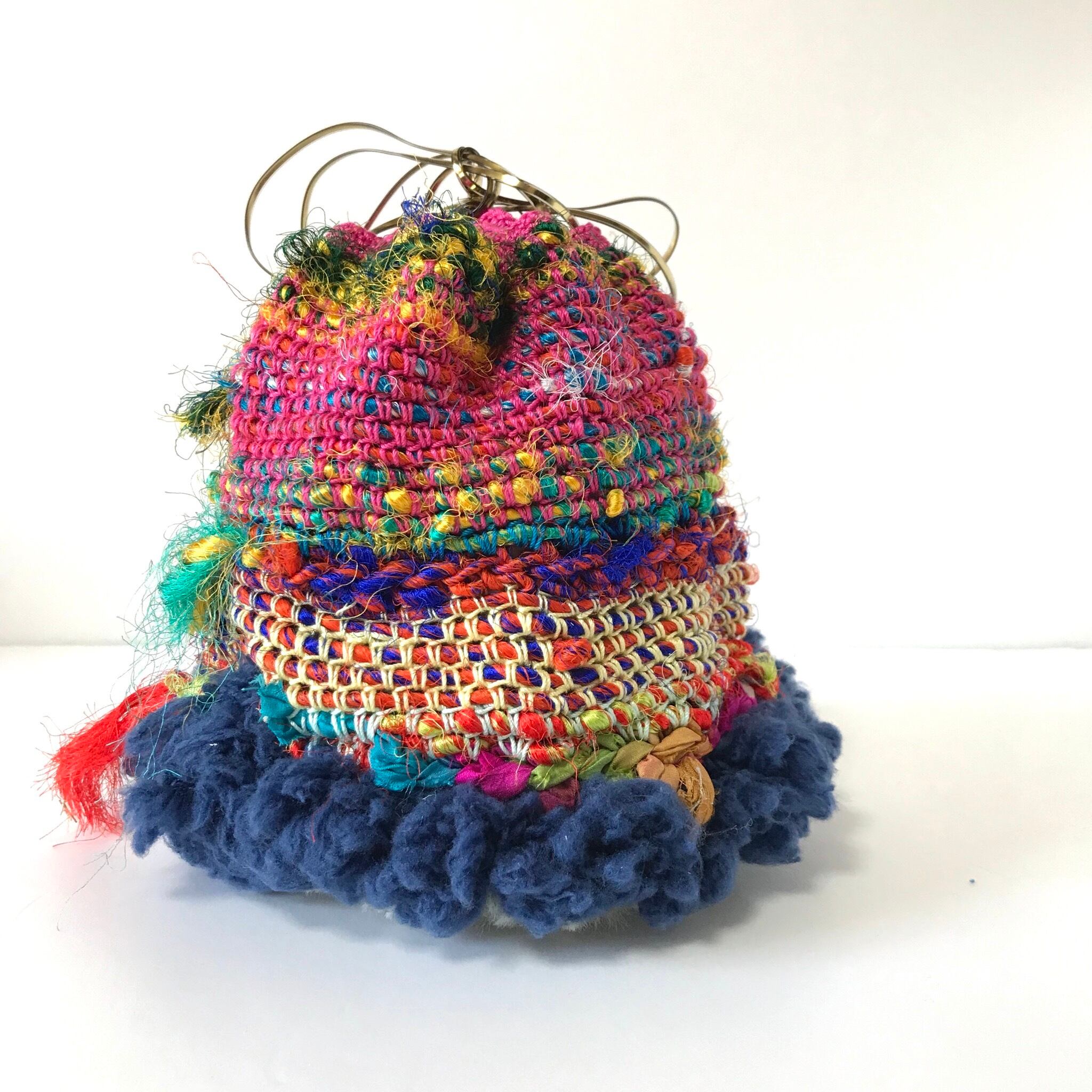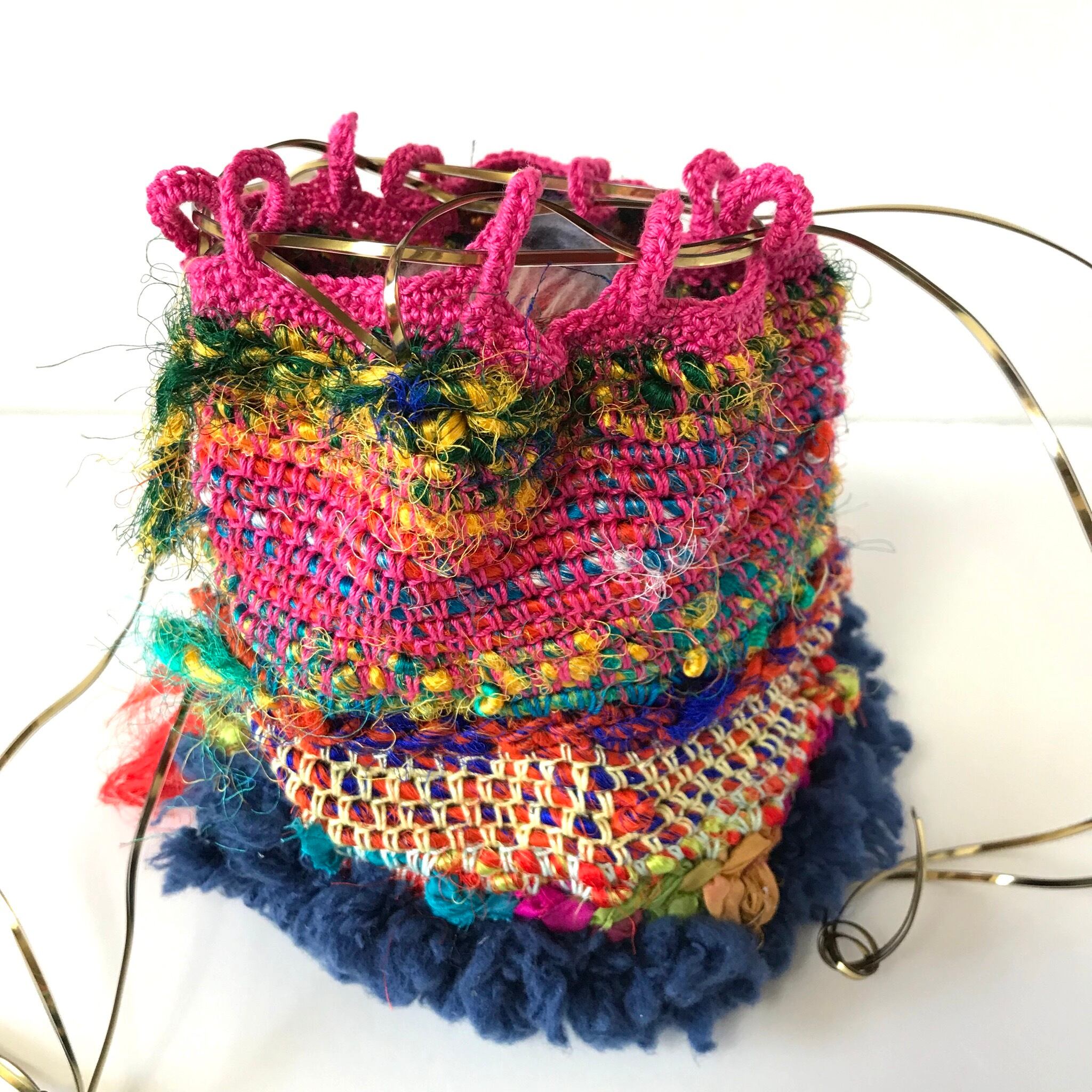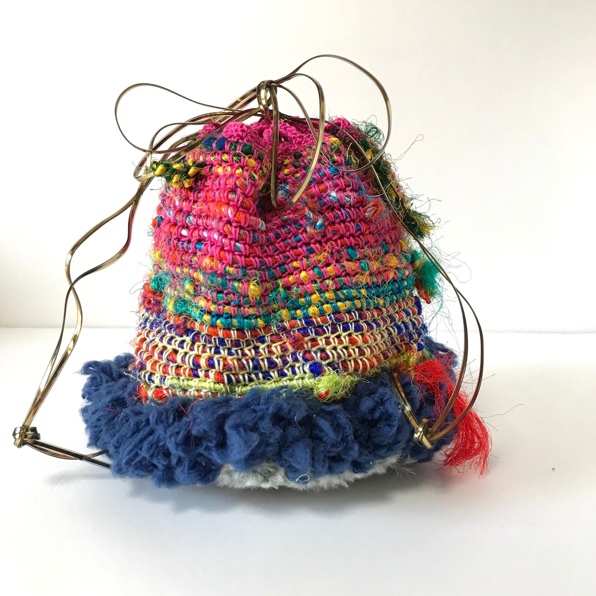 シルクヤーンもあみくるんだり、編んだり 360°変化に富んだ 巾着バッグに仕上がりました