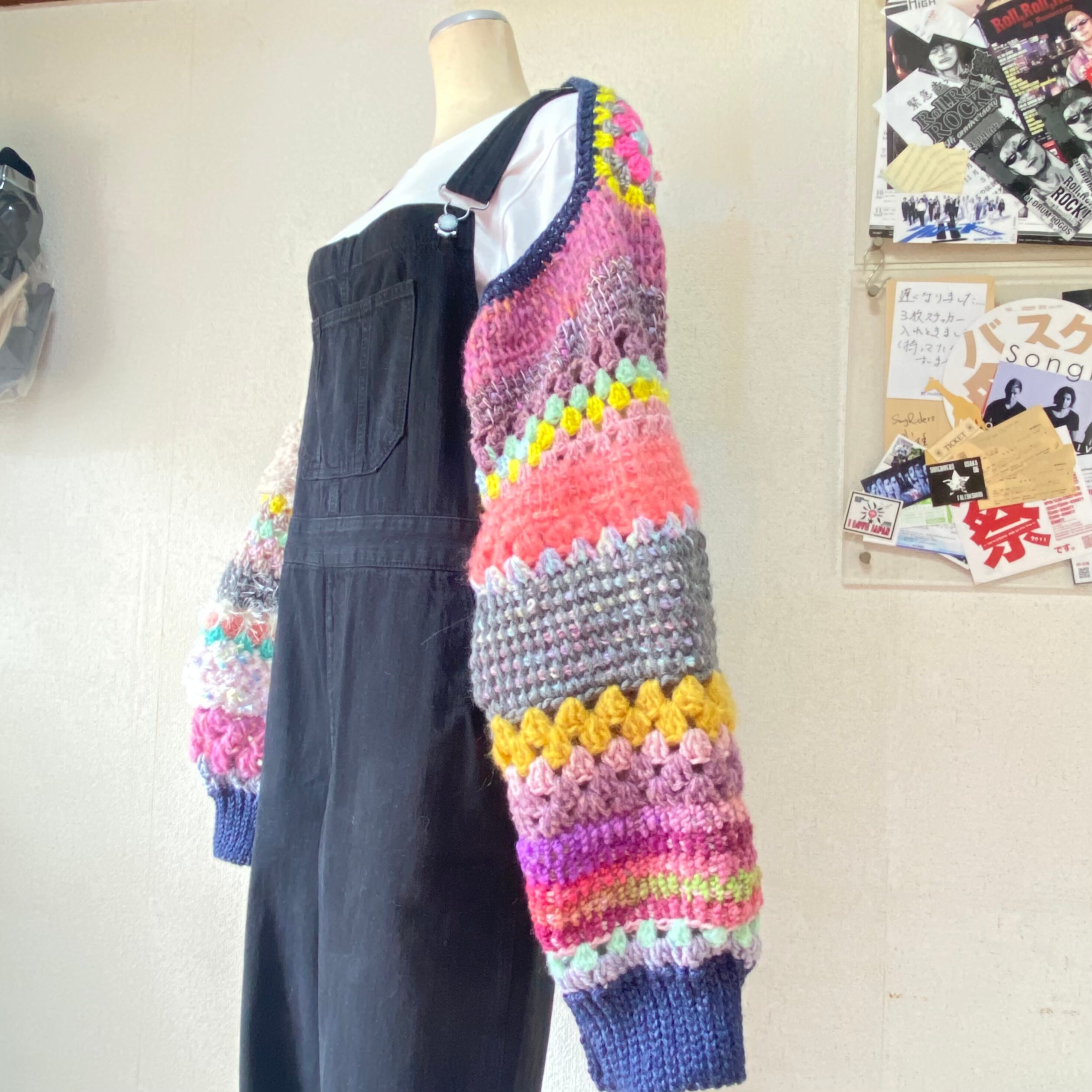 背中側には大小のカラフルグラニーを配して、それを繋ぐボリュームたっぷりの袖。