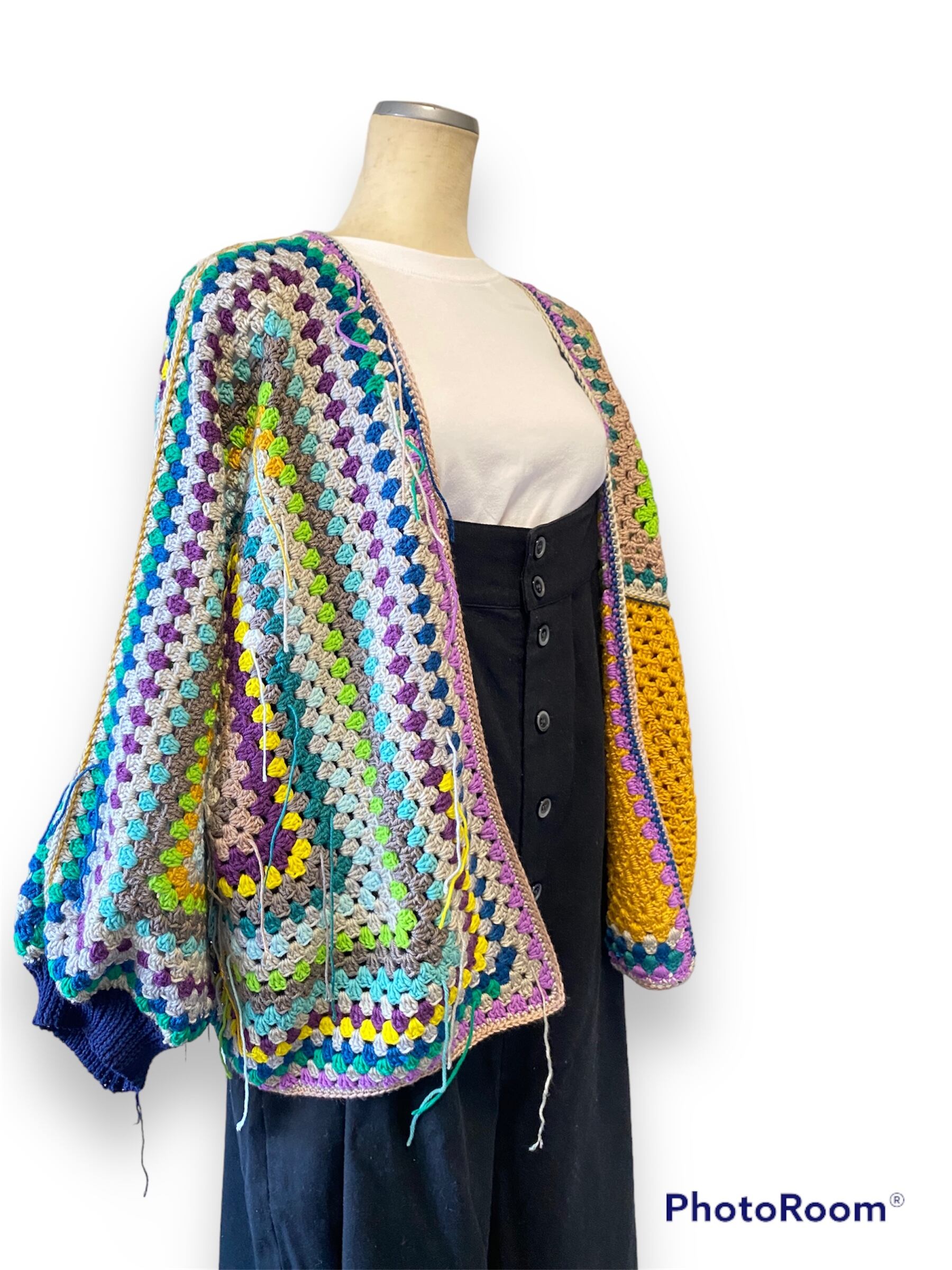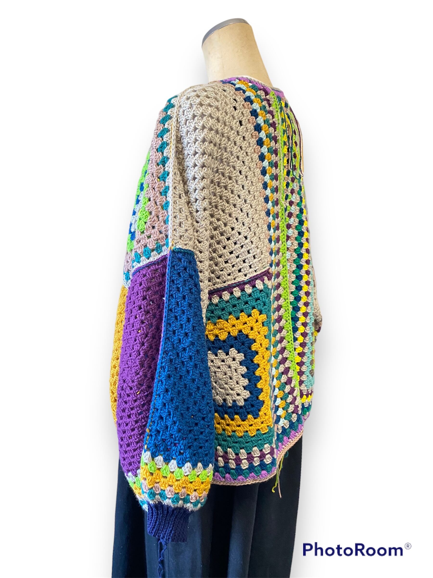 特に右見頃のヘキサゴングラニーは、後ろや横から見ても特徴的なデザインです