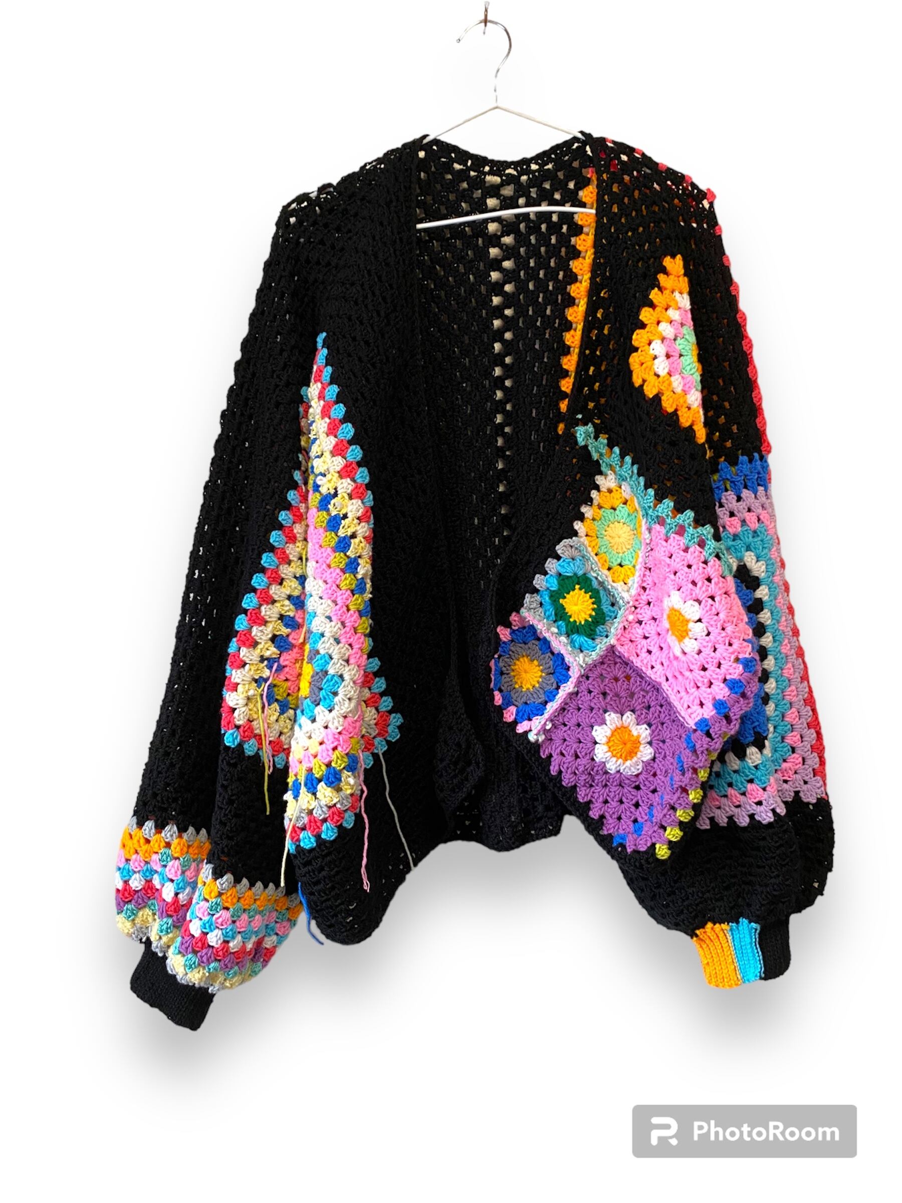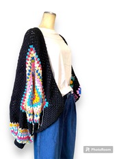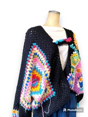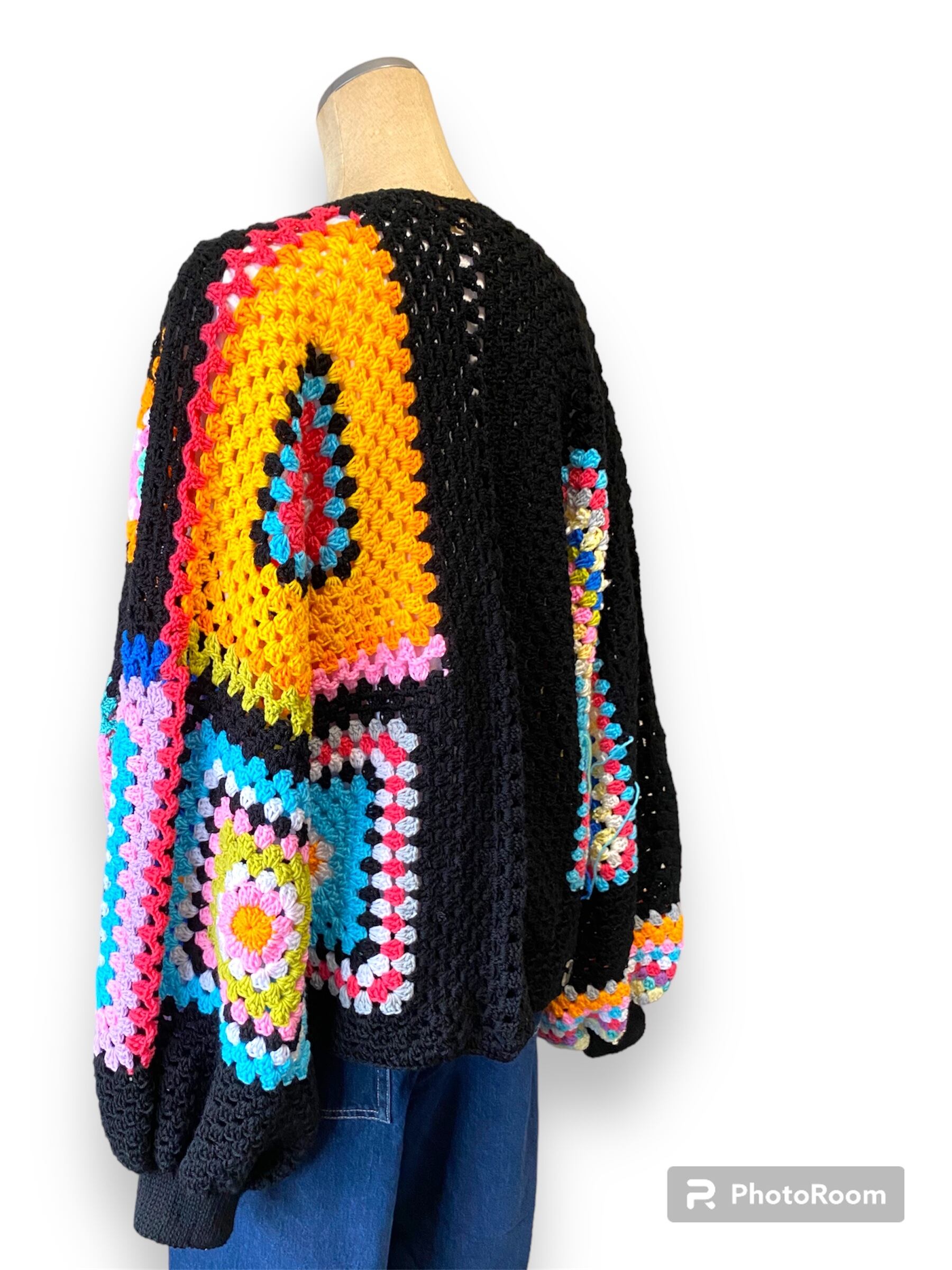 カラフルなヘキサゴングラニー柄がポップなゆるカーディガン。