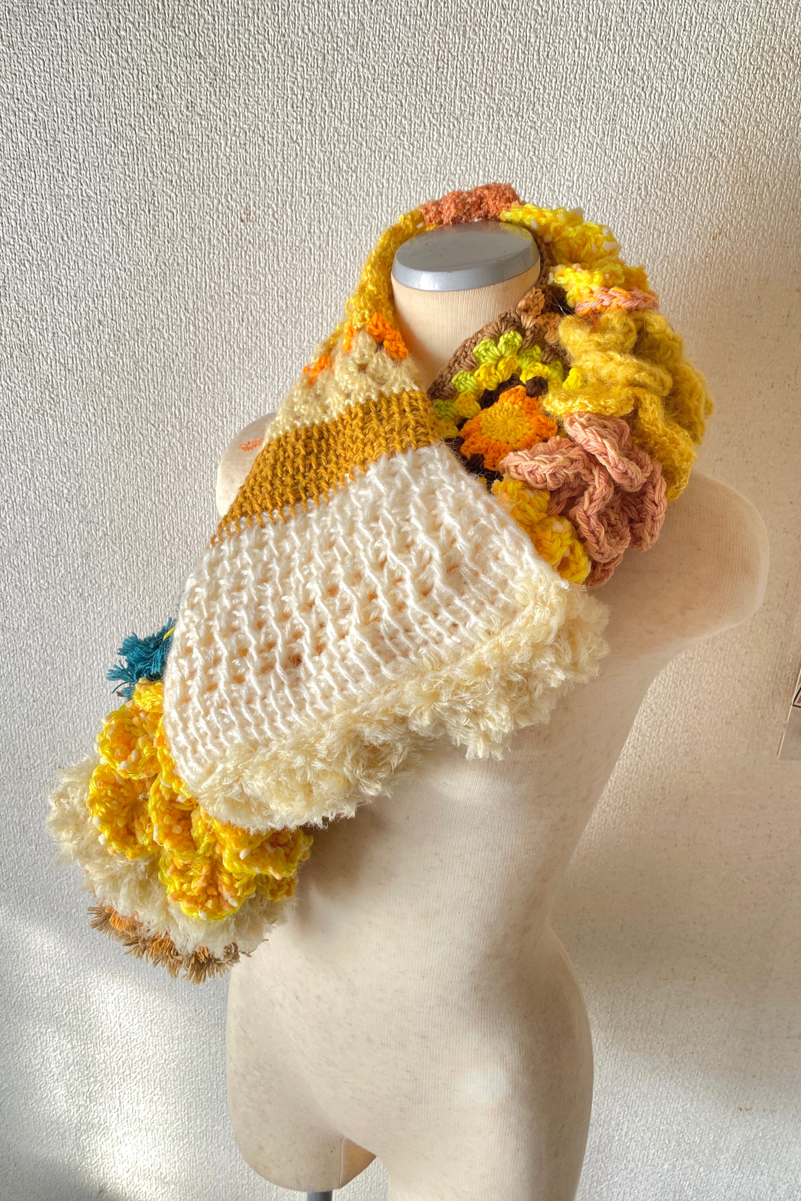A scarf with a three-dimensional scale motif and granny squares 黄色いうろこモチーフとグラデーション