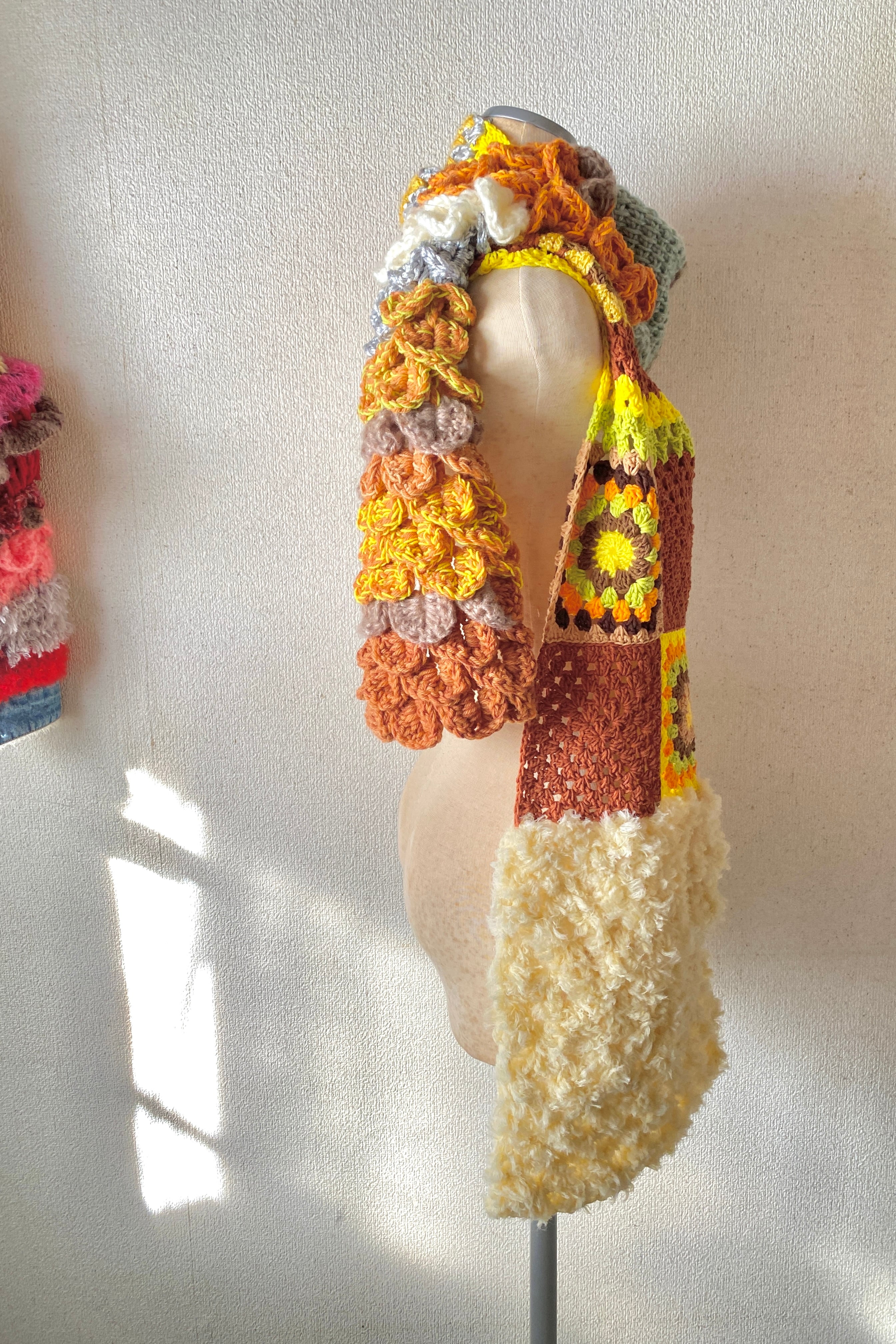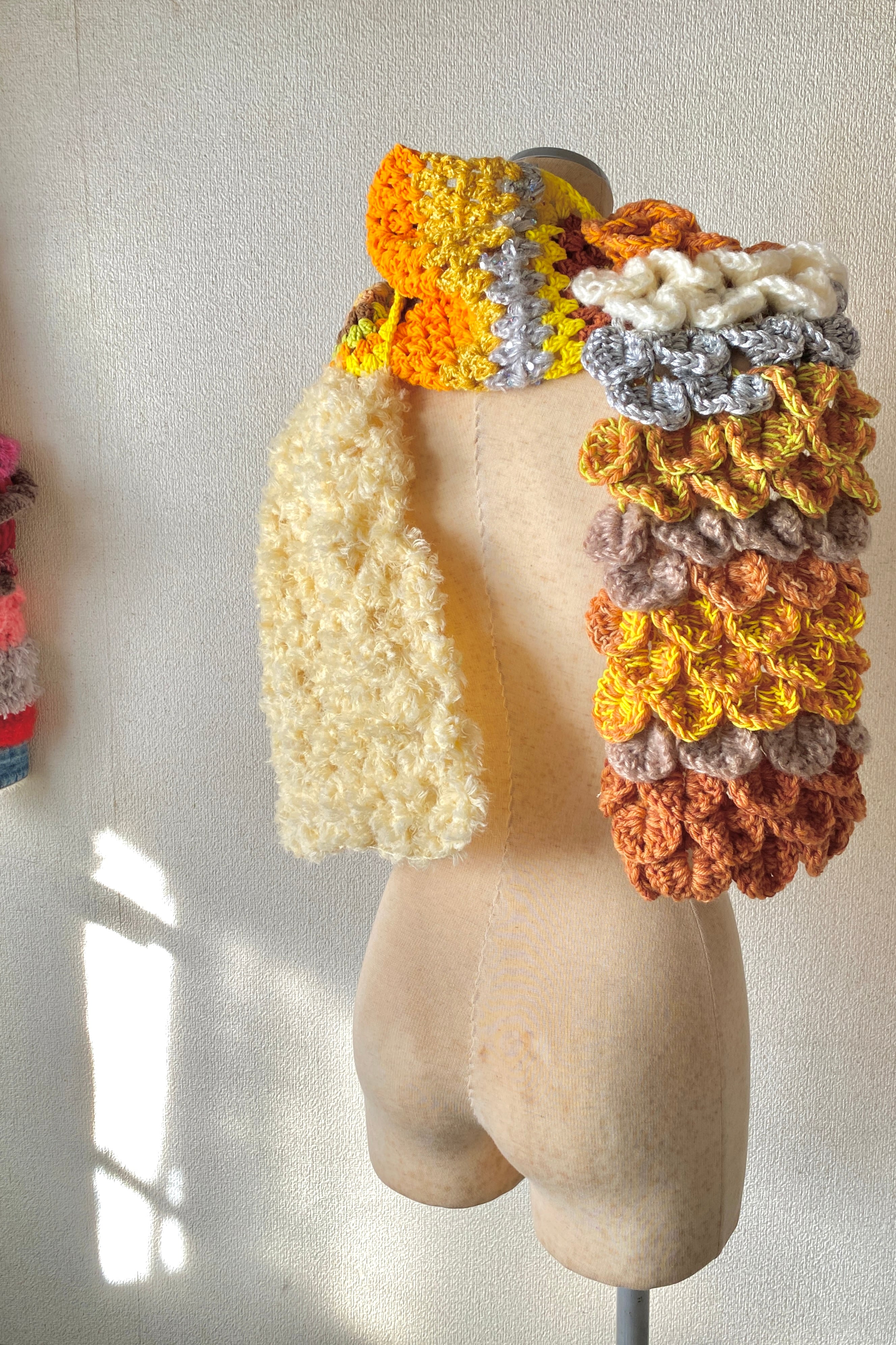 A scarf with a three-dimensional scale motif and granny squares グラニーモチーフと黄色いくるくるファーのマフラー